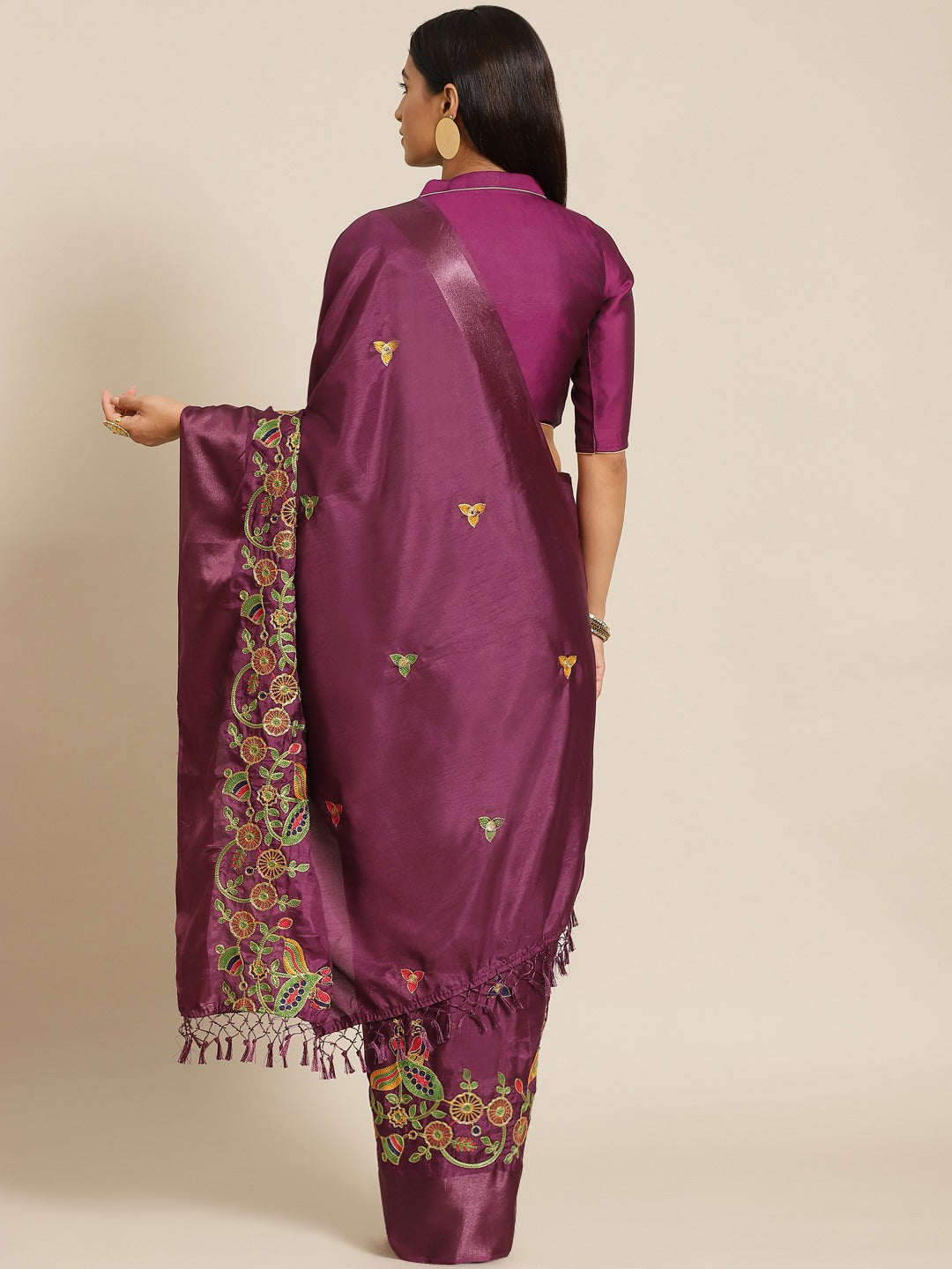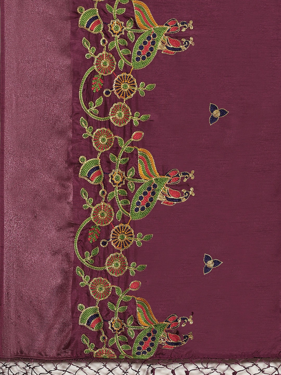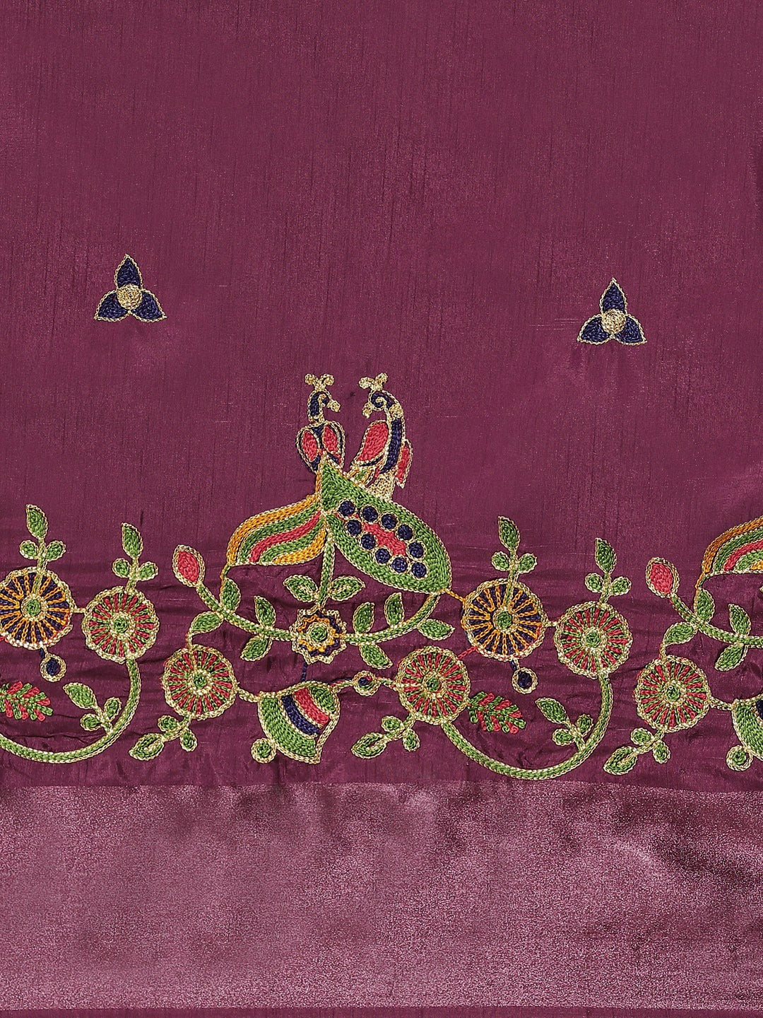 Burgundy Silk Multicolor Embroidered Peacock Motifs Traditional Saree