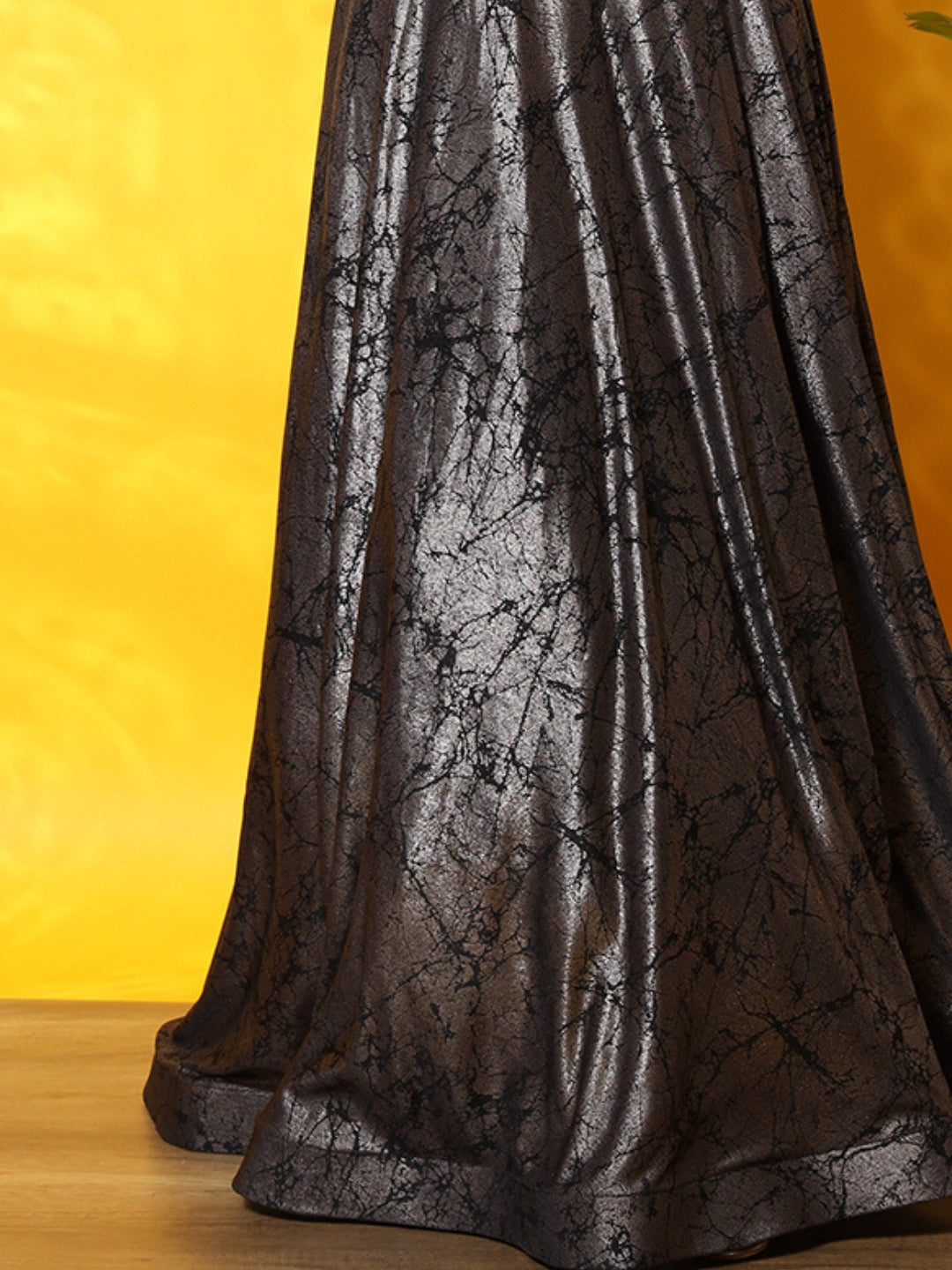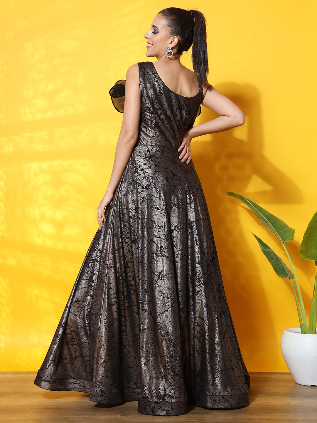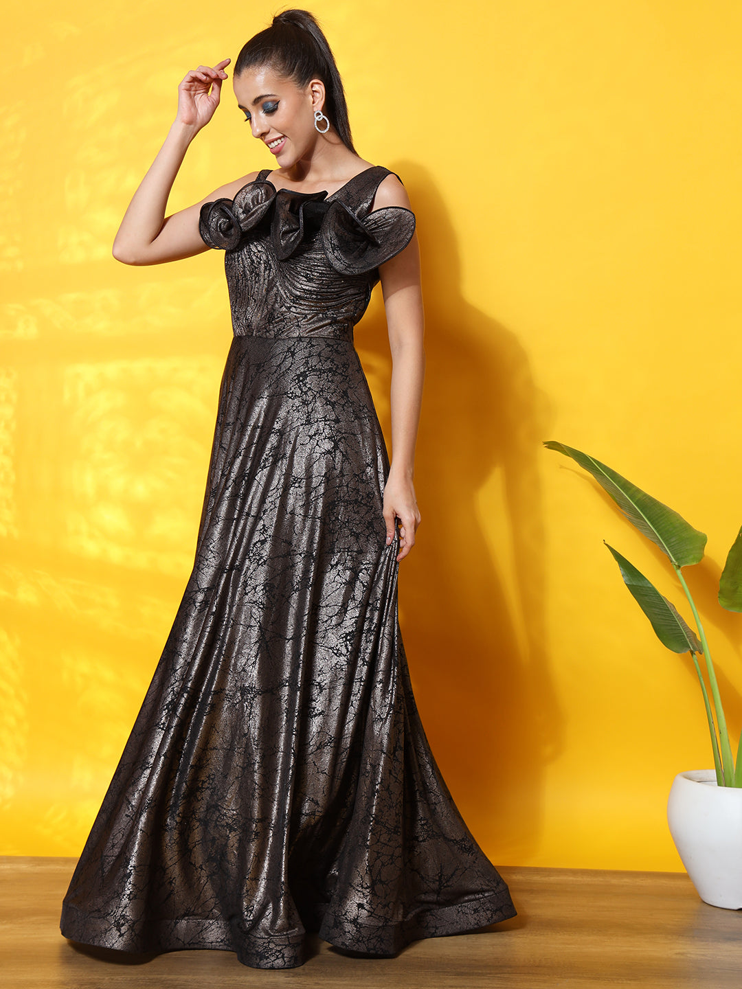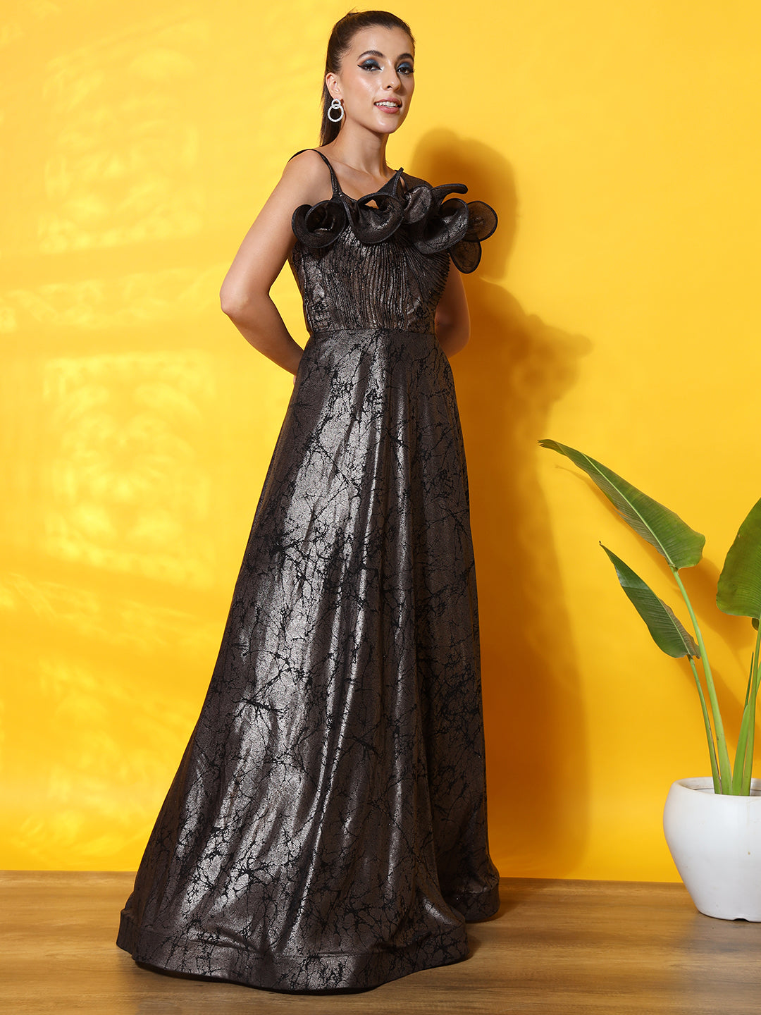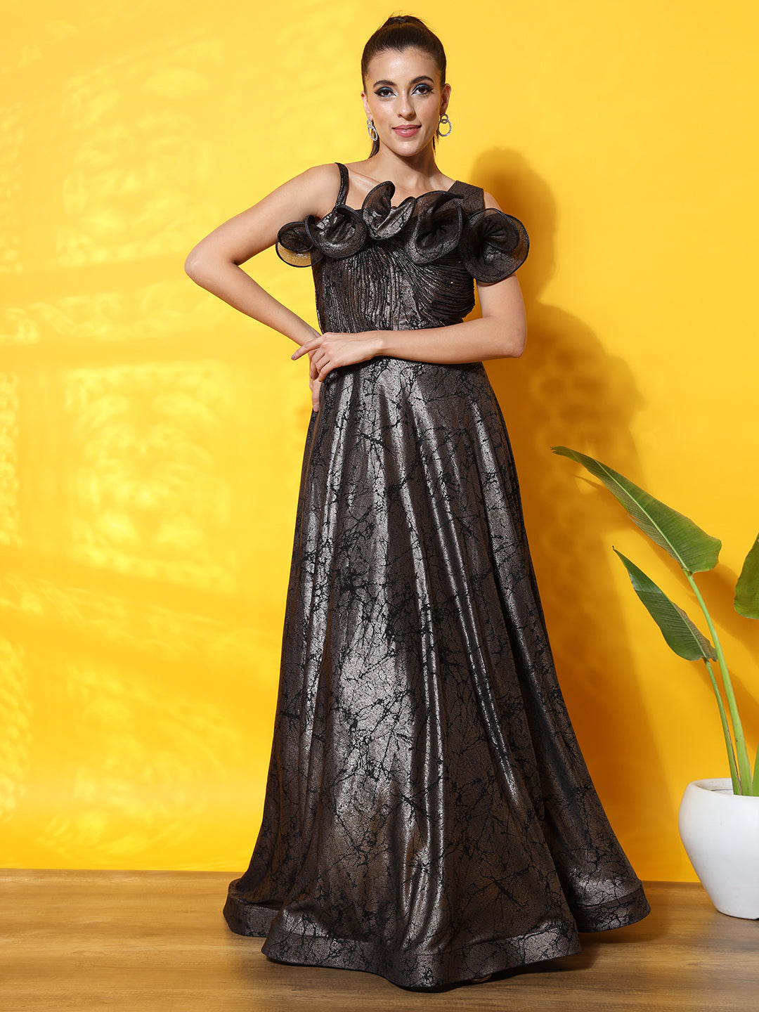 Textured Flowy Cocktail Gown with Structured Ruffled Yoke