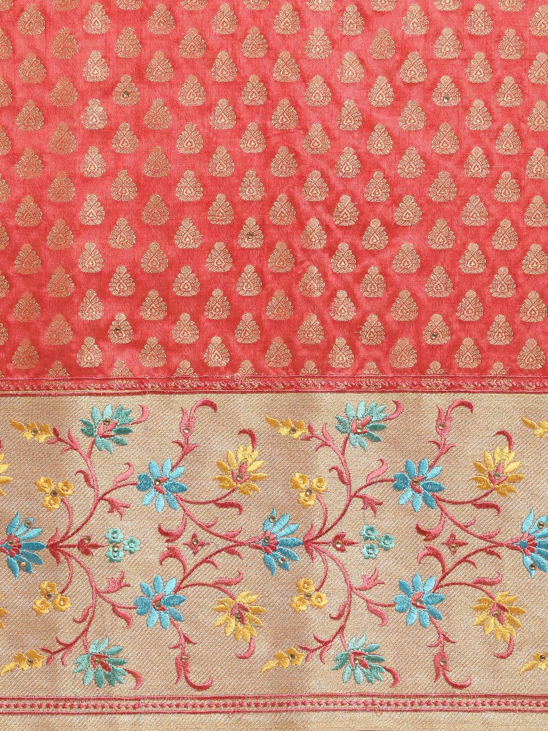 Chhabra 555 Chanderi Banarasi Silk saree with Buti Zari weave and broad multicolor threadwork border