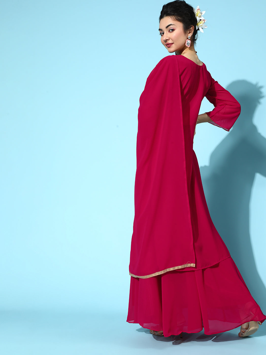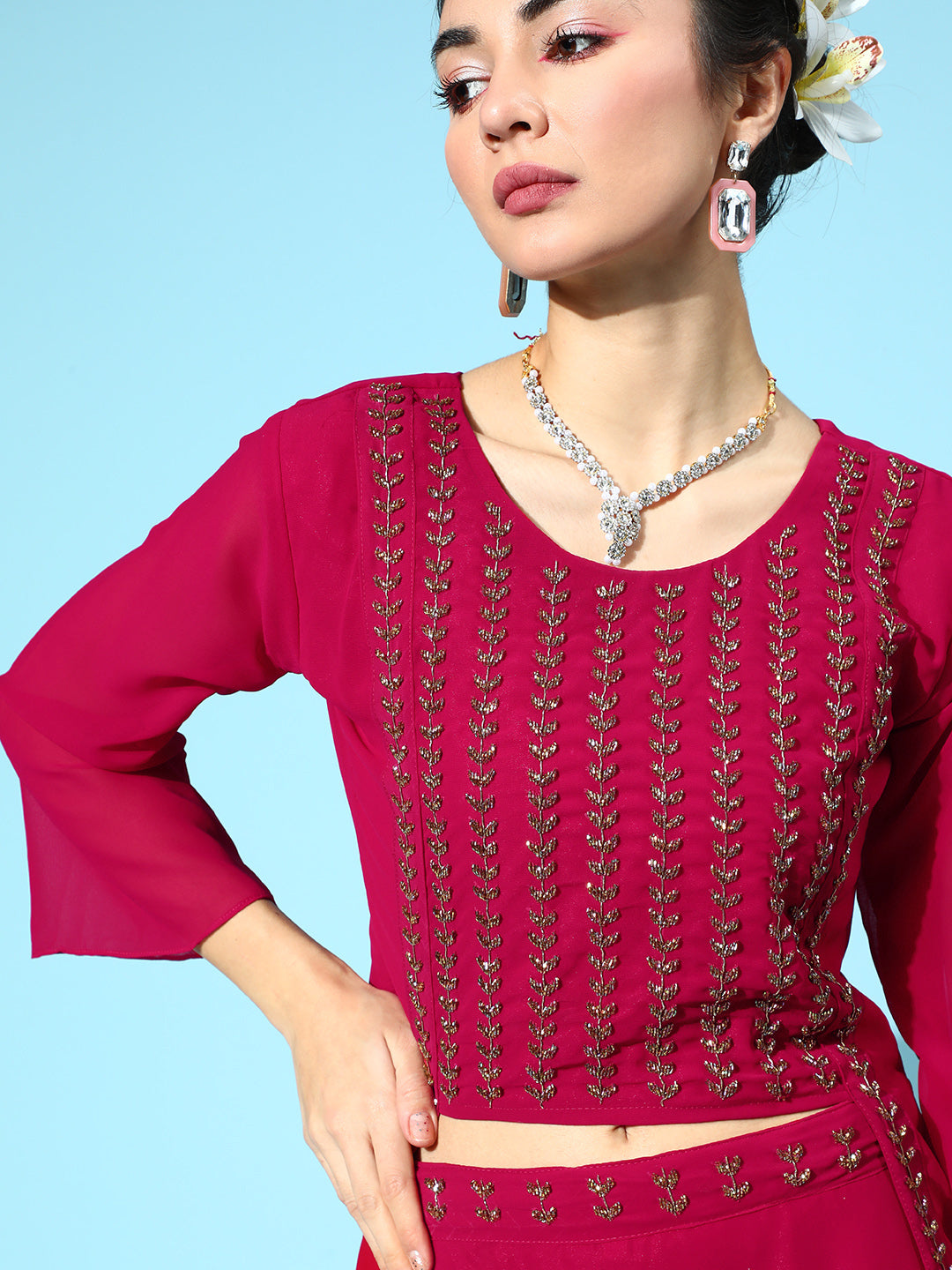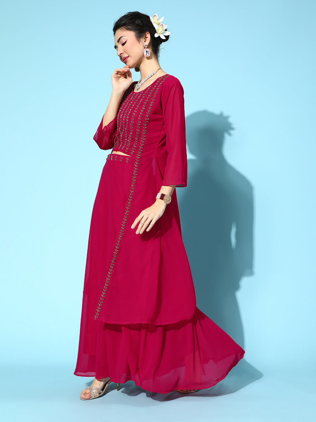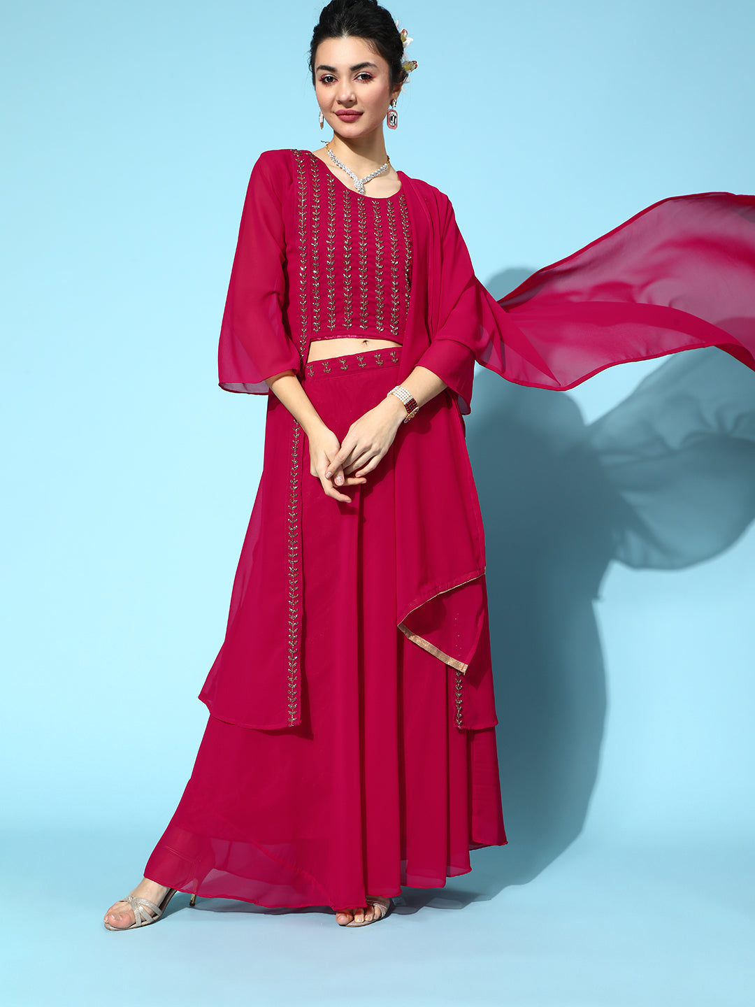 Magenta Cutdana Embellished High Low Top With Skirt & Solid Dupatta