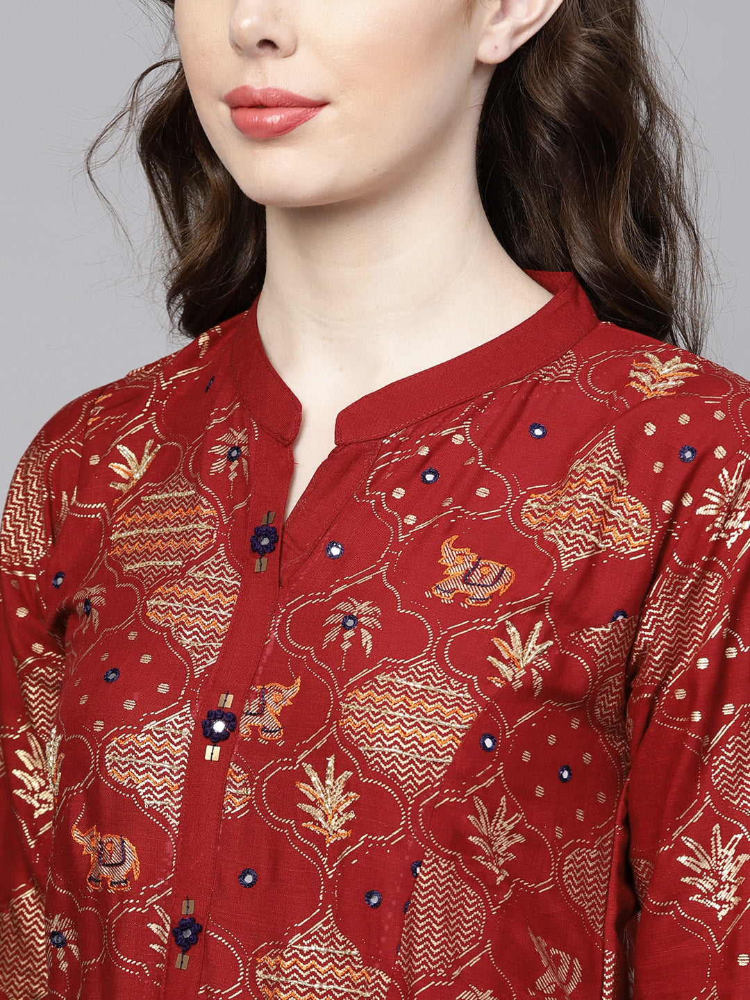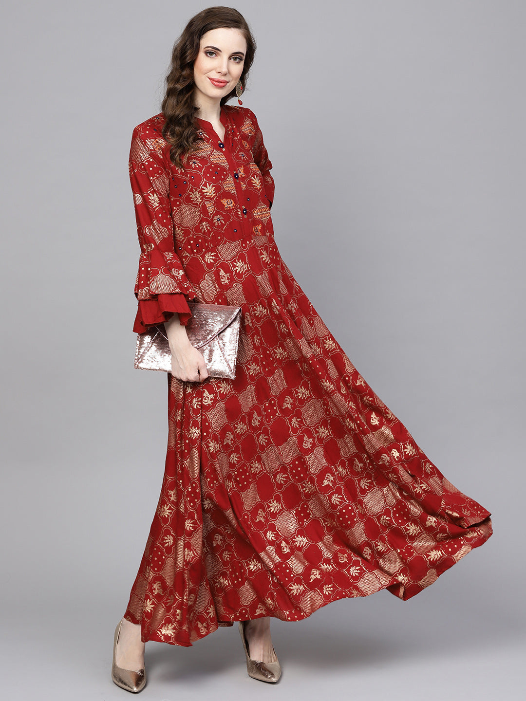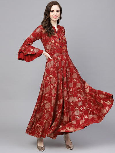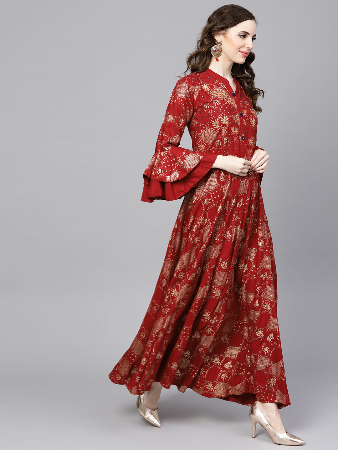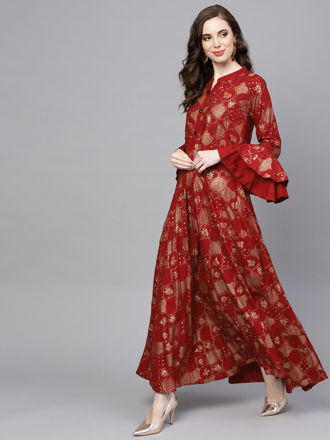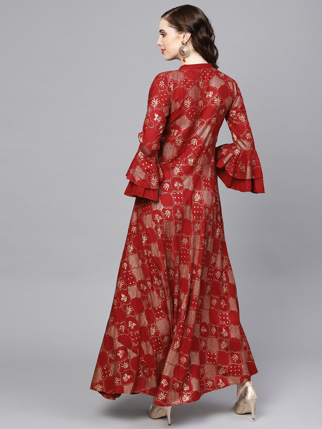 Chhabra 555 Maroon Cotton Embellished Flared Kurta Dress with Foil Print and Layered Bell Sleeves