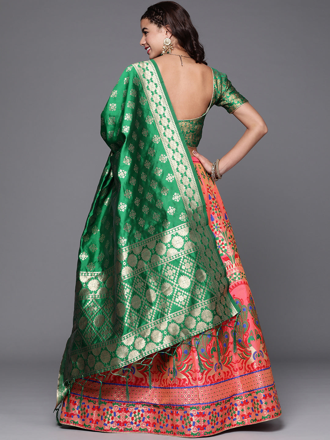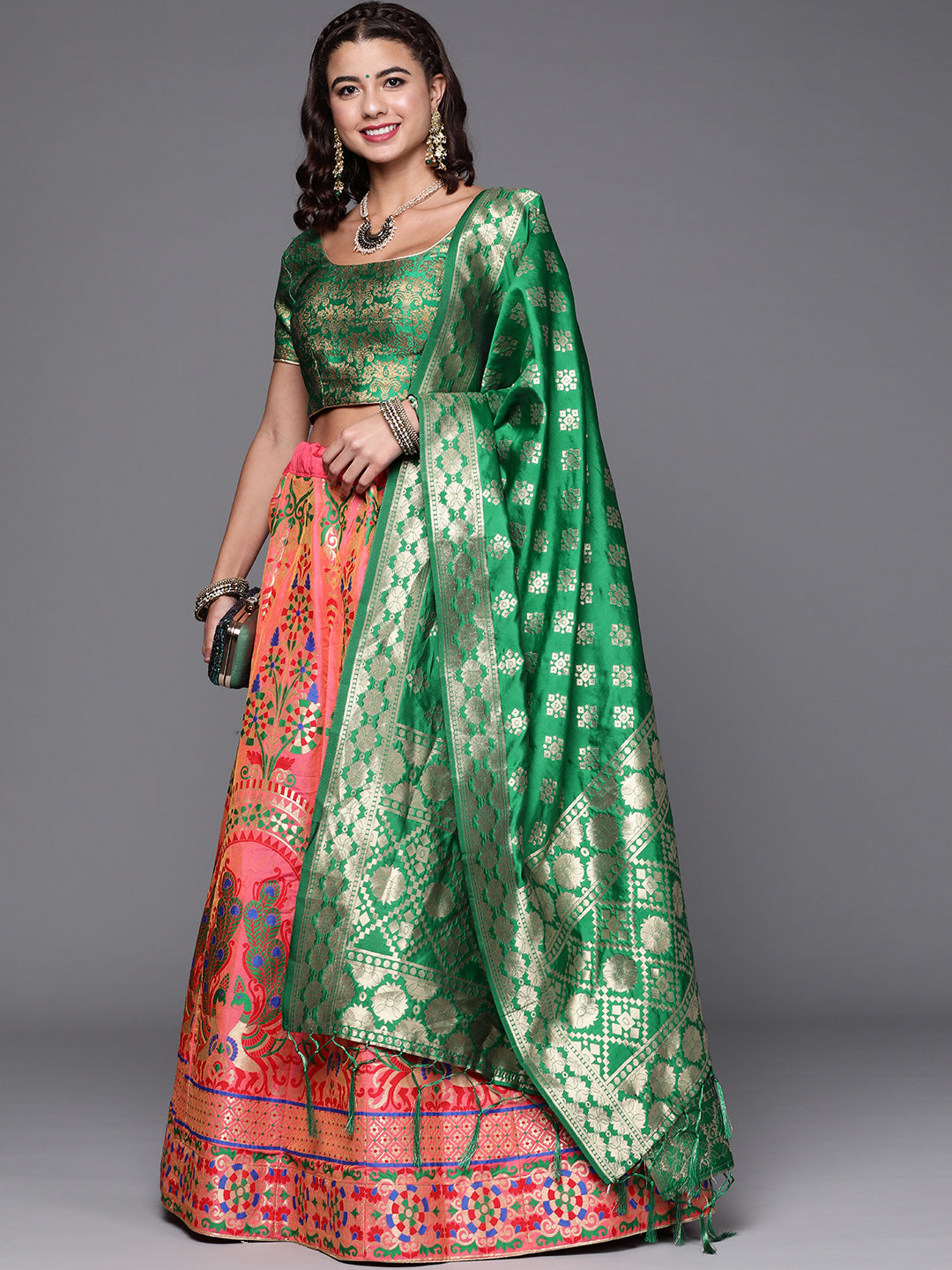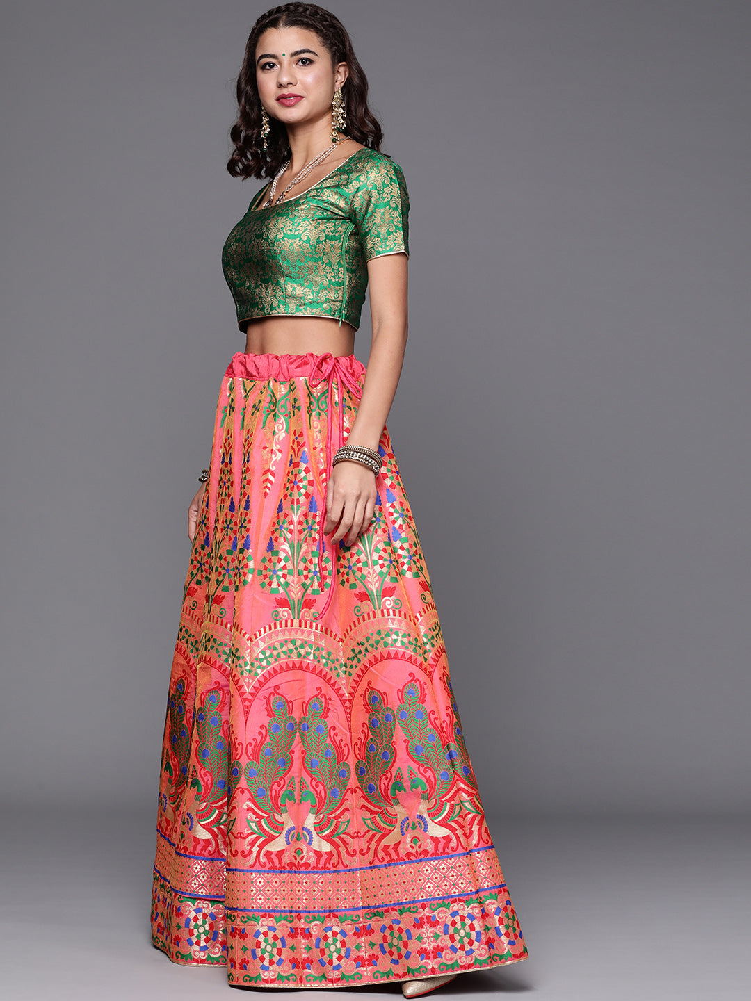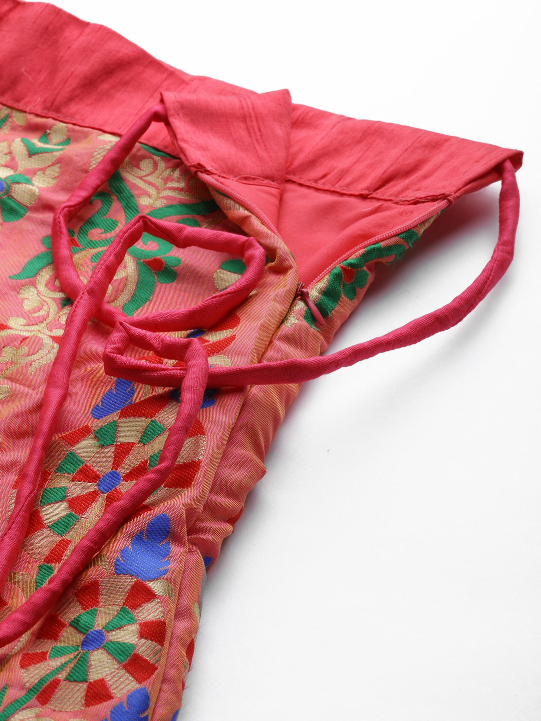 Pink Semi Stitched Banarasi Brocade Silk Lehenga Set with Meenakari Zari Peacock Weaving