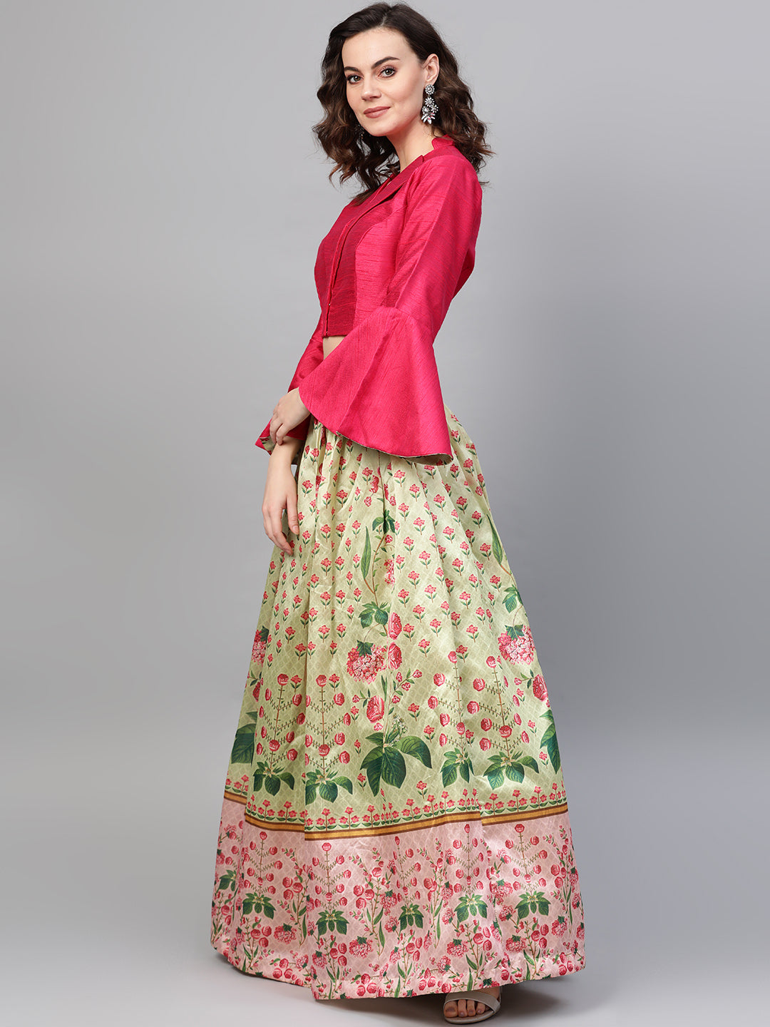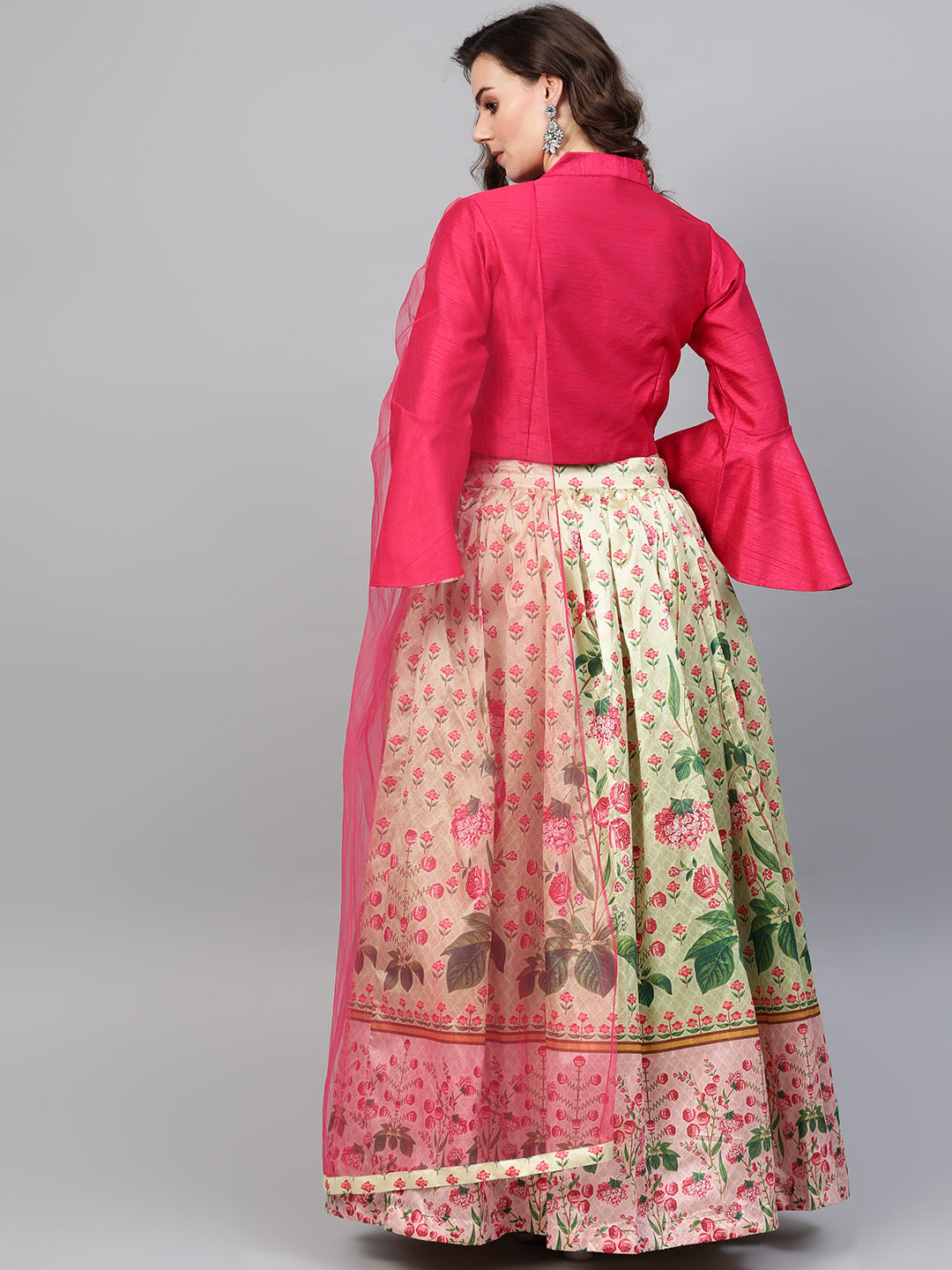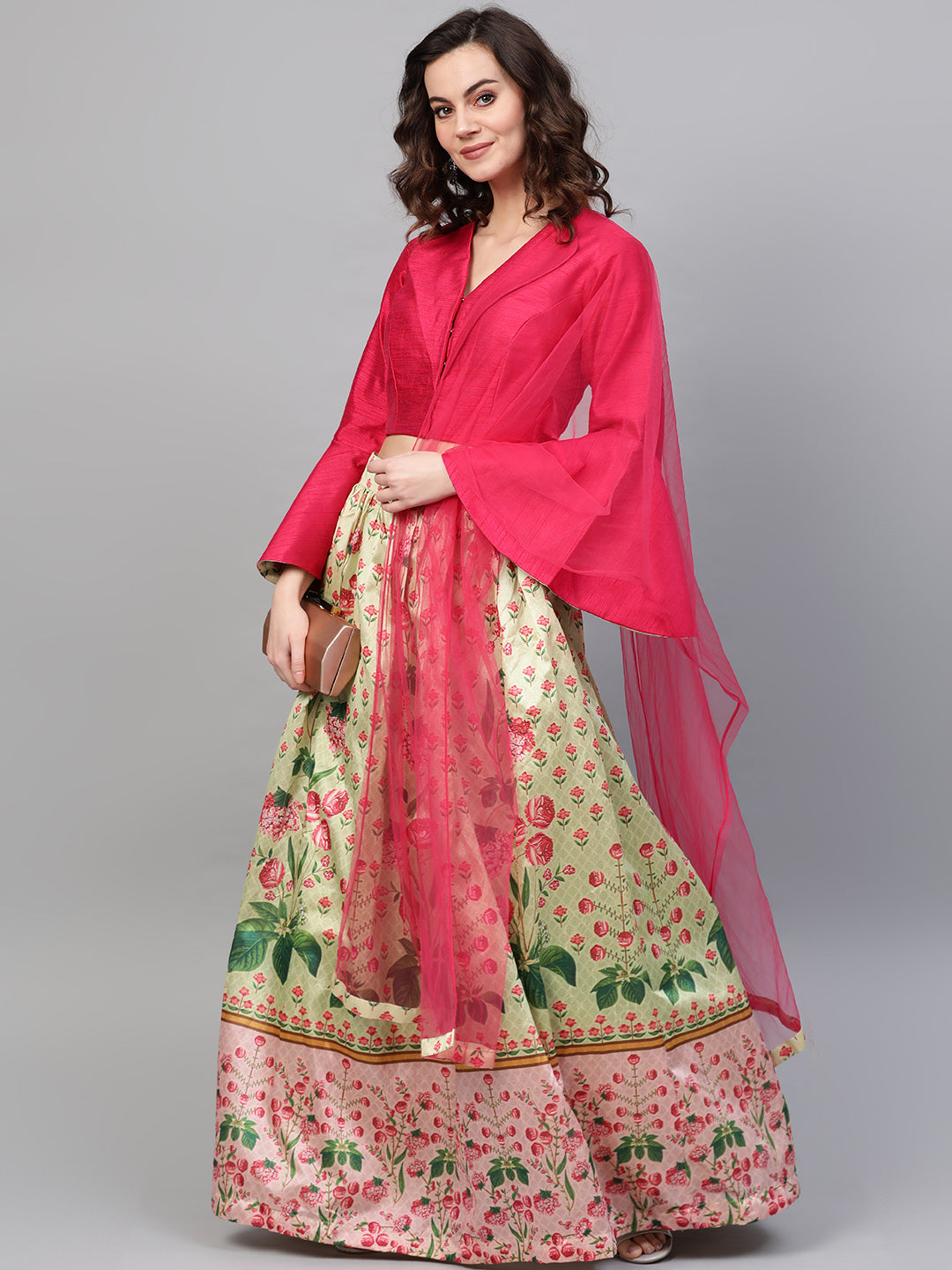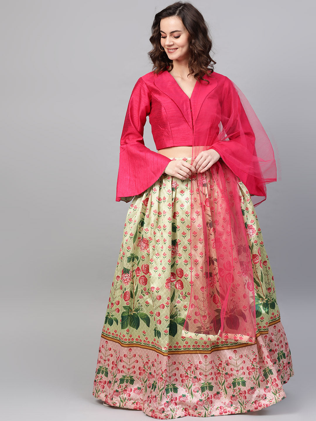 Digital Print Lehenga with Jacket Style Bell Sleeve Crop Top