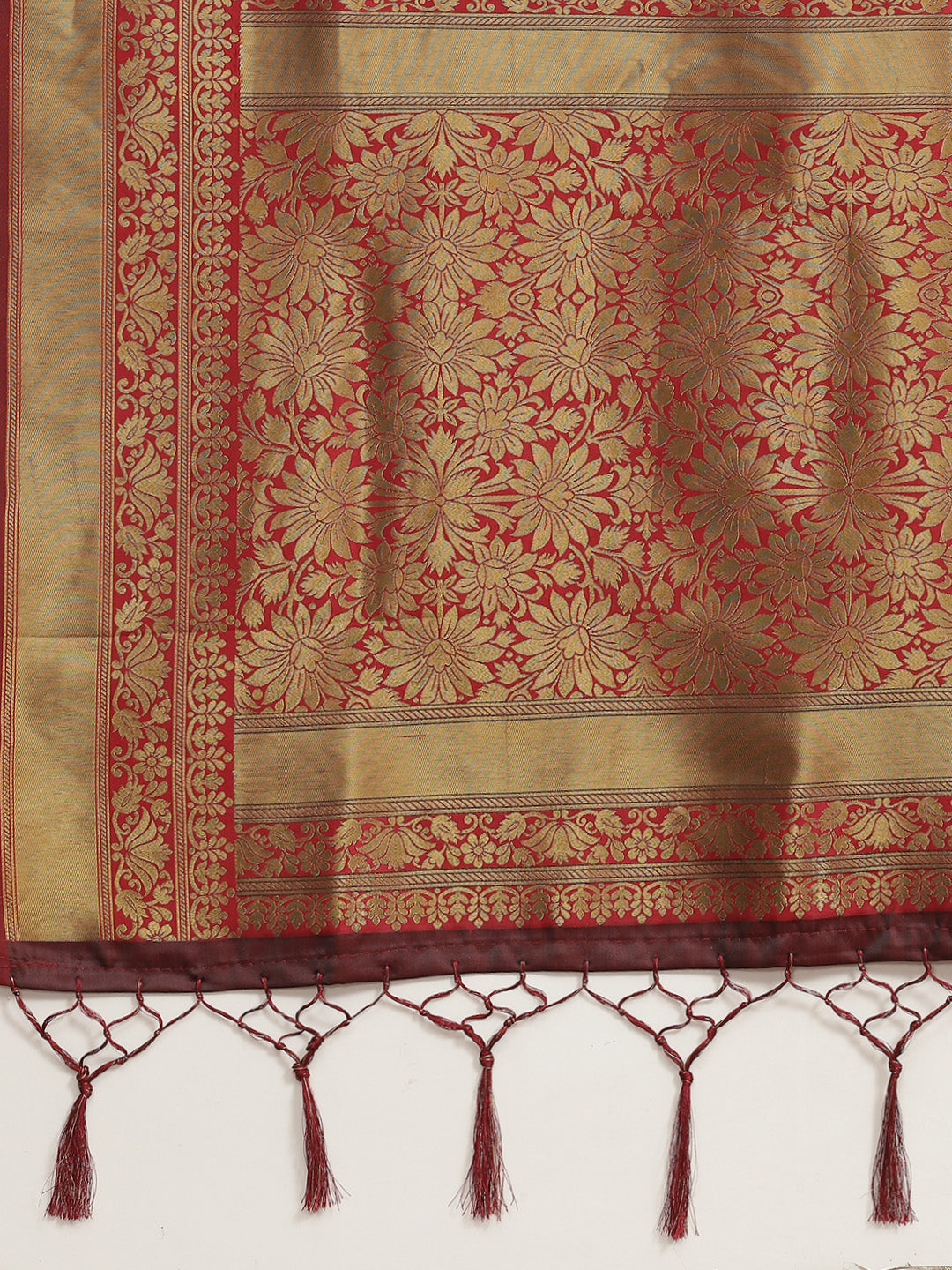Maroon Oxidised Zari Self Woven Banarasi Jamdani Silk Saree