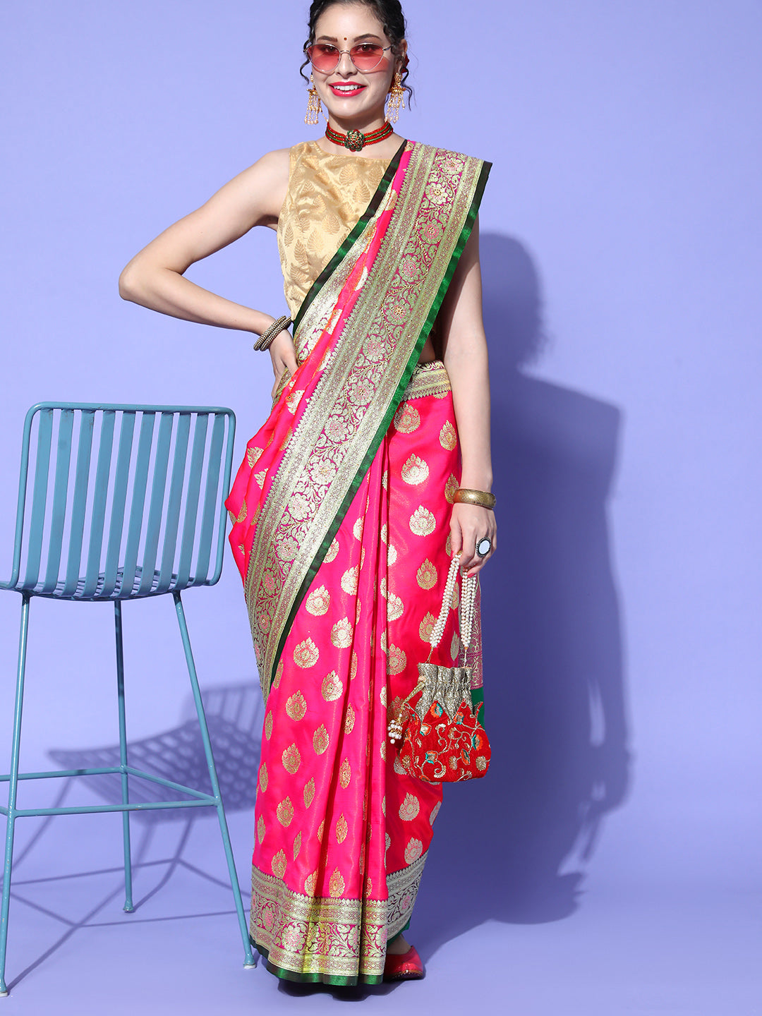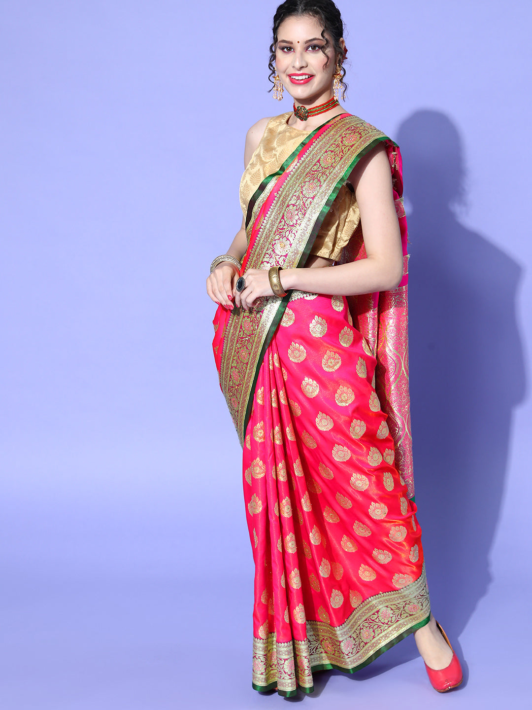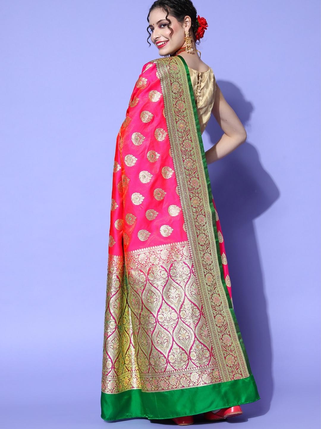 Coral Zari Kanjeevaram Silk Wedding Saree with Crystal Embellisments