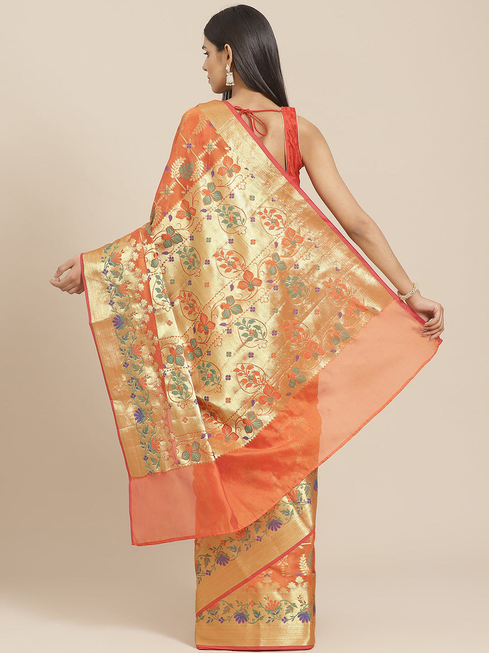 Banarasi Chanderi Saree with Gold Zari & Resham Artistic Motifs & Floral Woven border