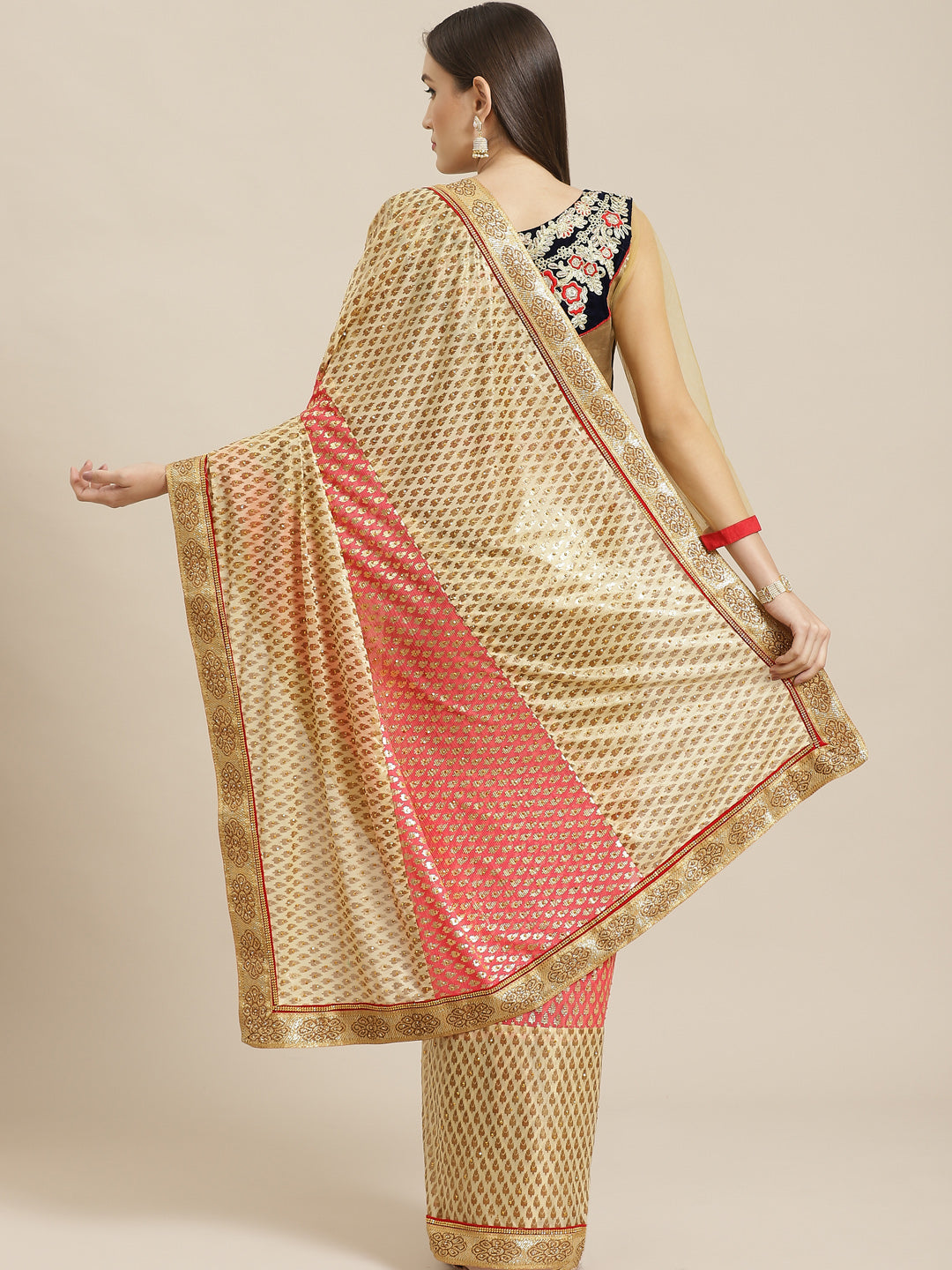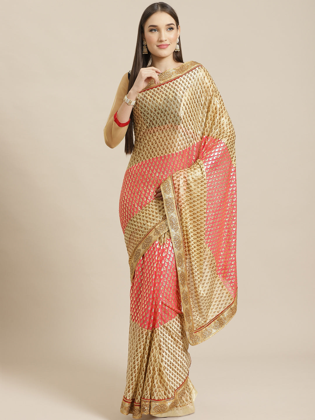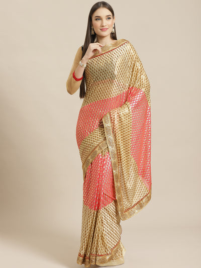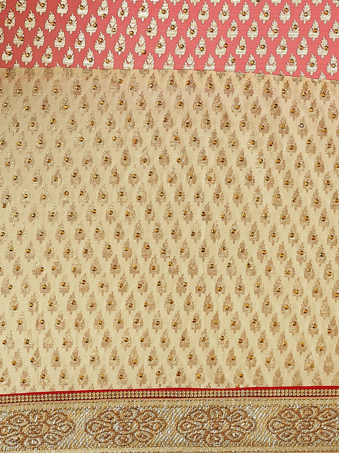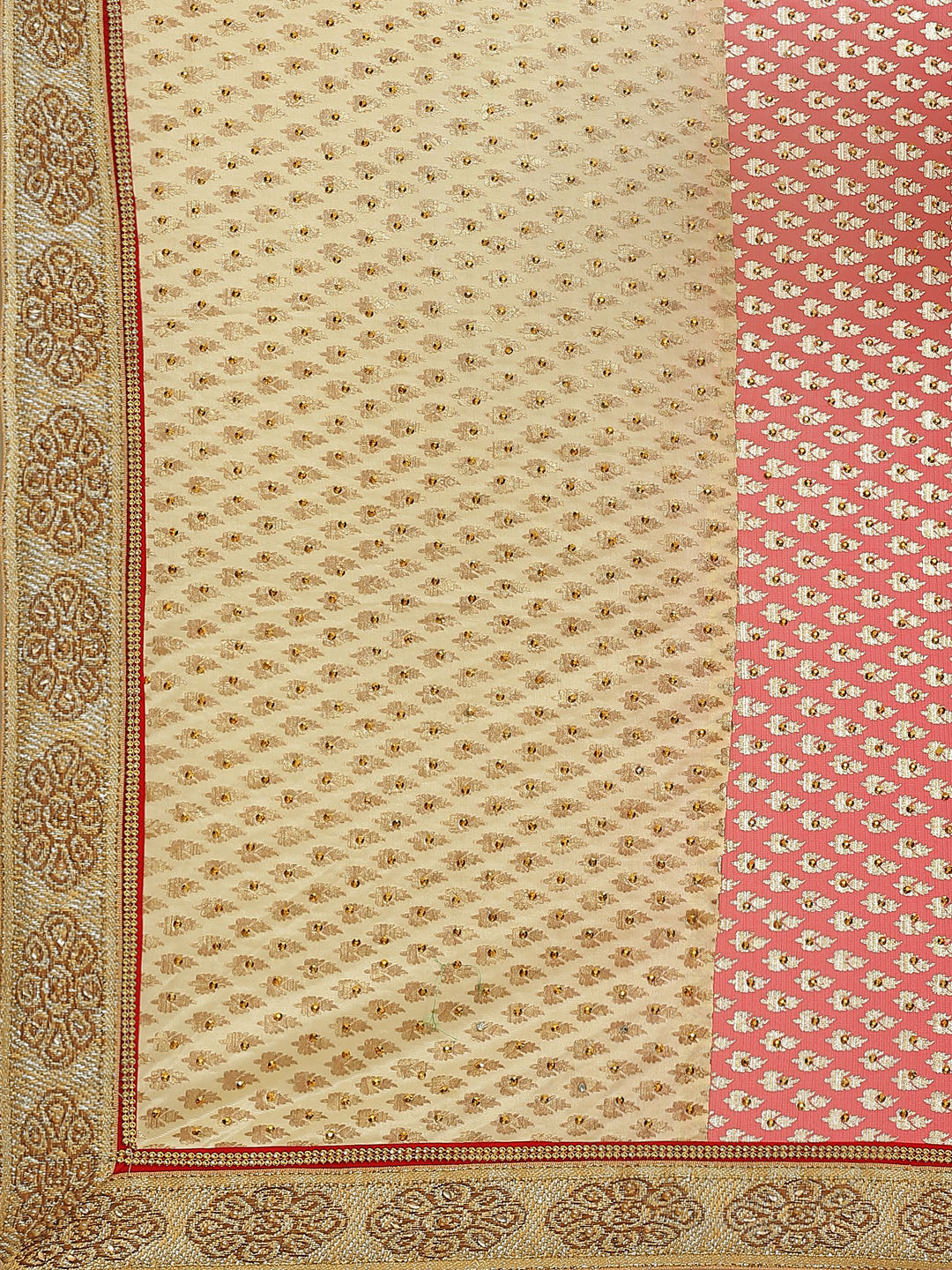 Foil print Beige Coral Traditional Stone Embellished Saree with Fancy Border