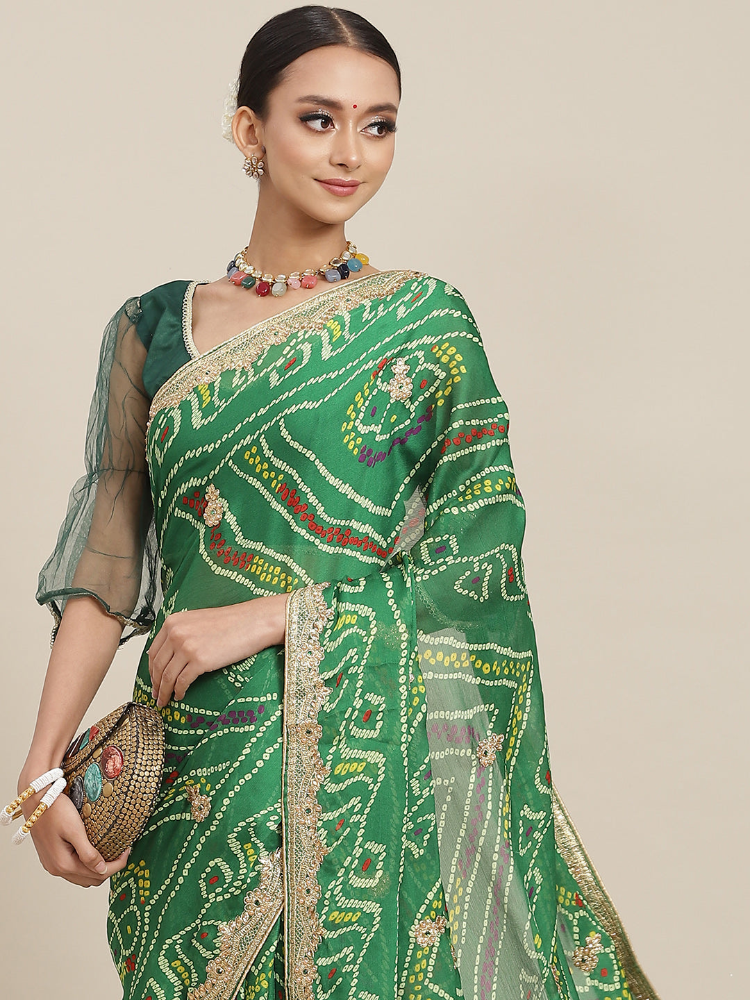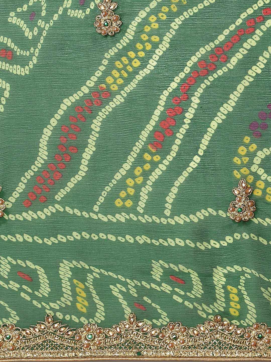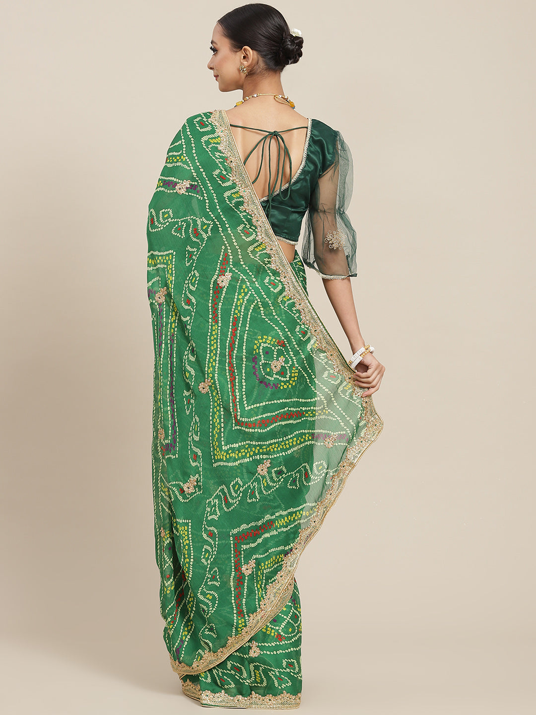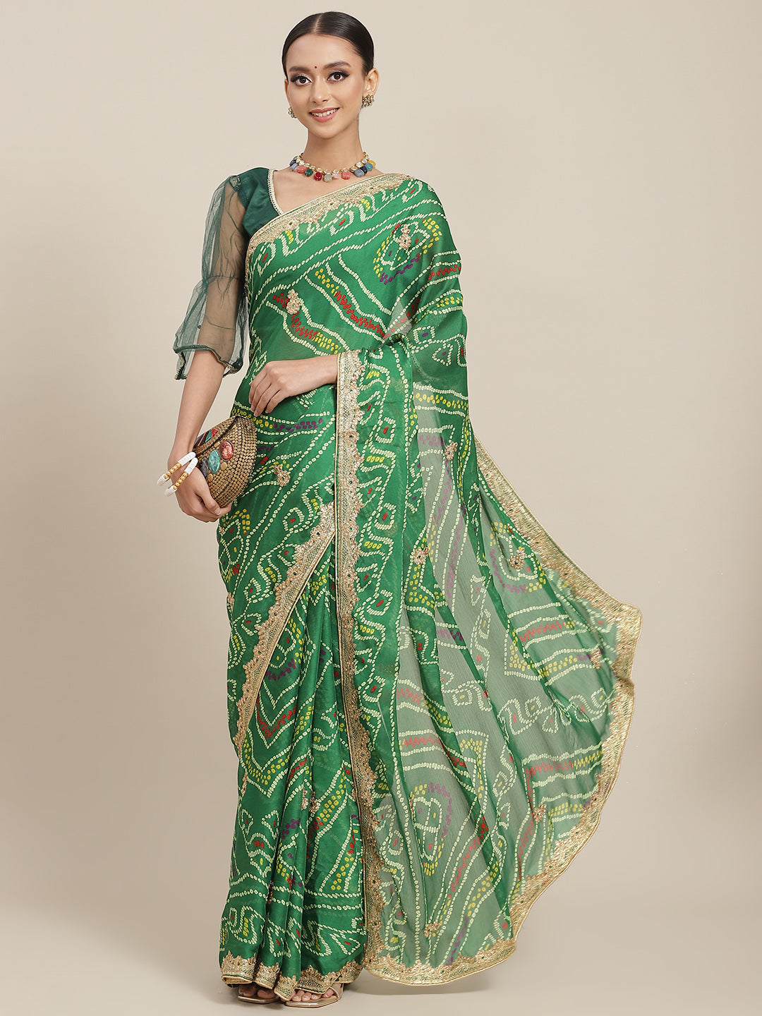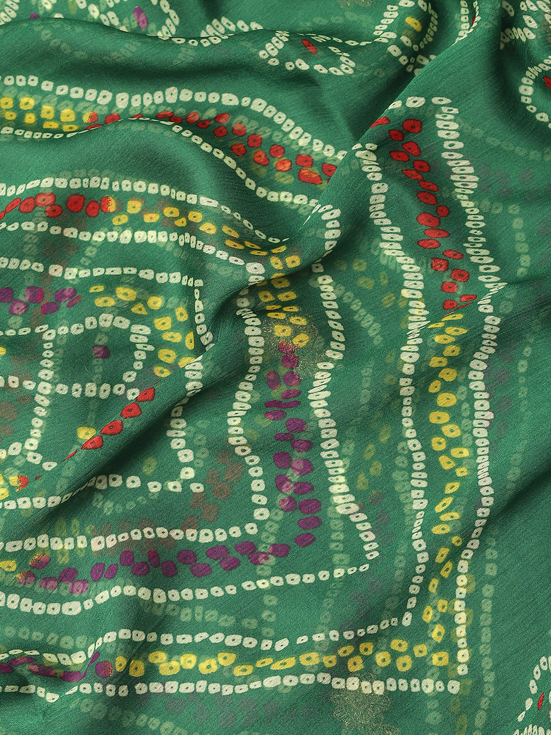 Green Jaipur Bandhani Print Chiffon Saree with Gold Zari Embroidery