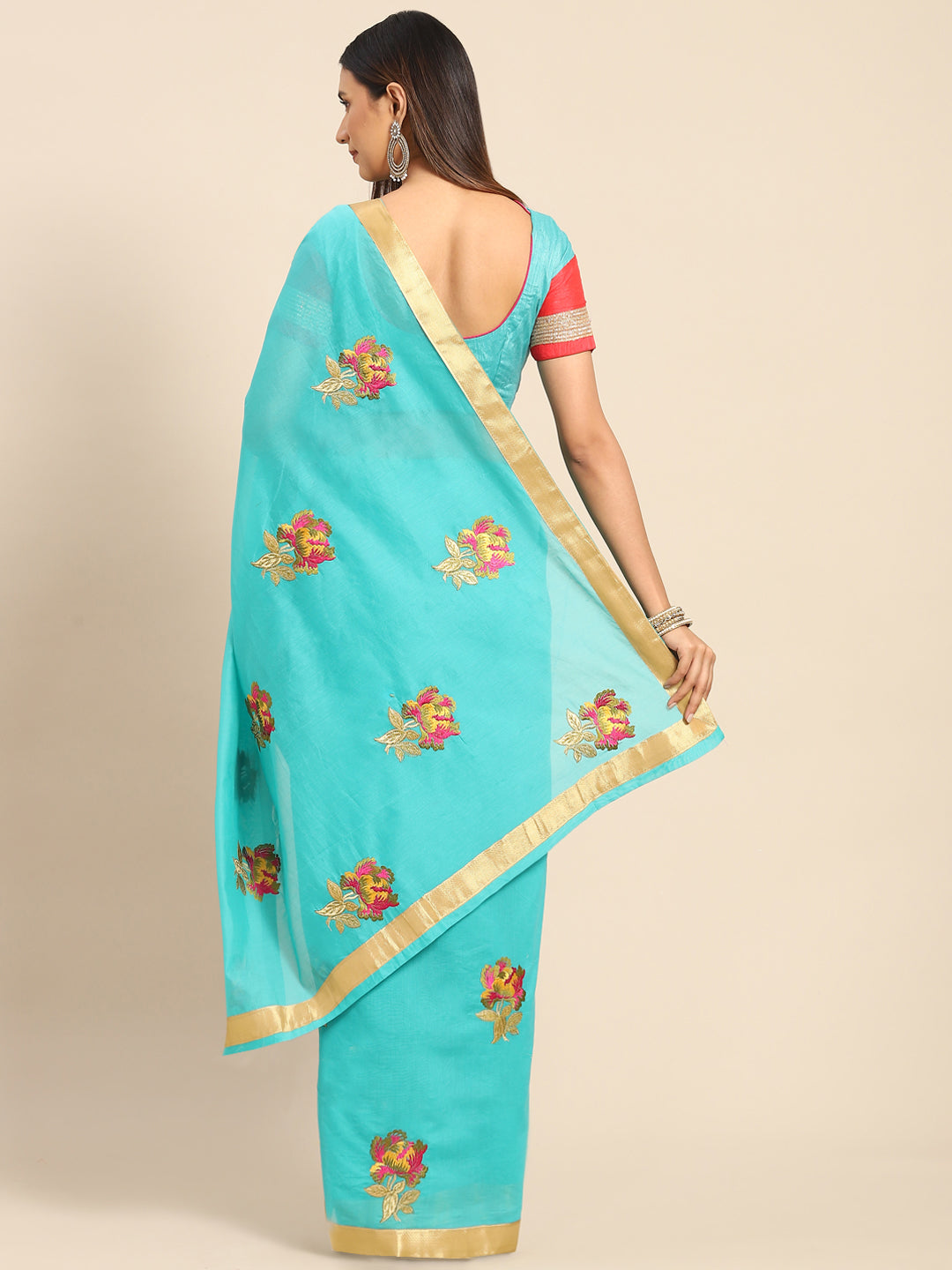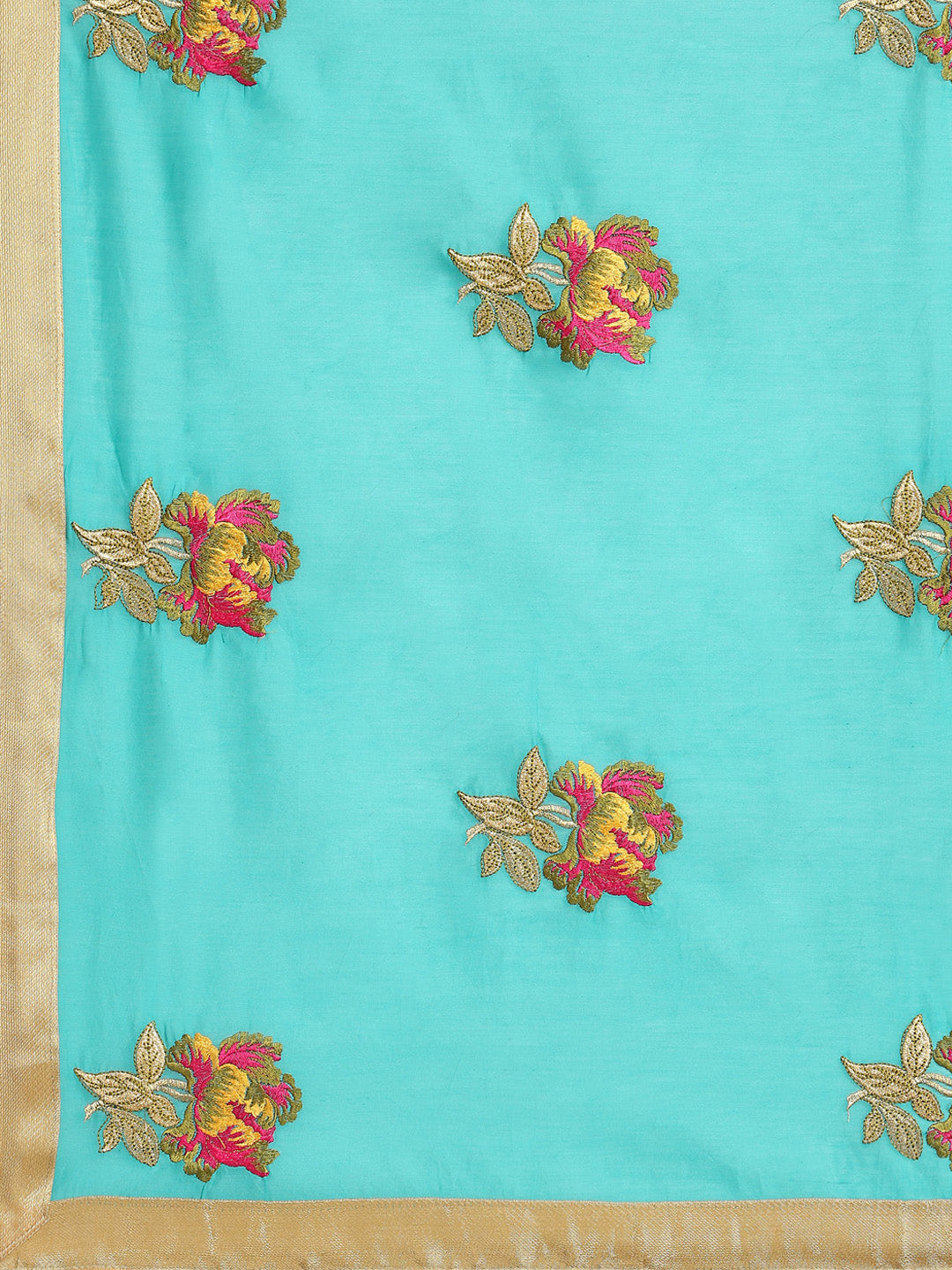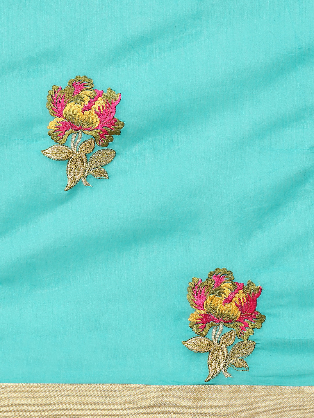 Turquoise Floral Resham Thread Embroidery Cotton Tussar Saree