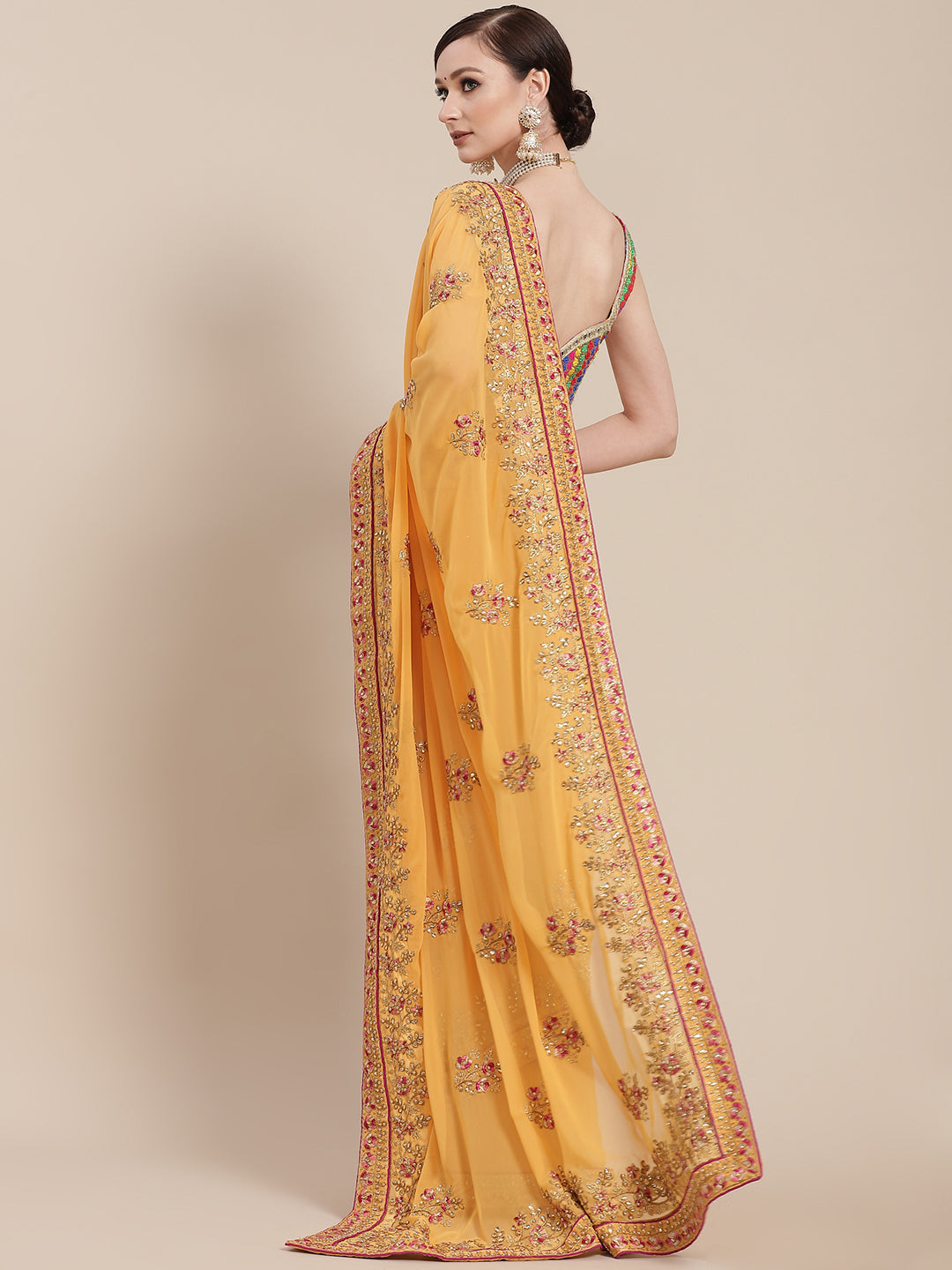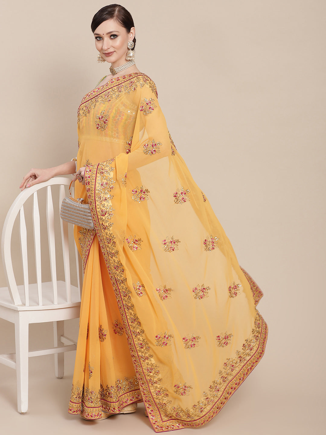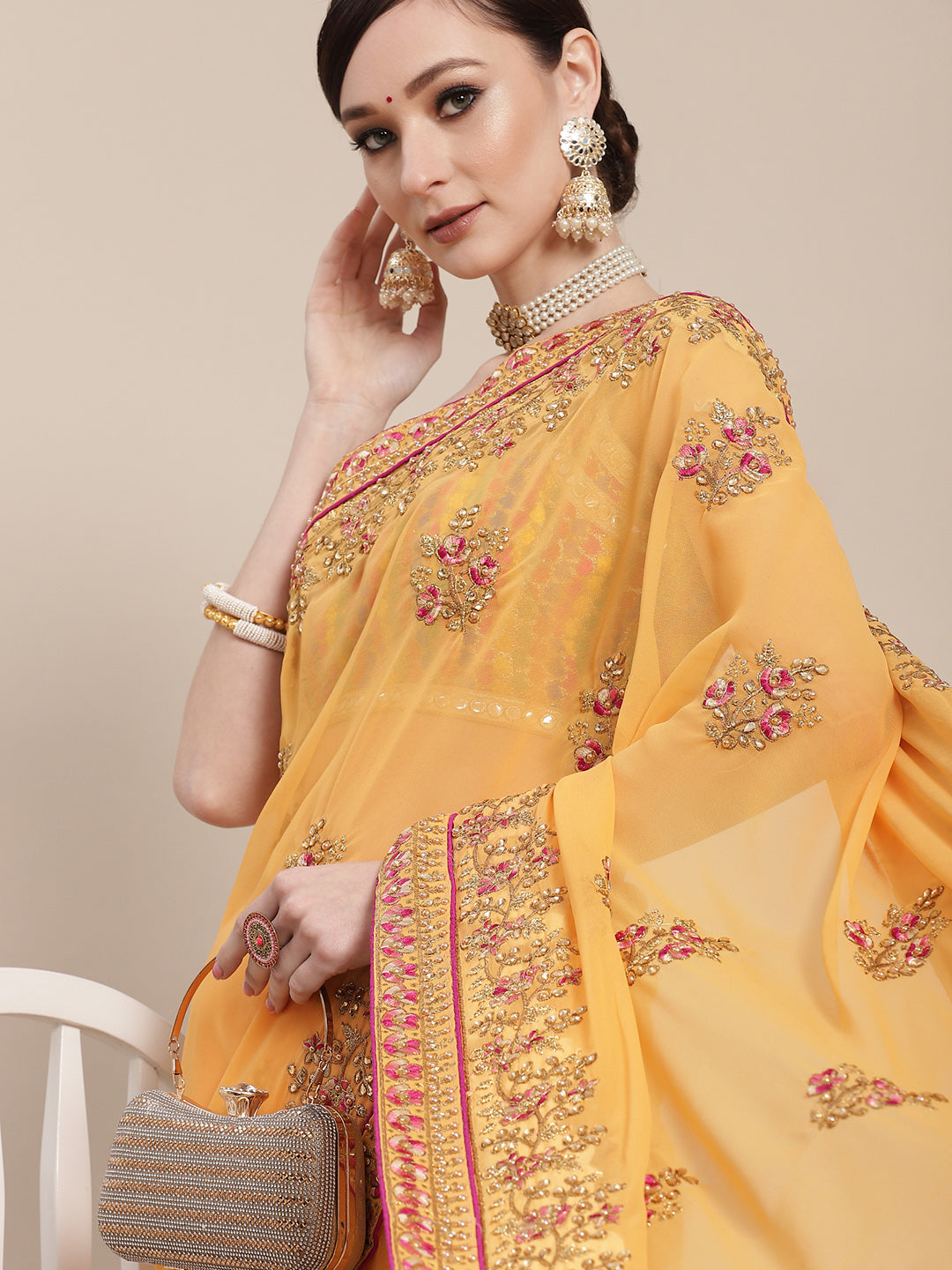 Mustard Resham & Zari Embroidered Georgette Stone Work Embellish Saree