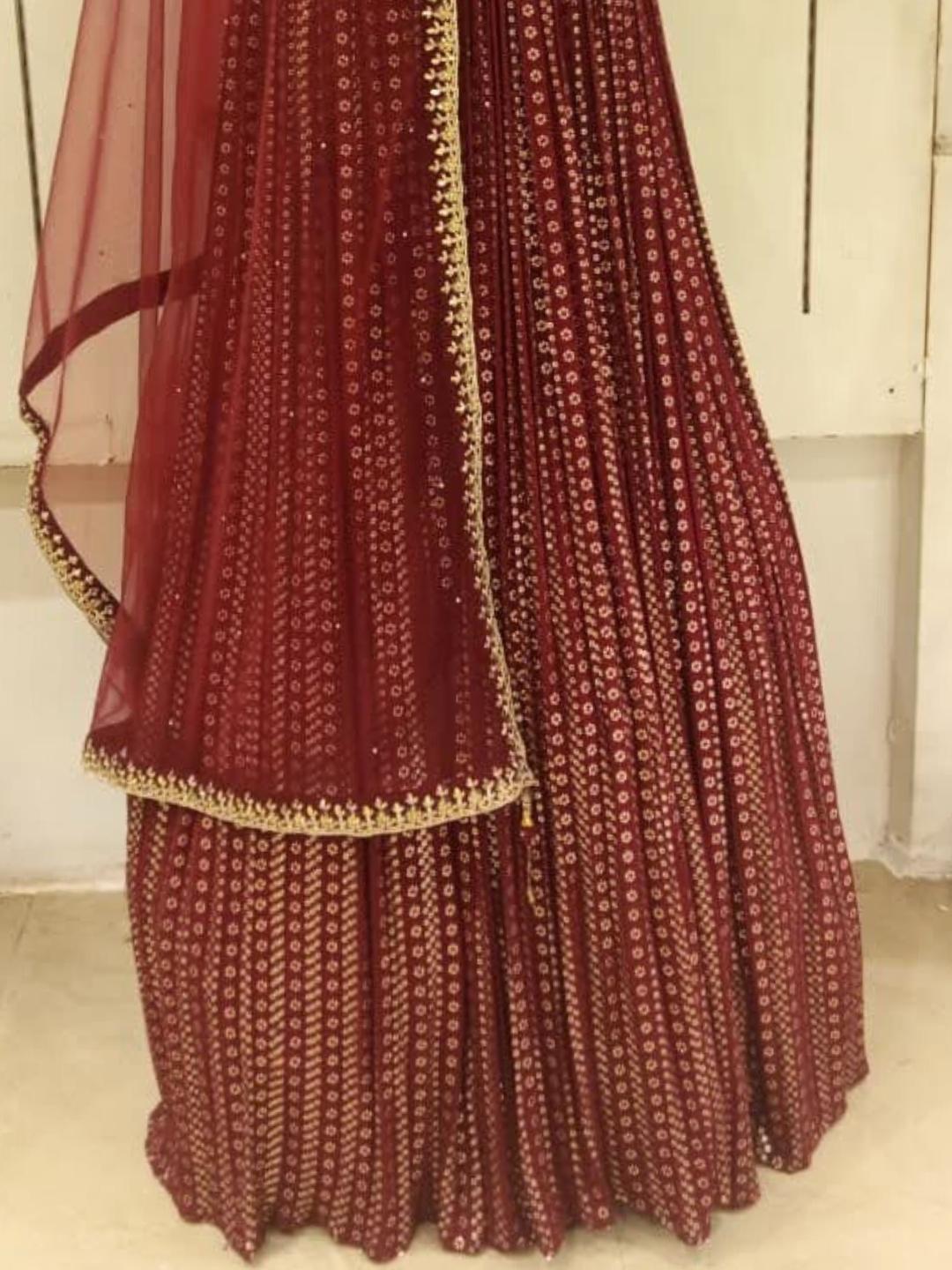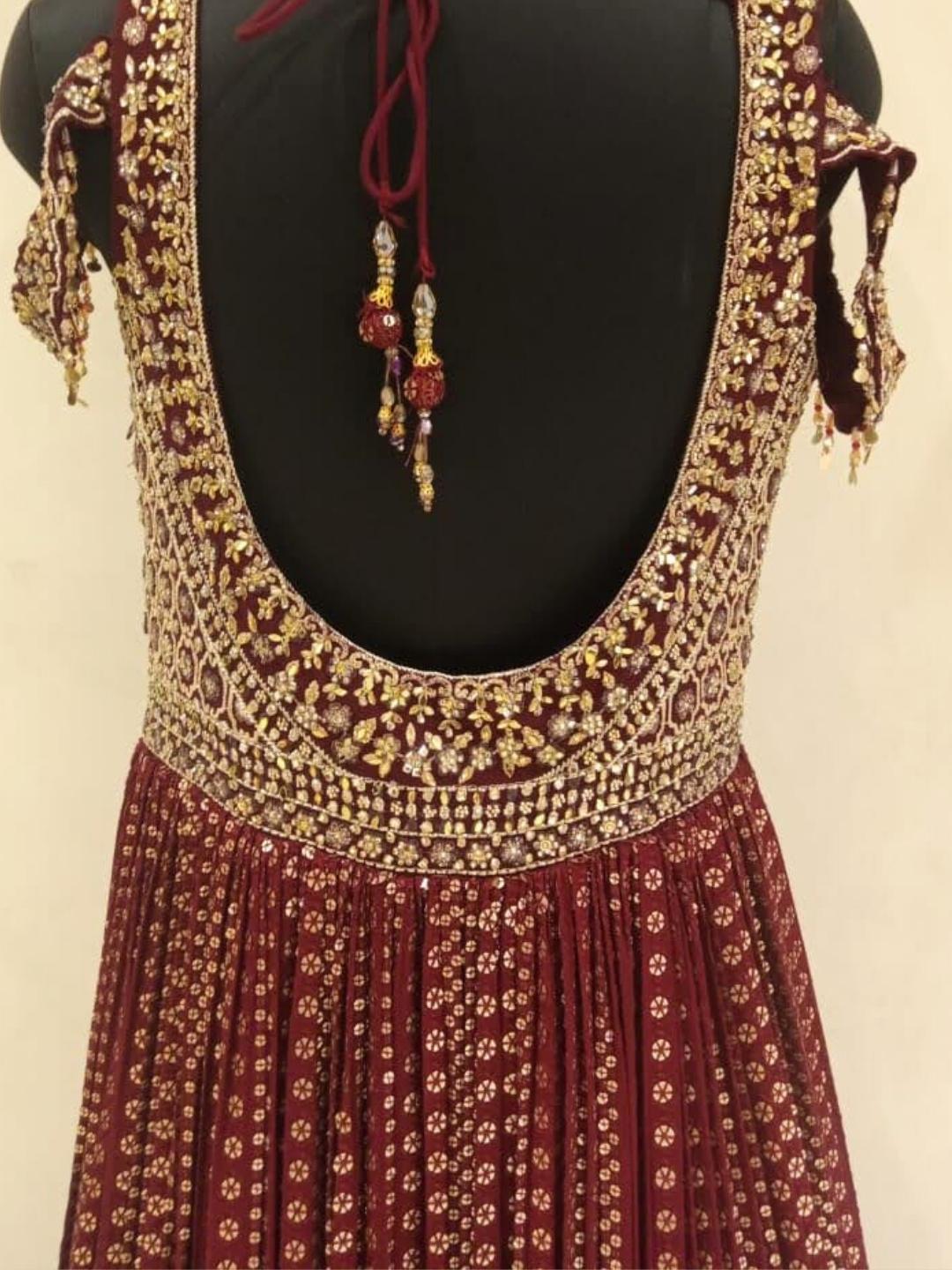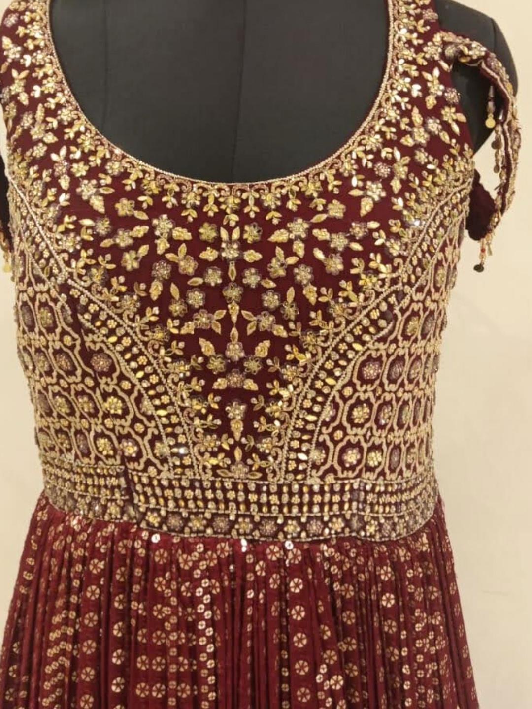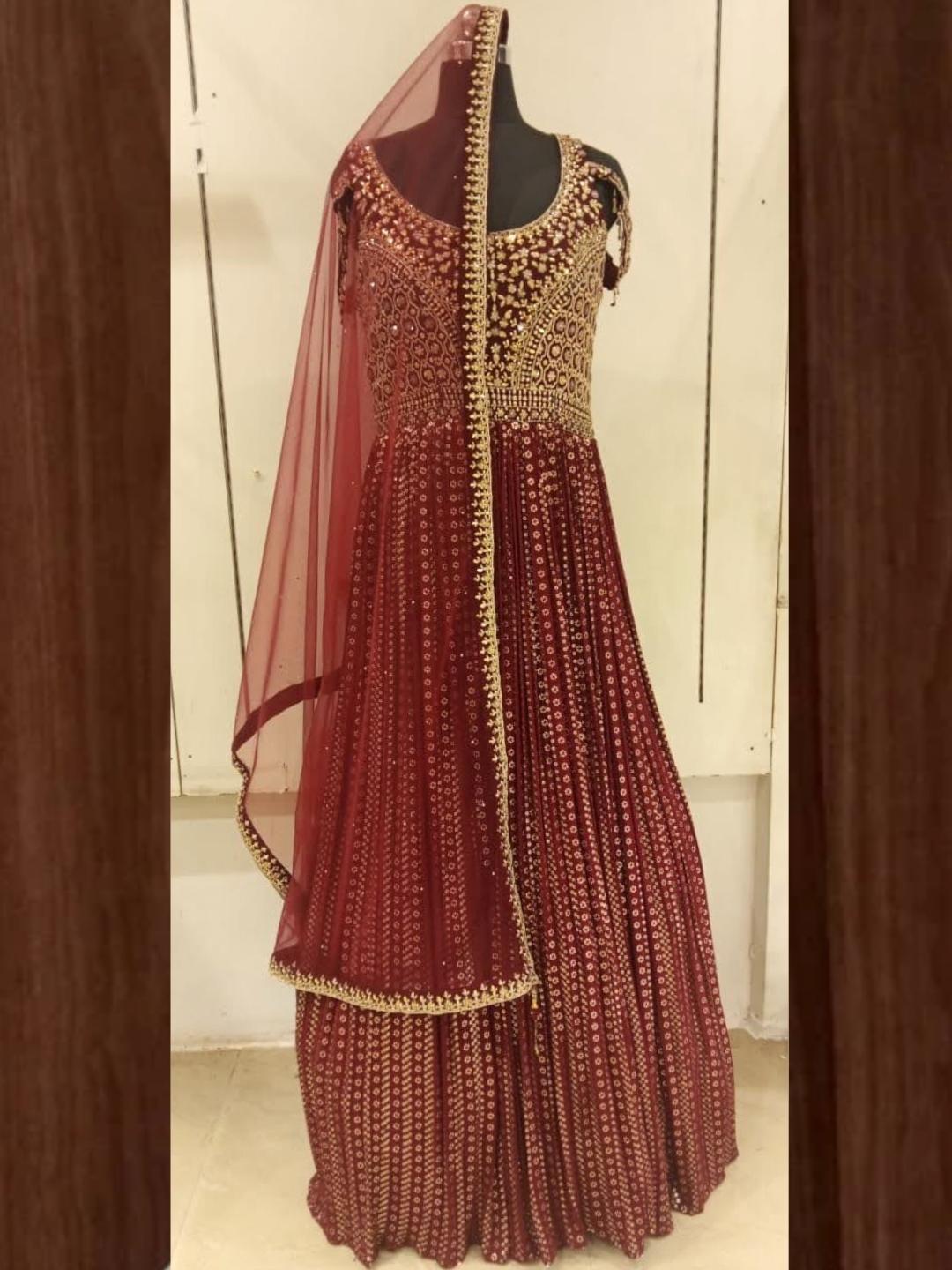 Maroon Bridal Golden Zari Embroidered Long Flared Printed Net Gown Dress With Net Dupatta