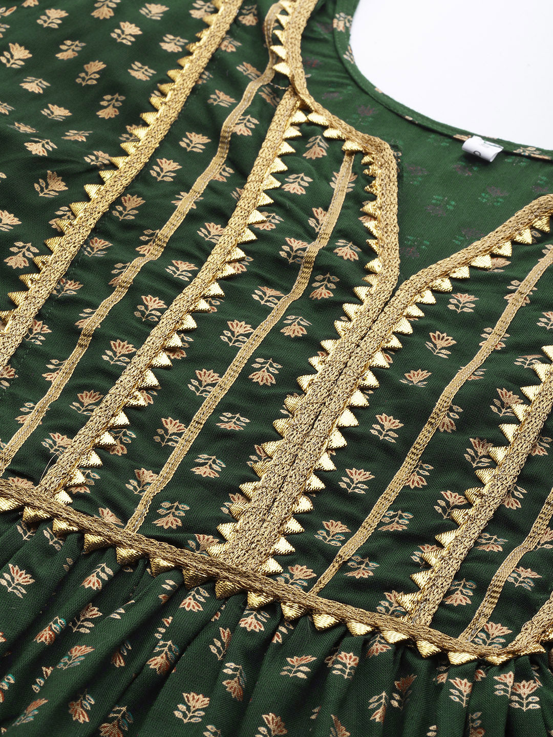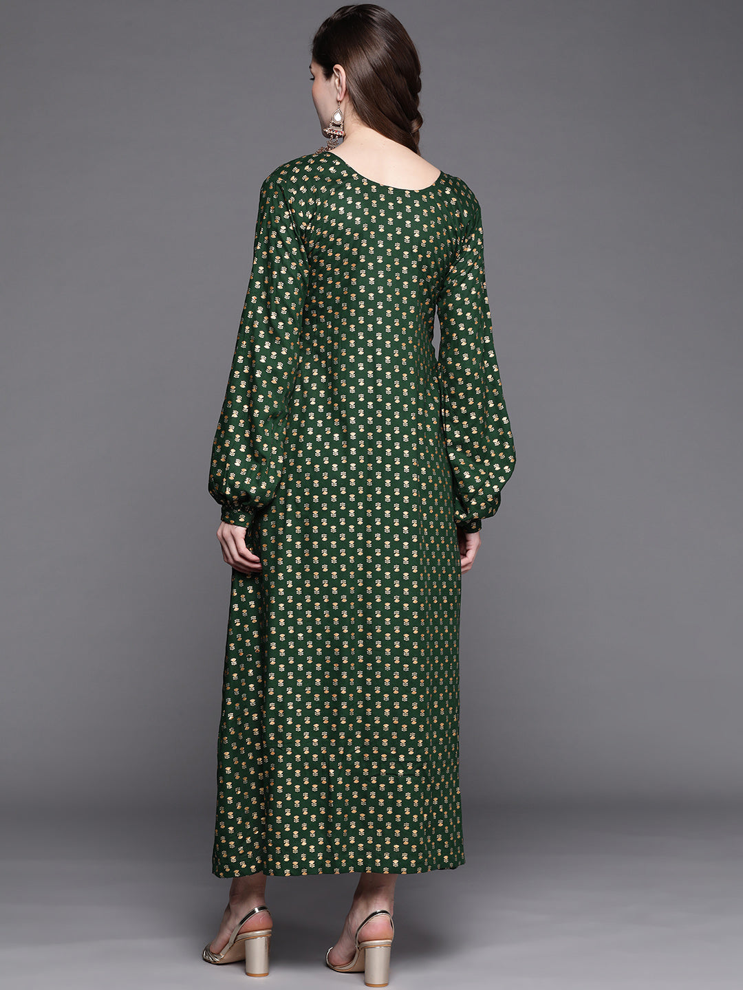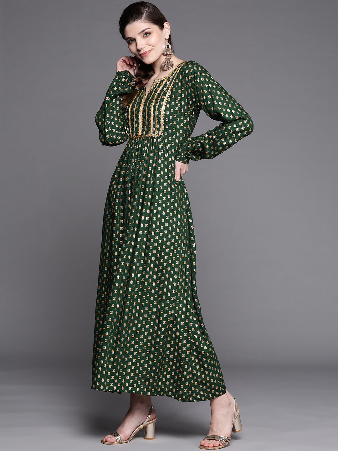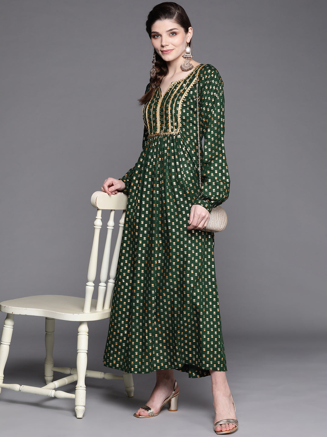 Made to Measure Bottle Green Foil Print Dress with Floral motifs & Gota Patti Neckline