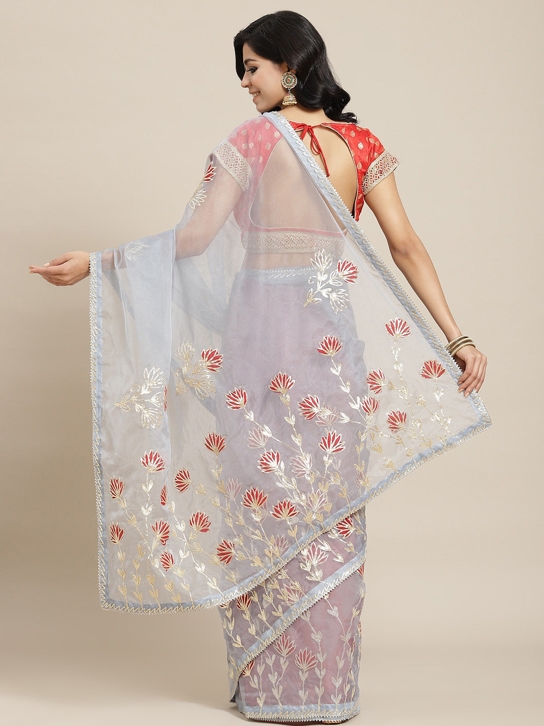Grey Organza Jaipuri Saree with Resham Embroidery & Contrast Blouse