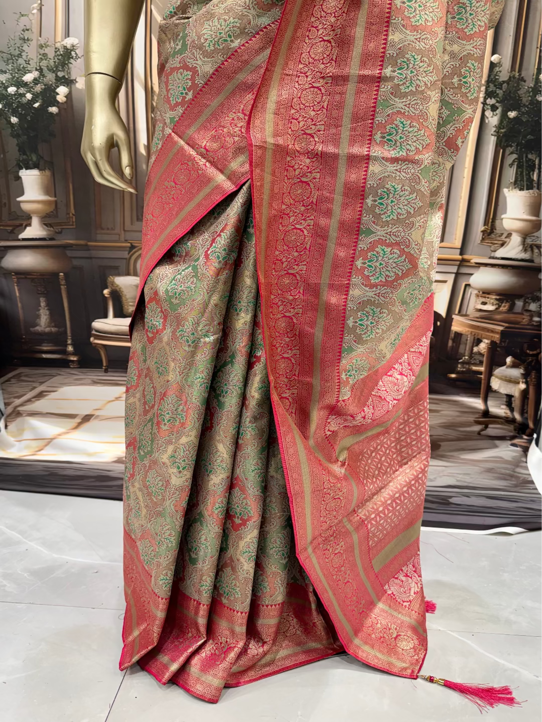 Elevate your ethnic wardrobe with this stunning Multicolor Banarasi Floral Zari Woven Saree. Crafted with intricate zari work, this saree features vibrant floral motifs woven throughout the fabric, creating a mesmerizing traditional aesthetic. The elegant pink border adds a refined finishing touch that complements the multicolor palette beautifully. Perfect for weddings, festivals, and special occasions, this Banarasi saree showcases the timeless craftsmanship of Varanasi's master weavers. The luxurious zari detailing catches light gracefully, while the traditional weaving technique ensures durability and authentic appeal. Drape this classic piece to make a sophisticated statement at any celebration. A versatile choice that pairs well with traditional jewelry and embellished blouses.