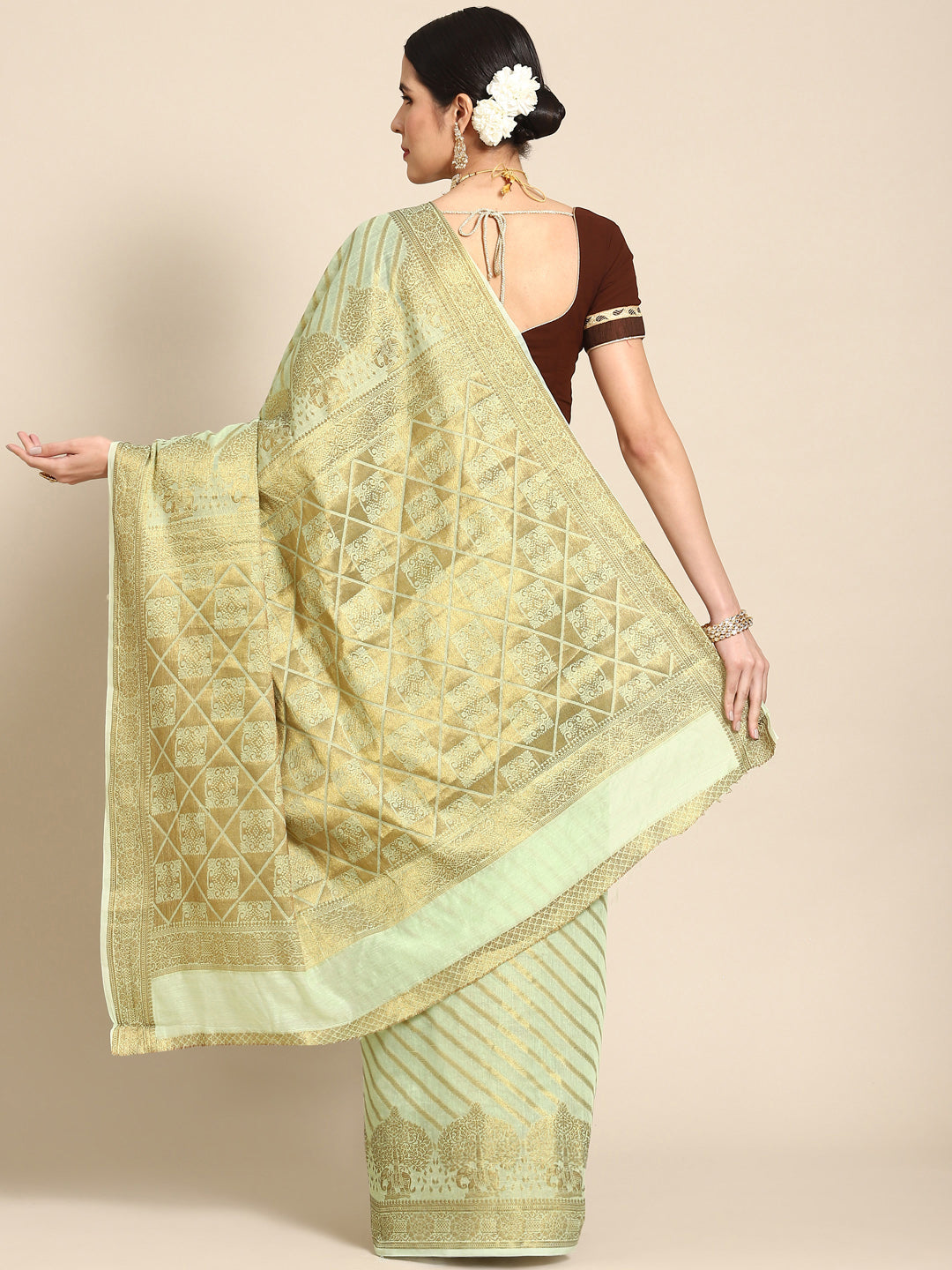 Rose Pink Banarasi Striped Oxidised Gold Zari Woven Chanderi Saree