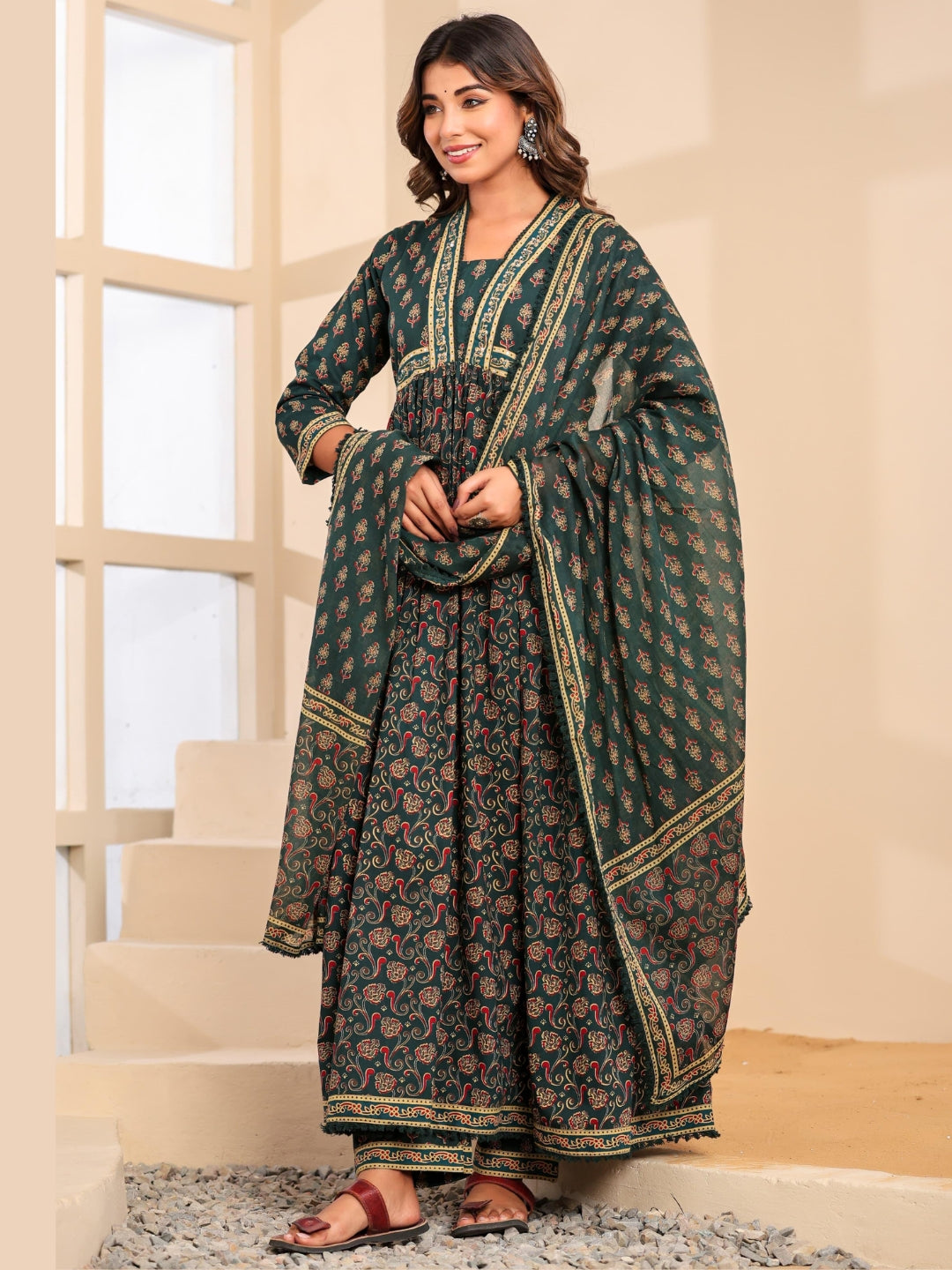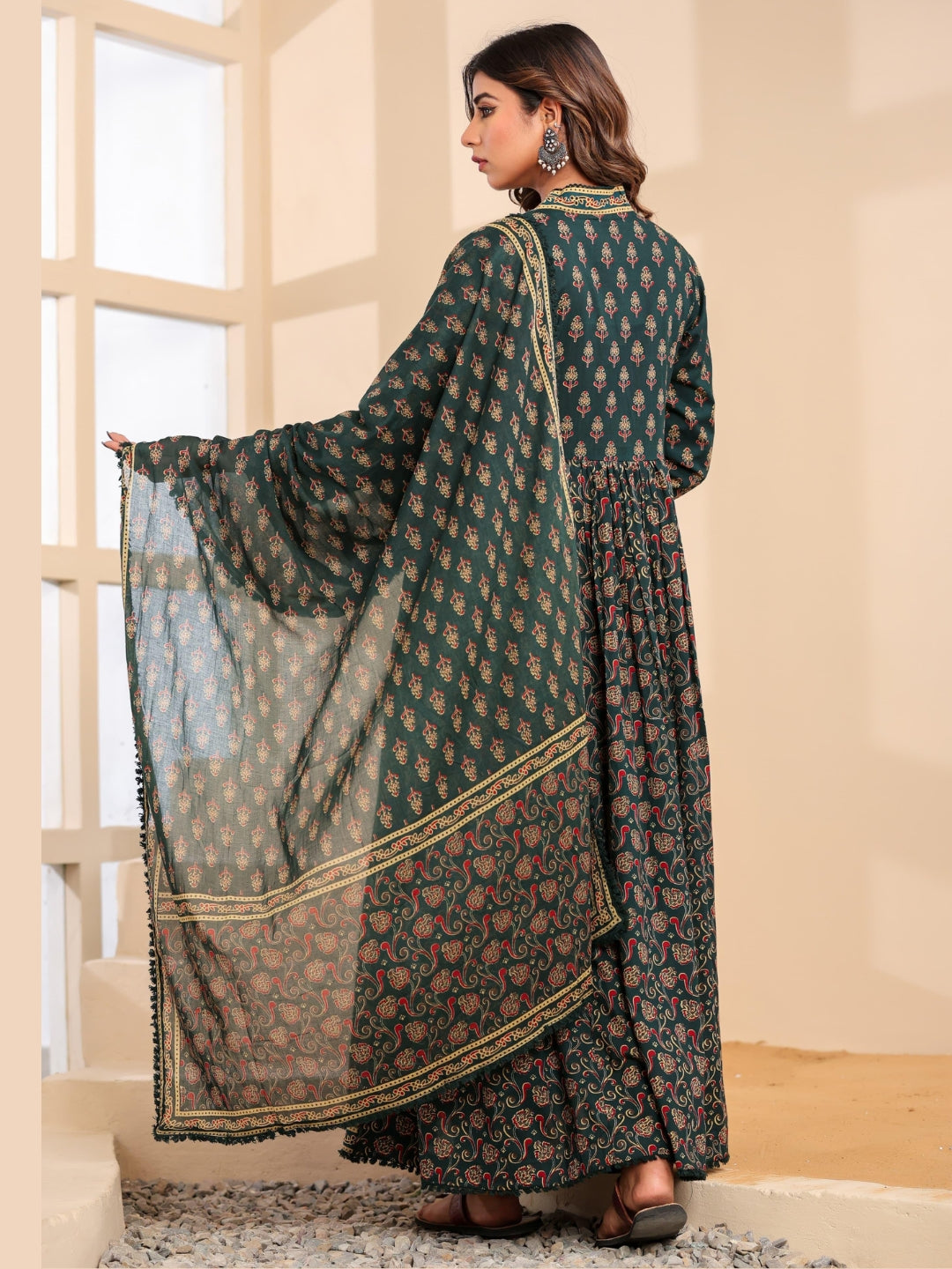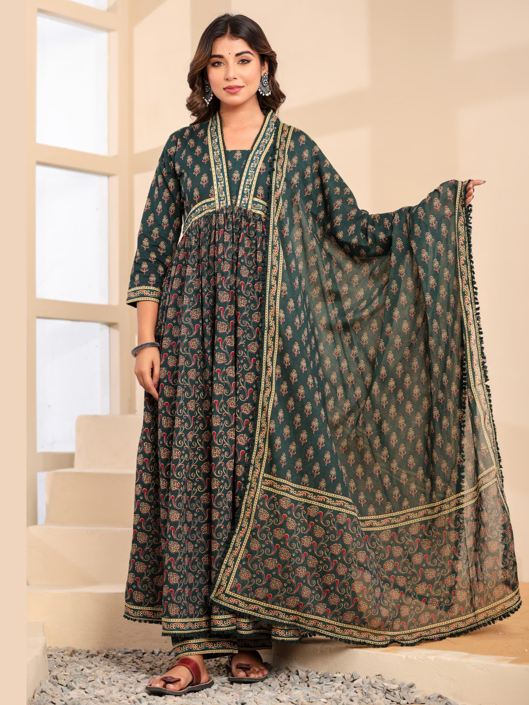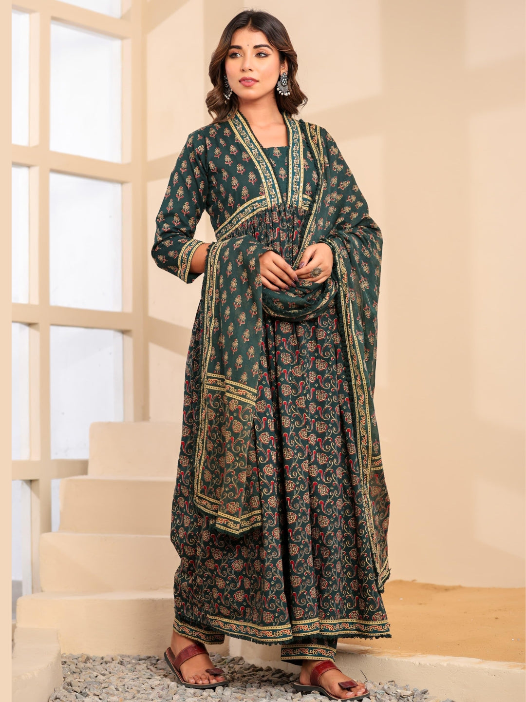 Bagru Block Print Alia Style Anarkali Kurta Set with Fringed Dupatta & Floral Motifs
