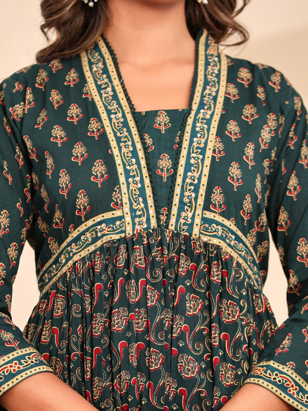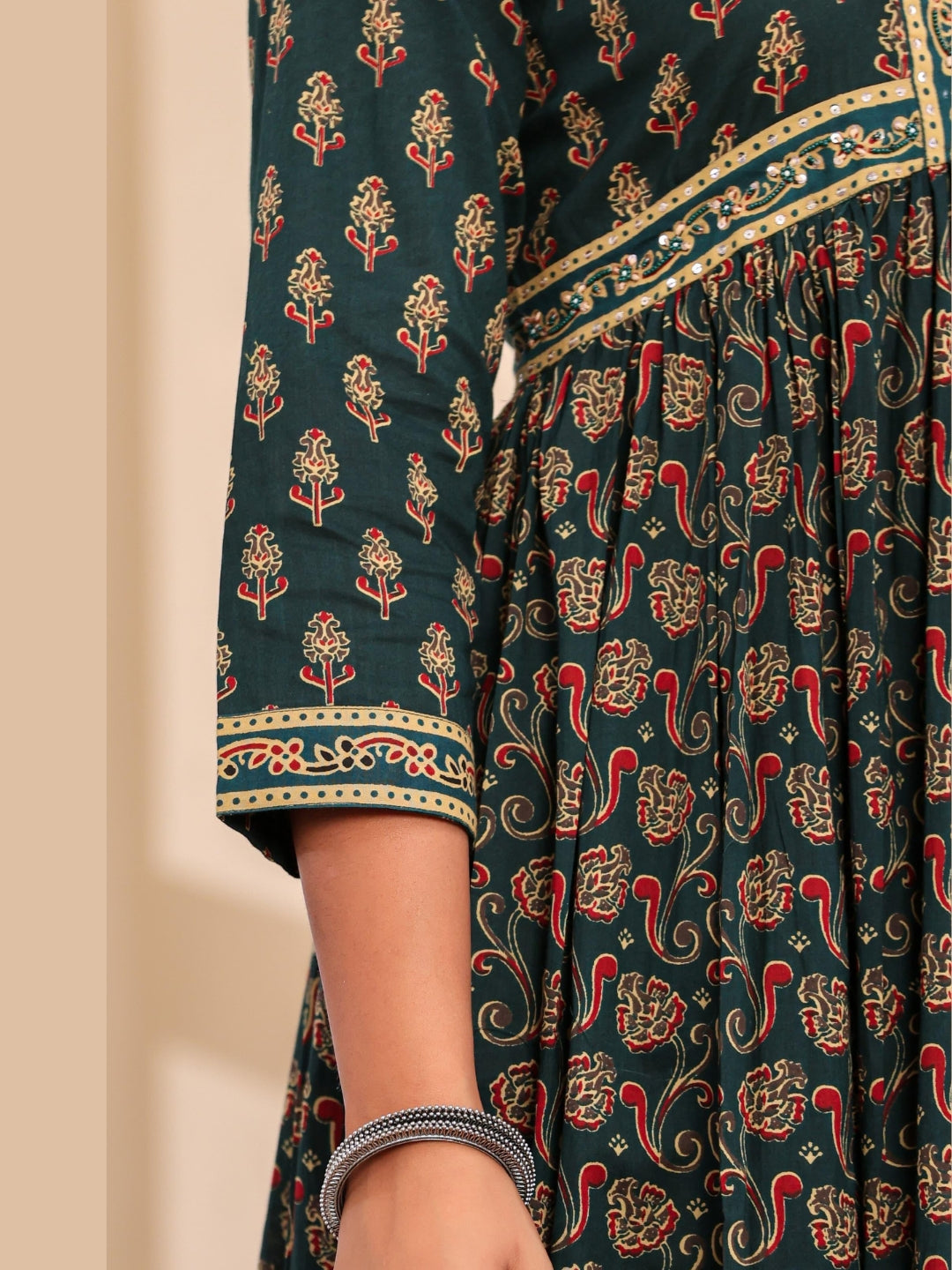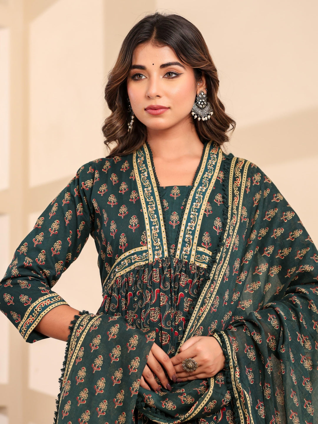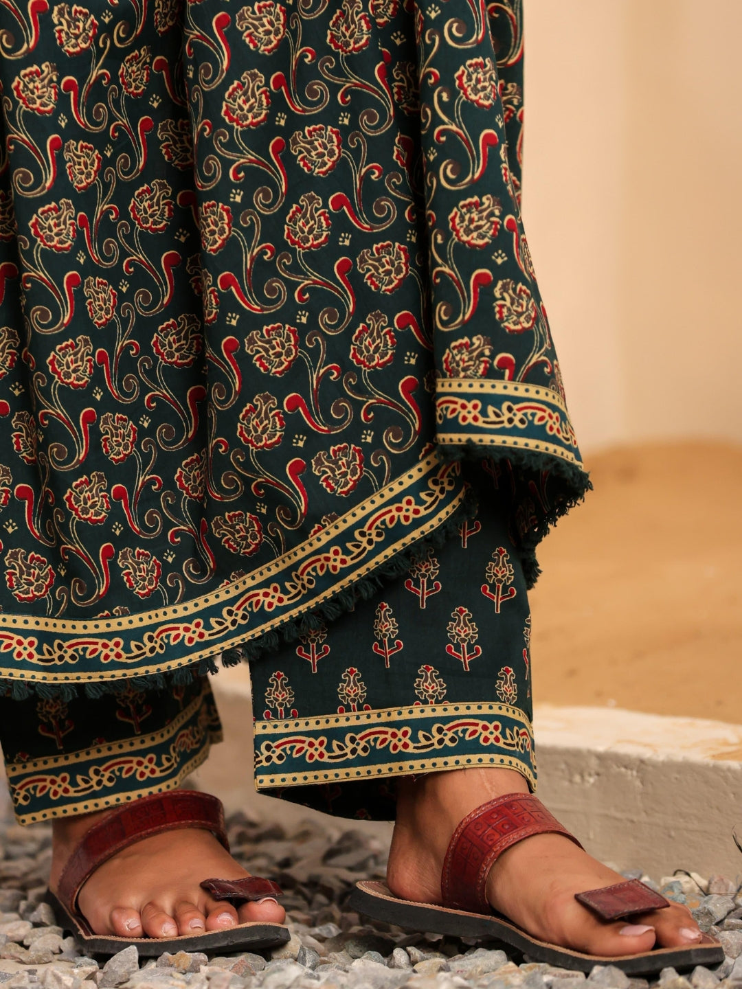 Bagru Block Print Alia Style Anarkali Kurta Set with Fringed Dupatta & Floral Motifs