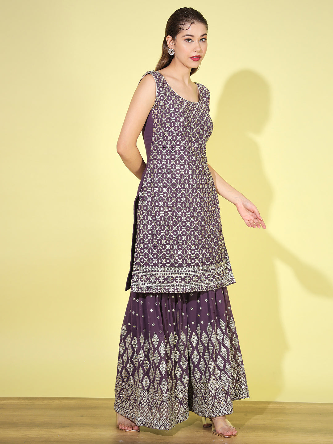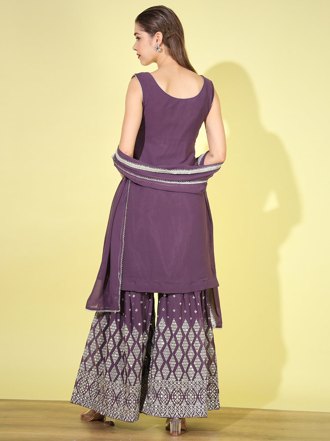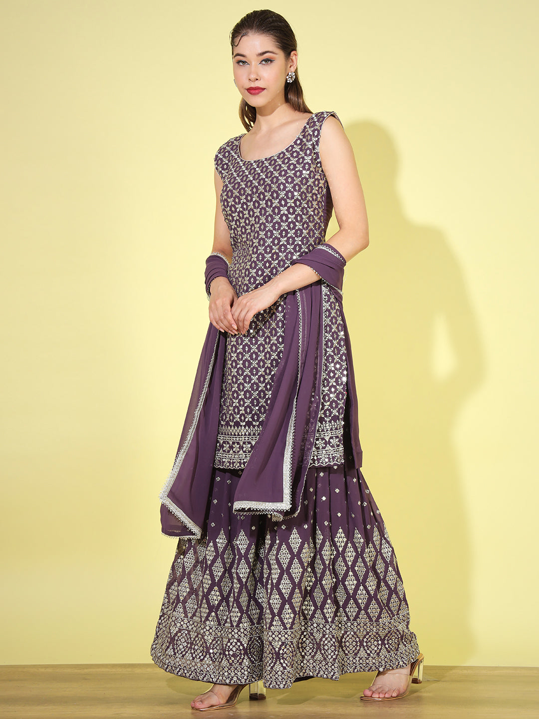 Purple Mirror Embellished Kurta with Embroidered Sharara & Dupatta