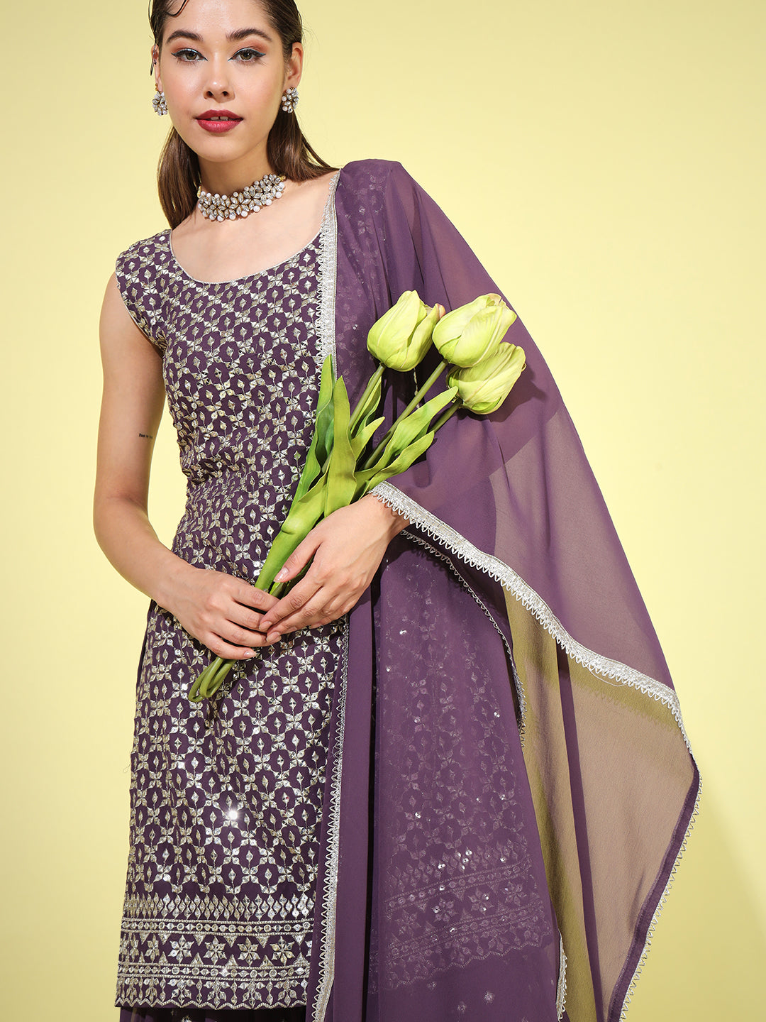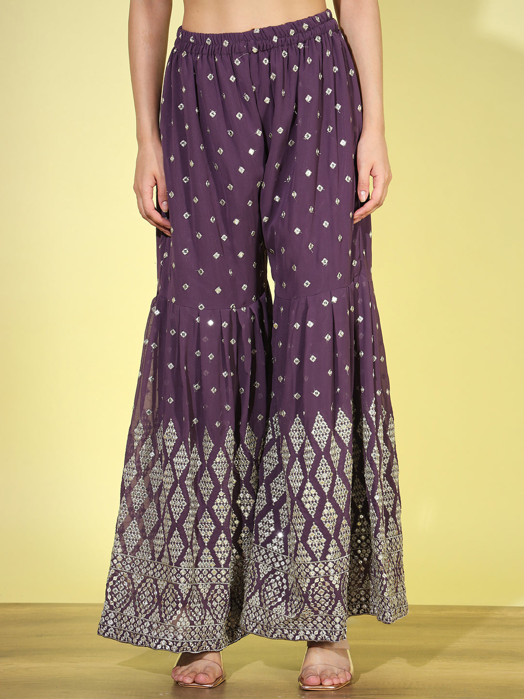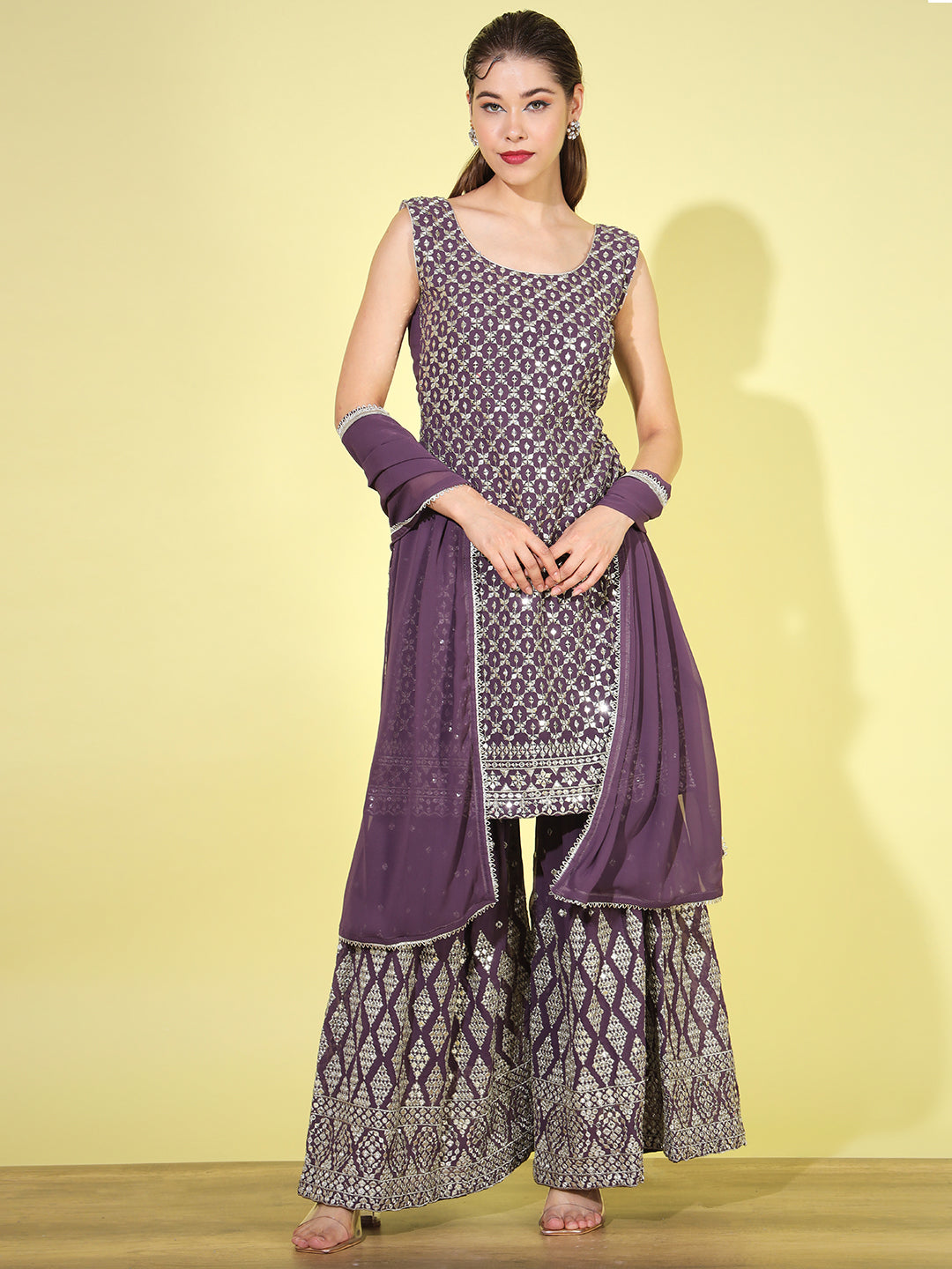 Purple Mirror Embellished Kurta with Embroidered Sharara & Dupatta