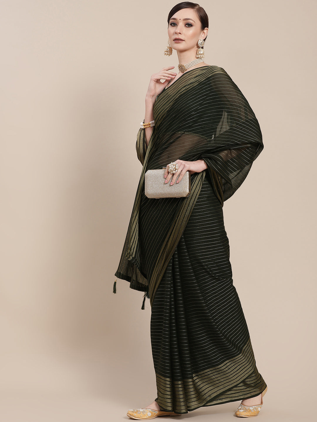 Bottle Green Chiffon Swarovski Embelllished Striped Weaving Saree