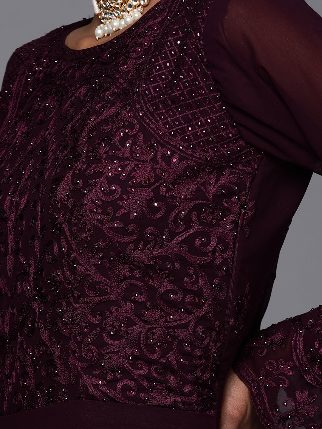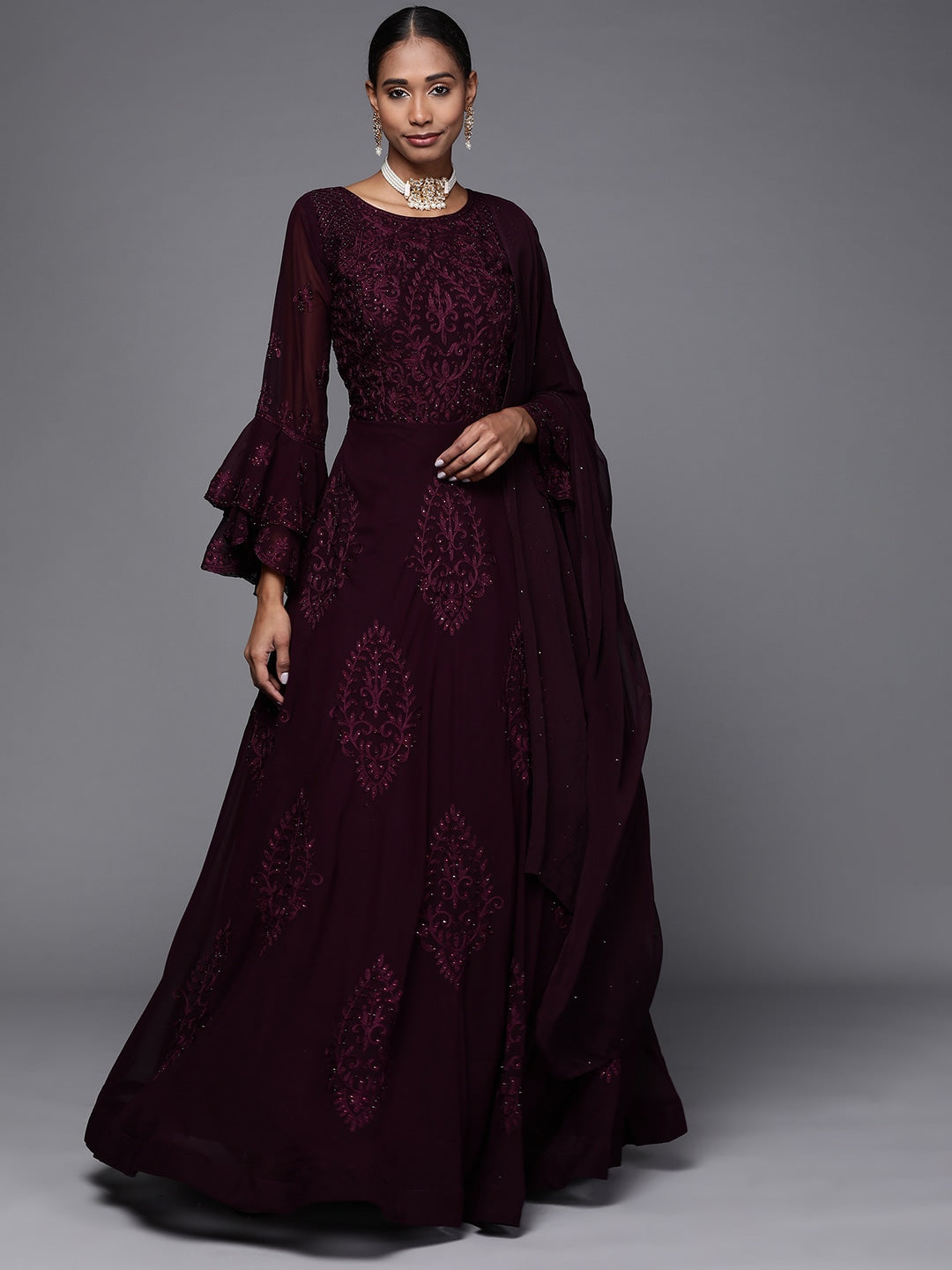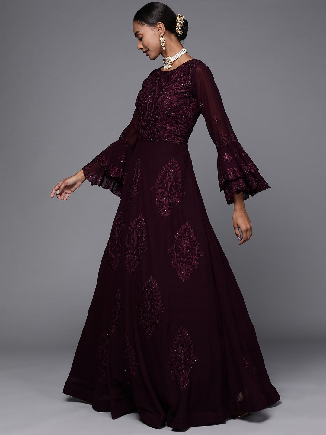 Burgundy Embellished Cocktail Gown with Resham Embroidery & Bell sleeves