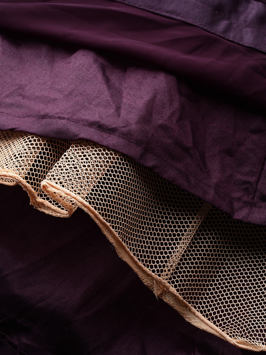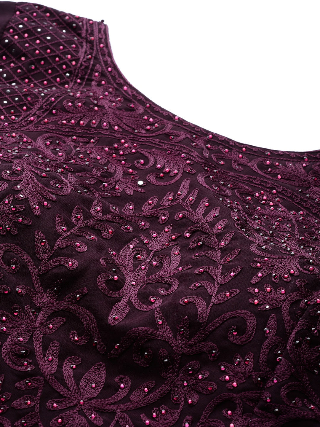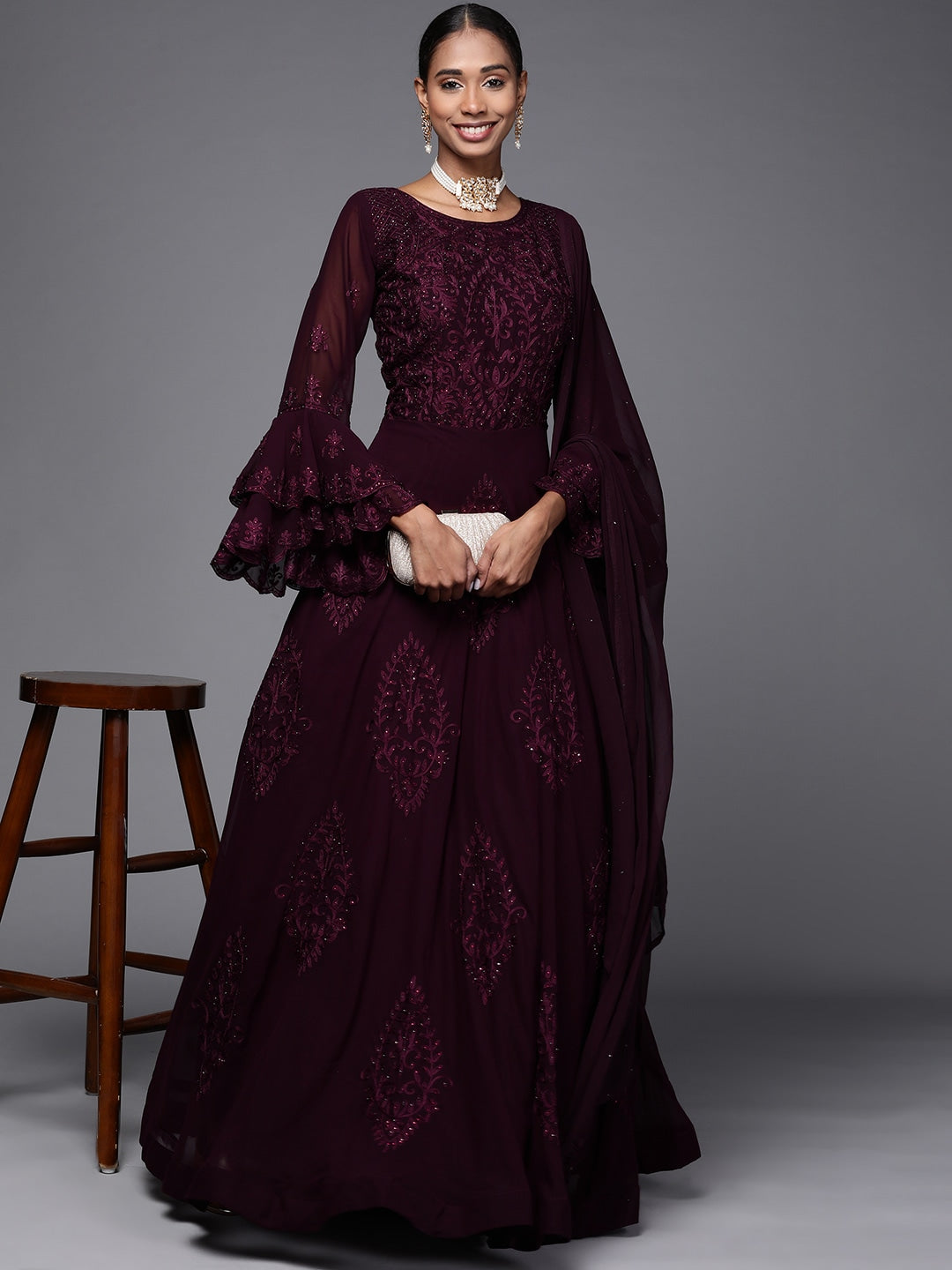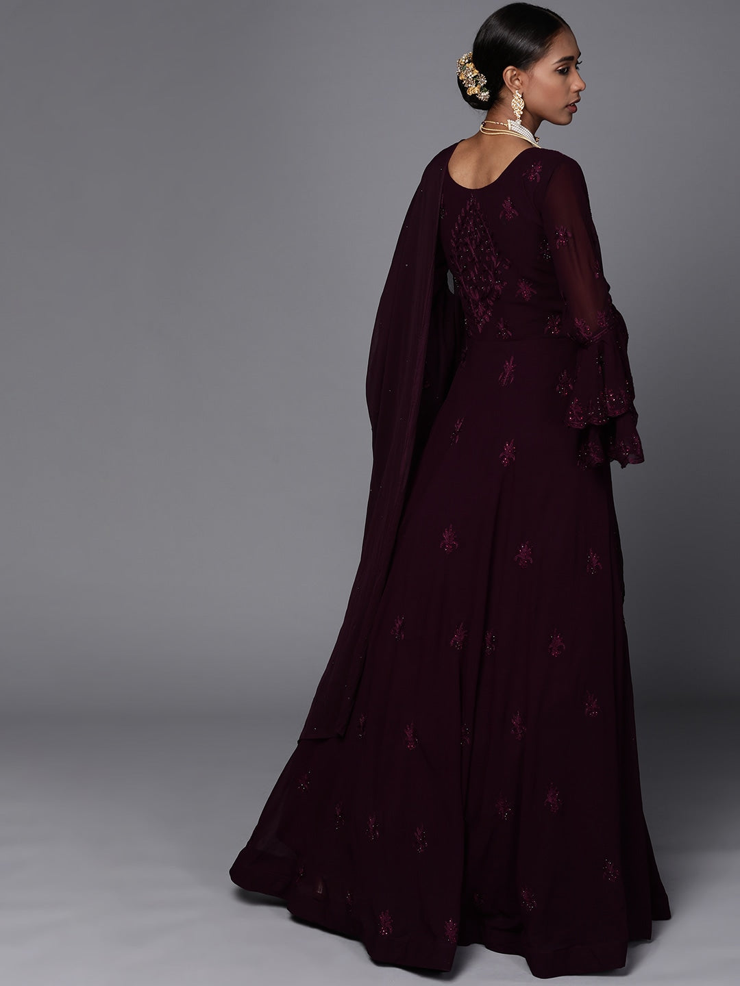 Burgundy Embellished Cocktail Gown with Resham Embroidery & Bell sleeves