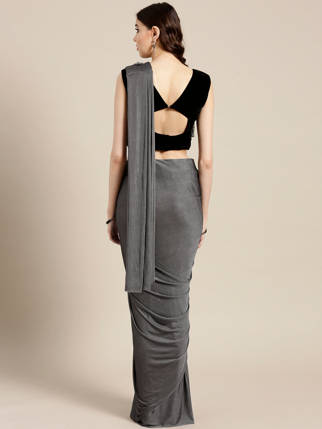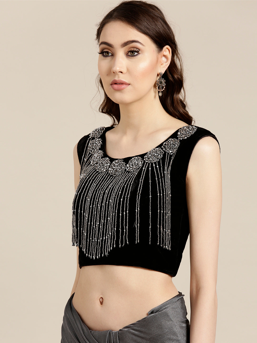 Draped Ruffled Pre-stitched Saree with Embellished Velvet Tassled Crop Top Blouse
