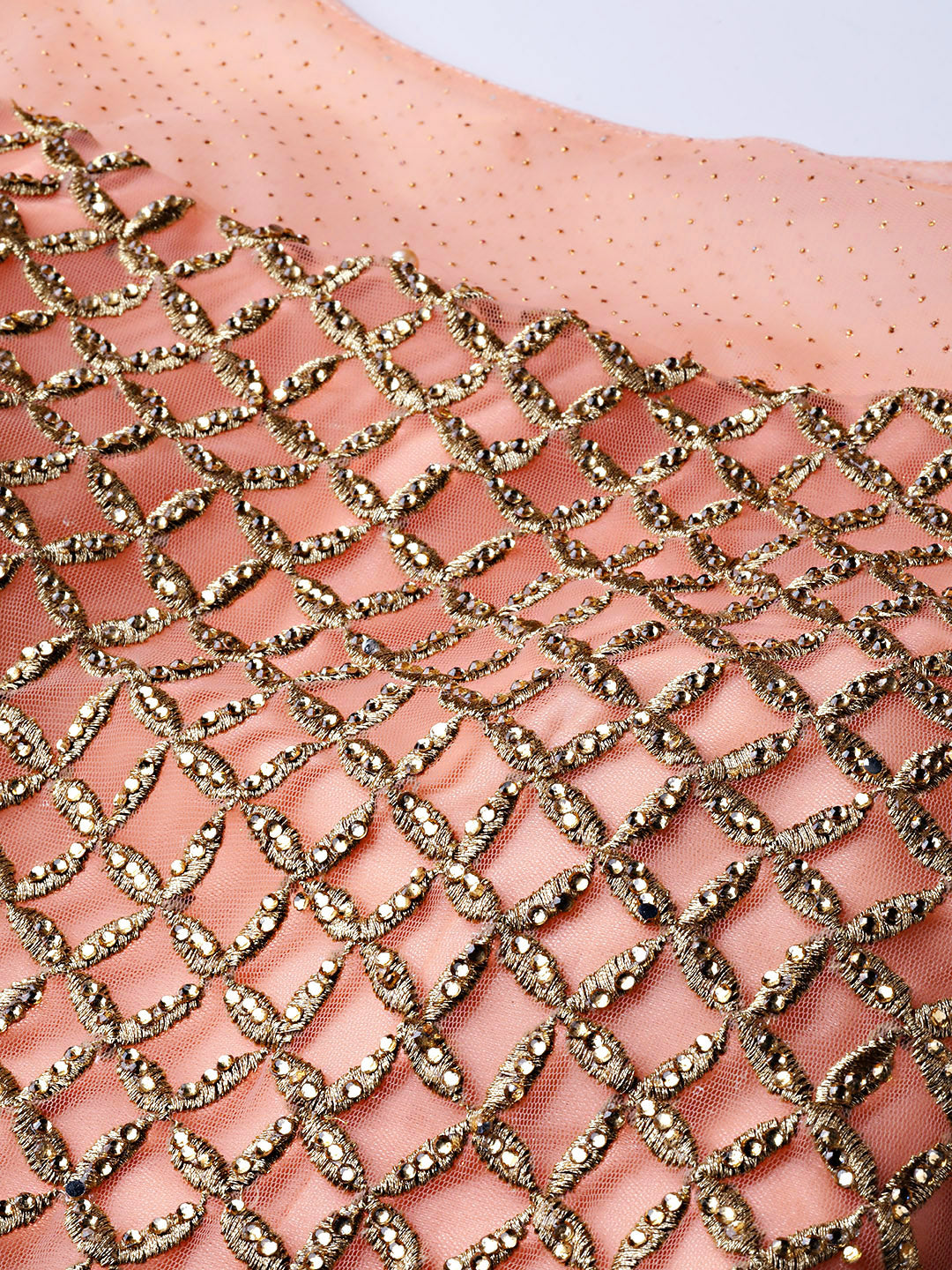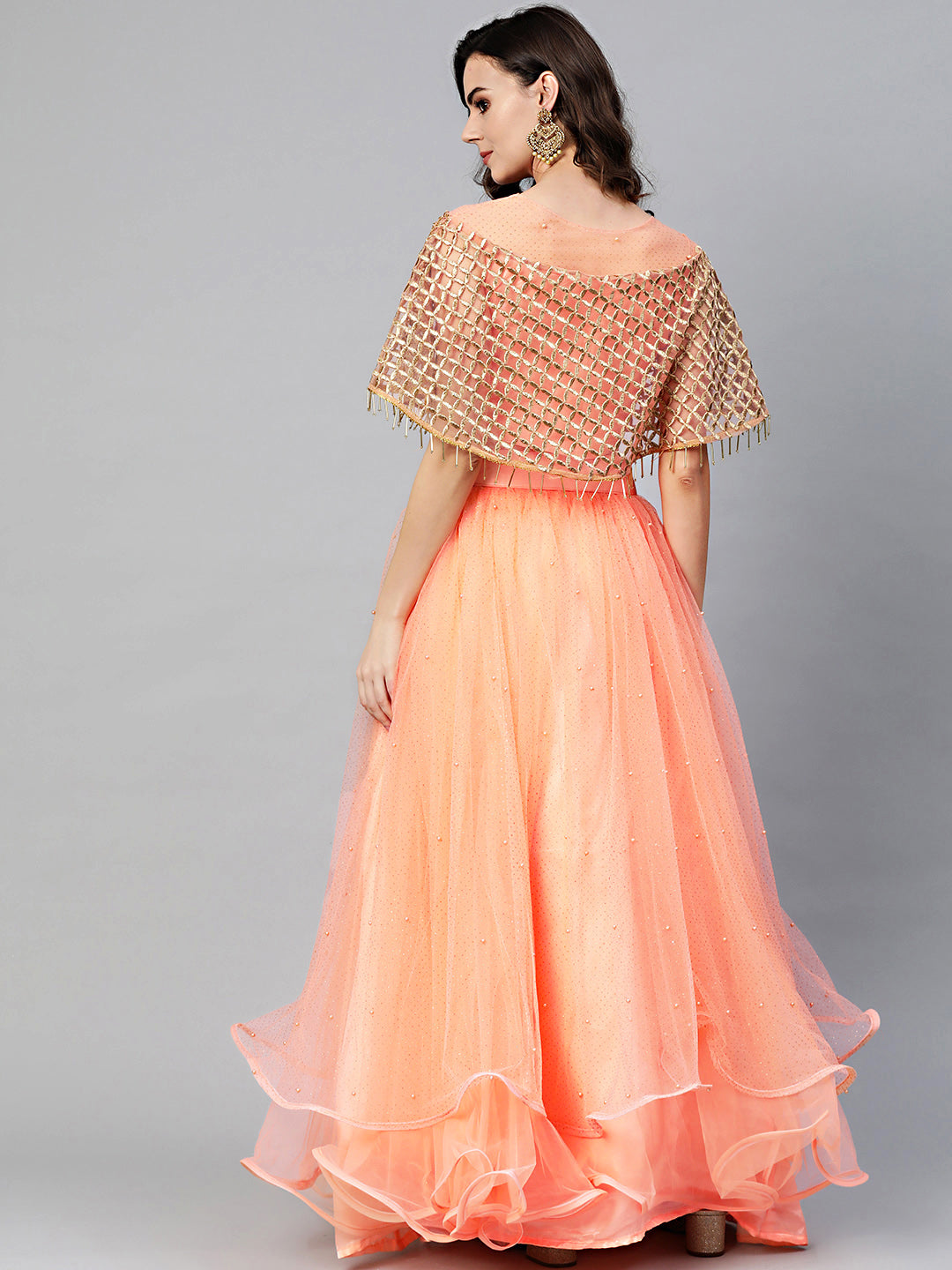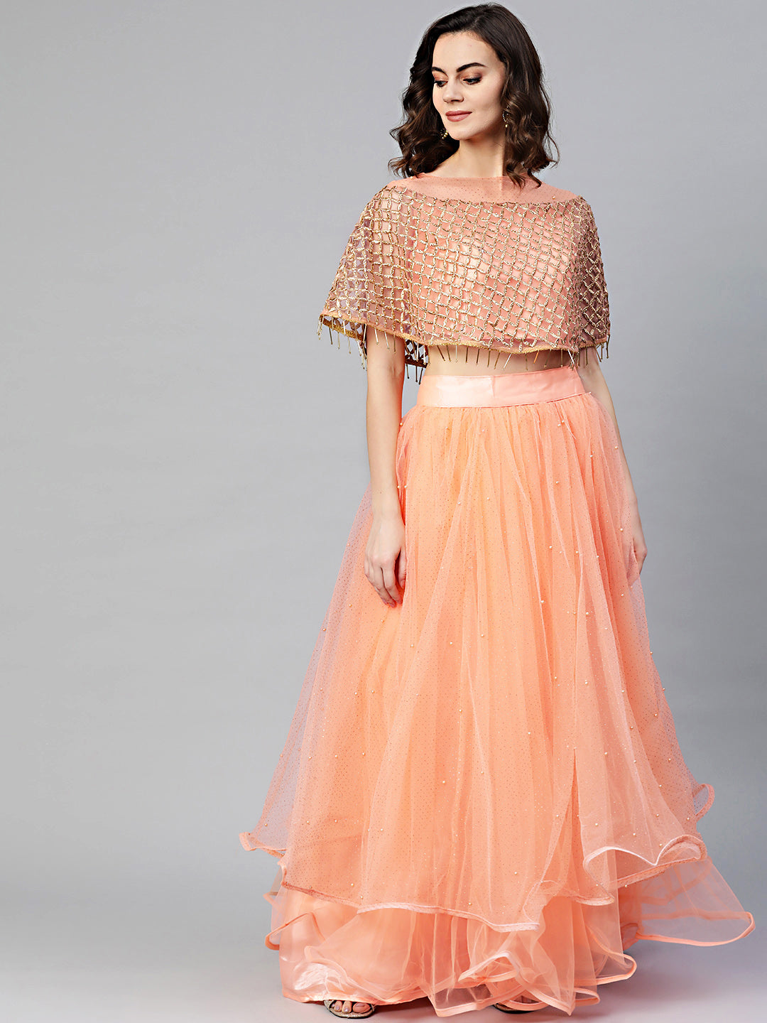 Cape Style Tassled Crop Top Blouse and foil print layered lehenga
