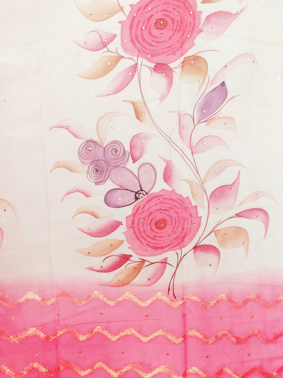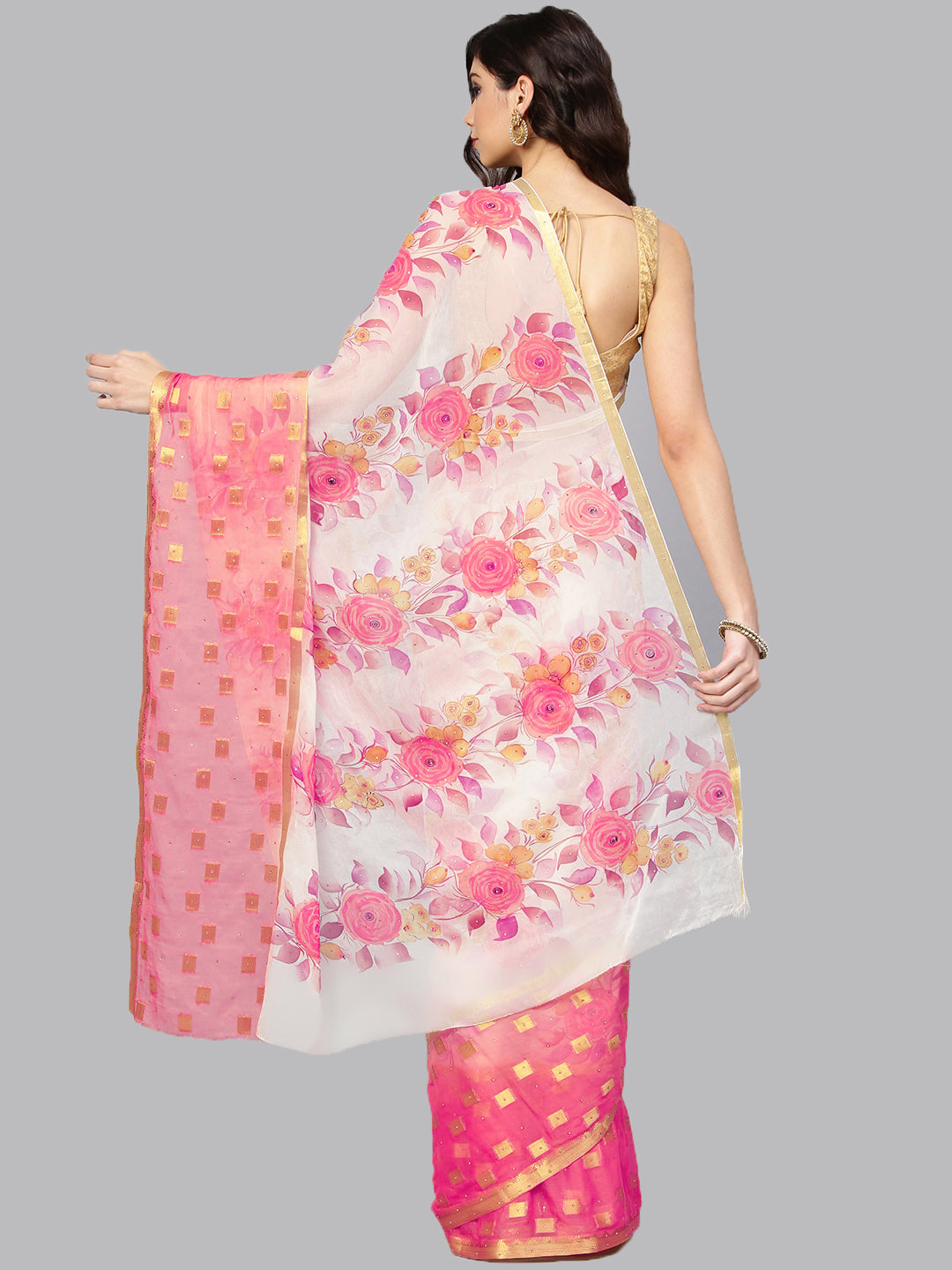 Pastel Chiffon Ombre Pink Saree with Floral hand Painting and Handloom Woven Design