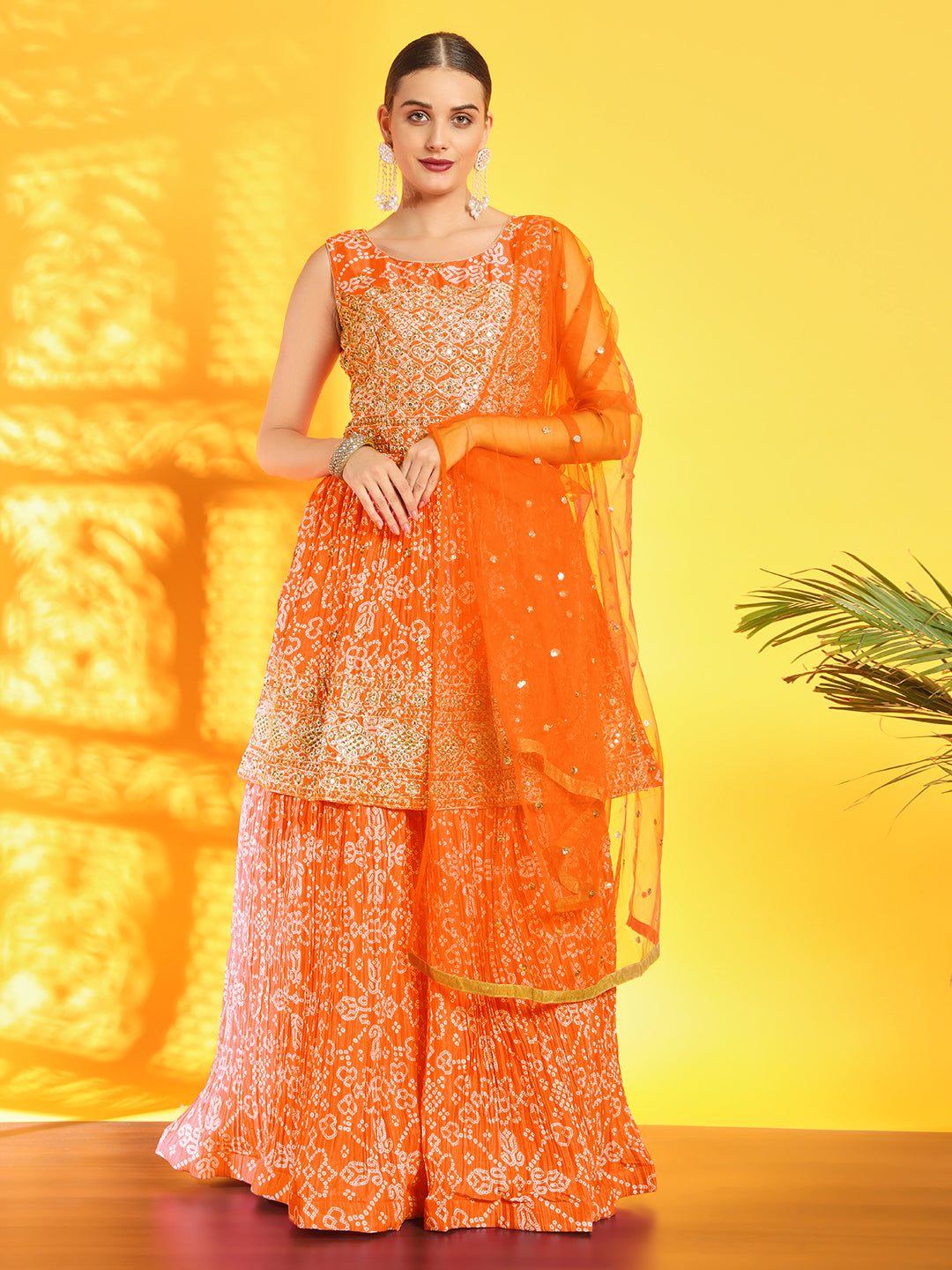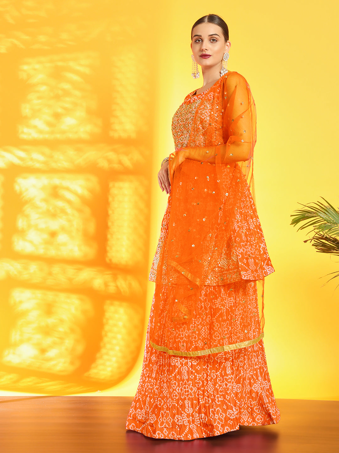 Bandhani Print Pleated Lehenga with Peplum Embroidered Kurta & Sequinned Dupatta