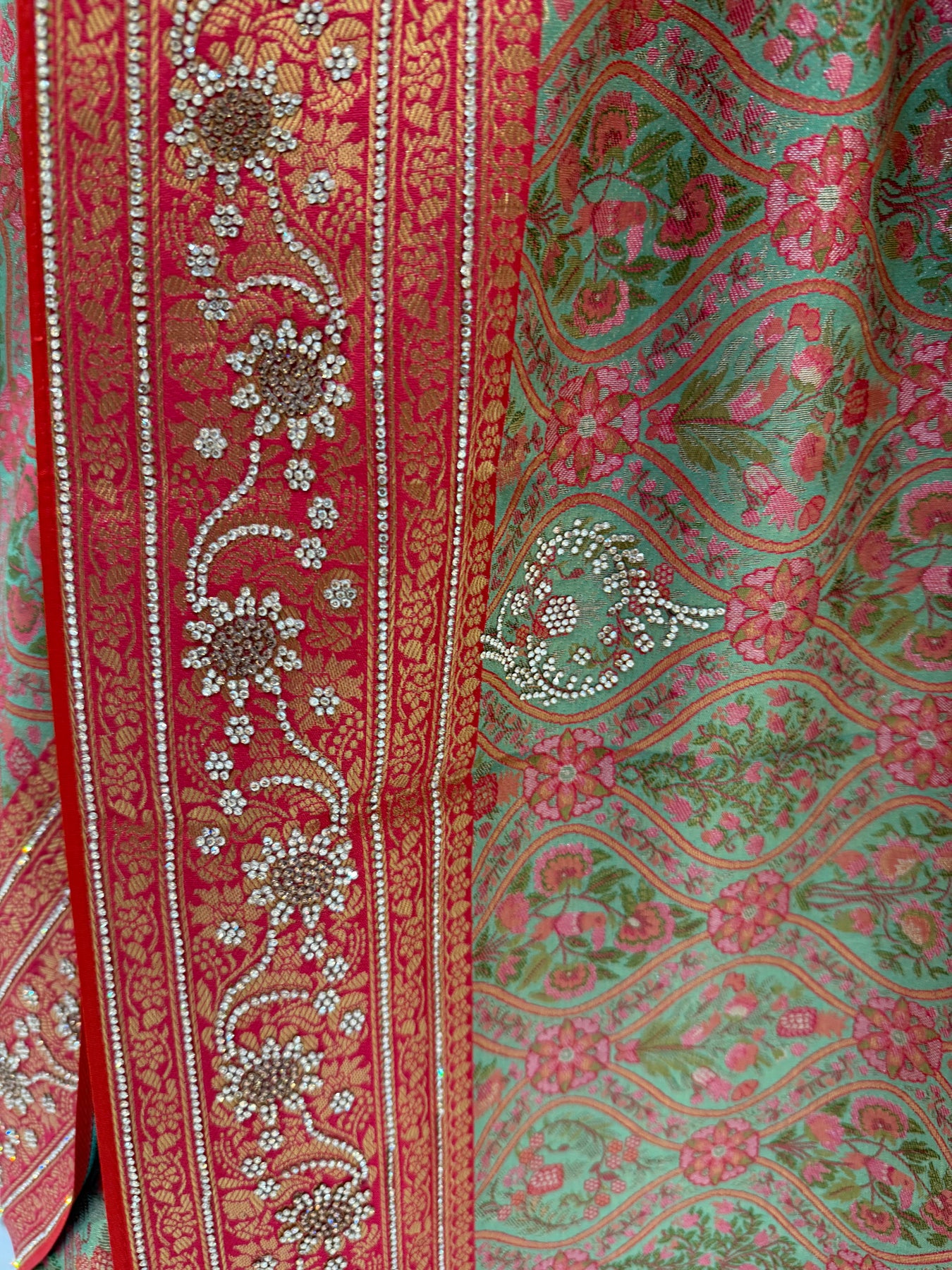 Elevate your ethnic wardrobe with this stunning Olive Green Banarasi saree, a timeless masterpiece of traditional Indian weaving. Crafted with intricate floral zari work, this saree showcases the finest craftsmanship of Banarasi silk weaving. The rich olive green base provides a sophisticated, versatile canvas, while delicate gold zari patterns create an ornate floral design that catches light beautifully. The striking red border adds a bold contrast, framing the saree with elegance and traditional charm.