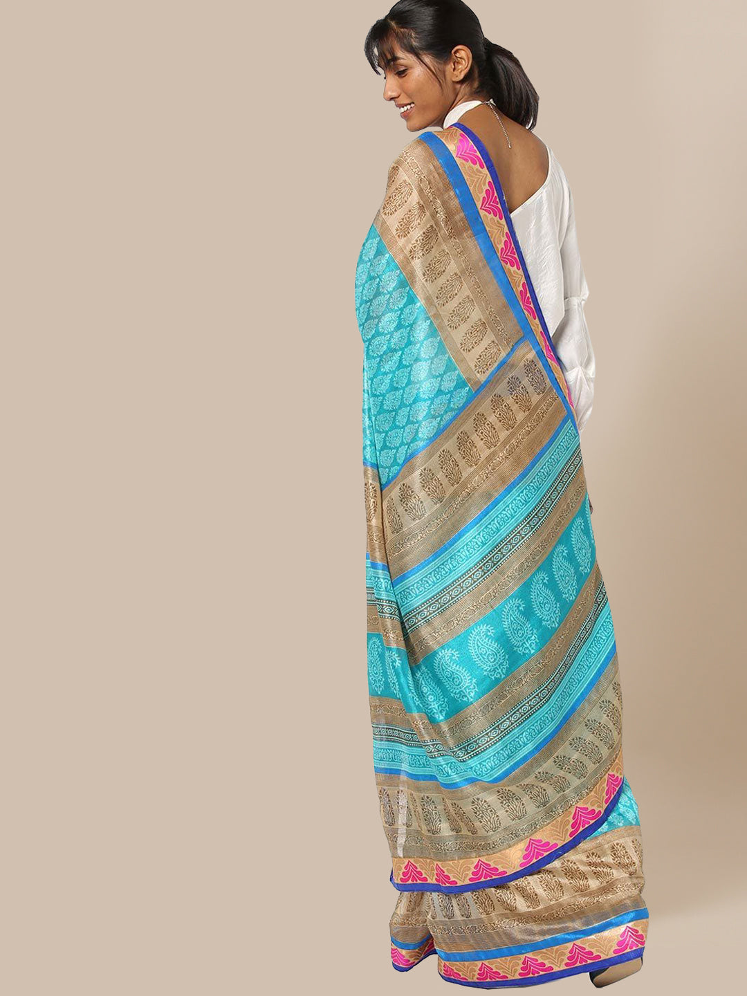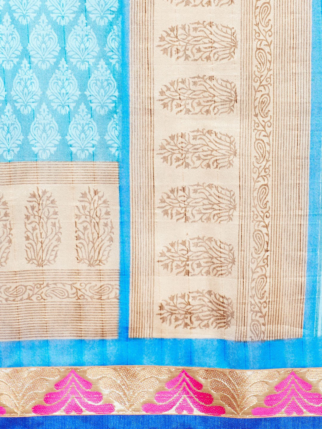 Turquoise Blue & Beige Coloured Cotton Silk Saree