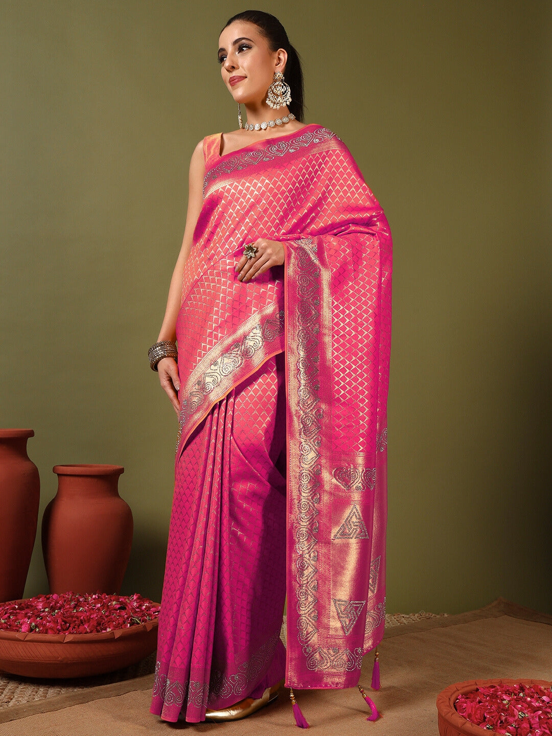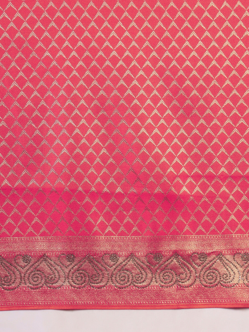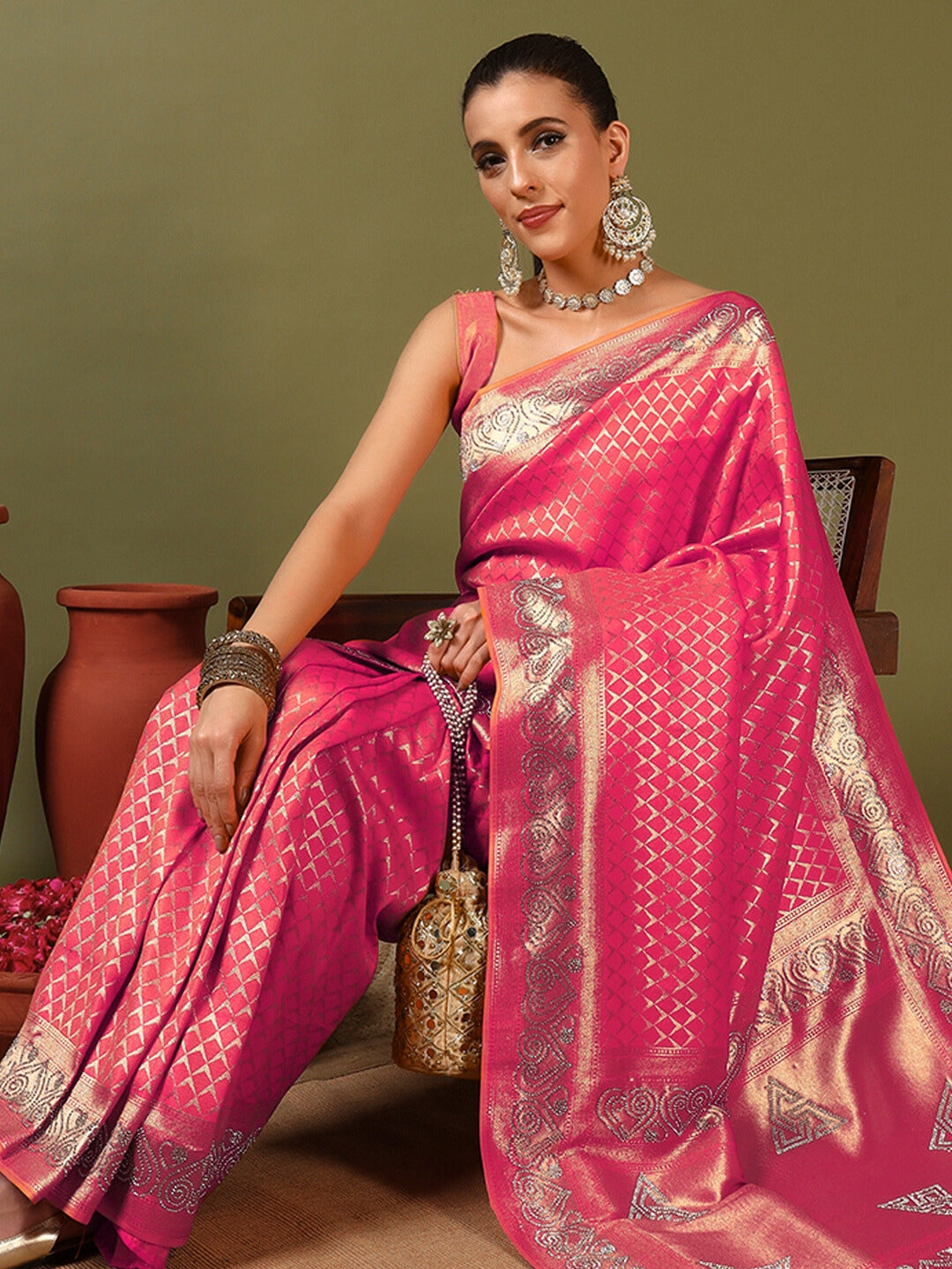 Banarasi Handloom saree with Lattice Weaving & Crystal Embellished Heart Motif Border