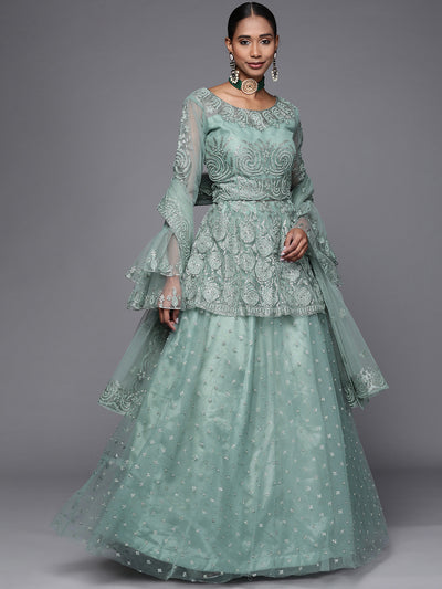 Chhabra 555 Made-to-Measure Shimmer Pastel Peplum Lehenga Choli Set Embellished With Bell Sleeves