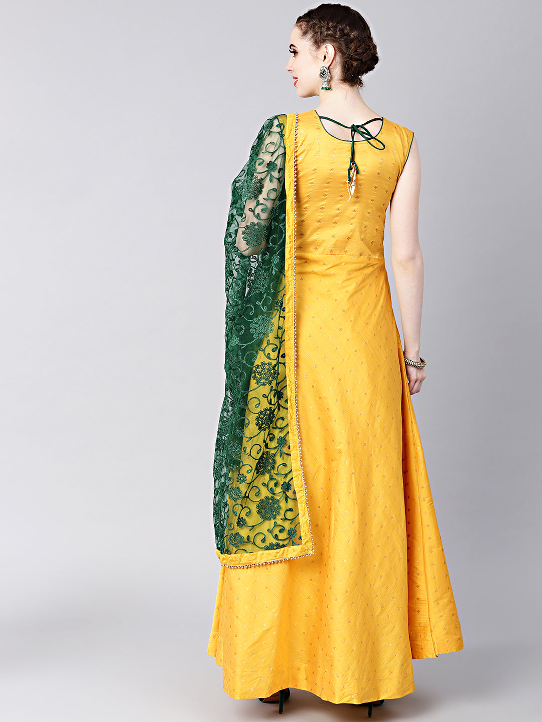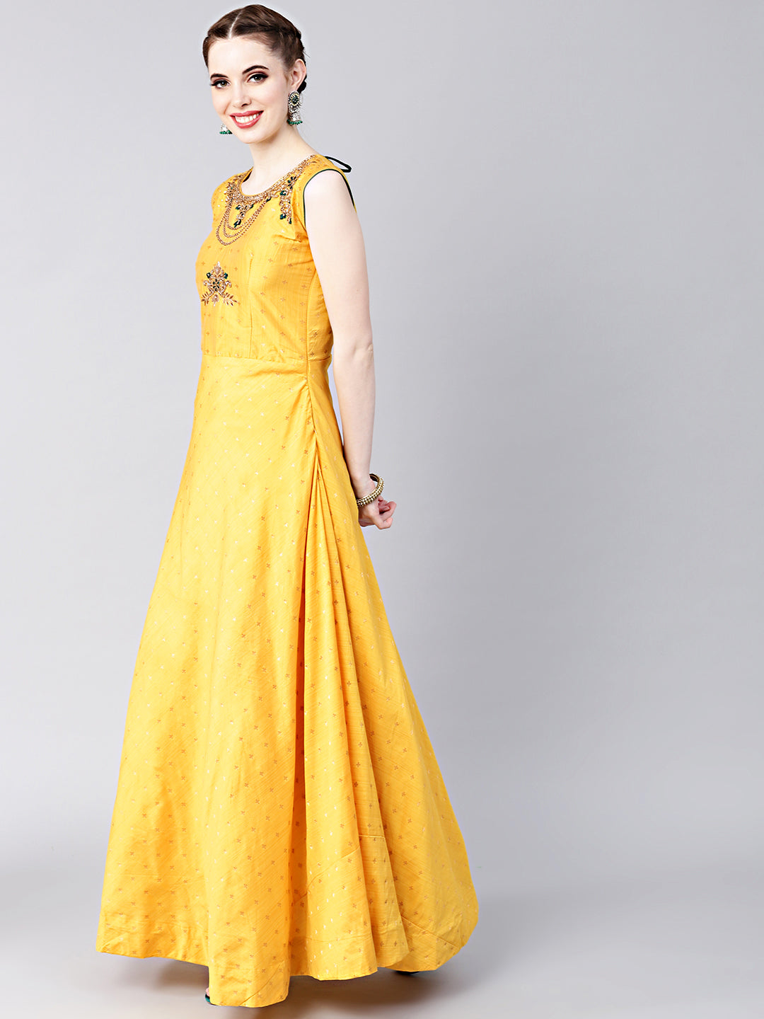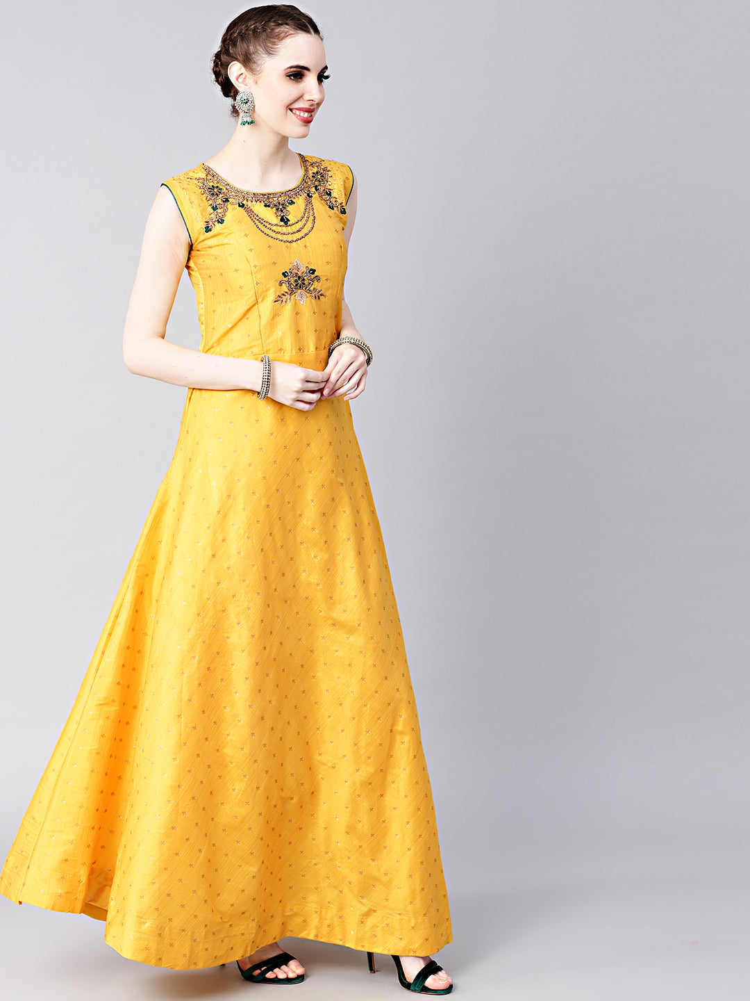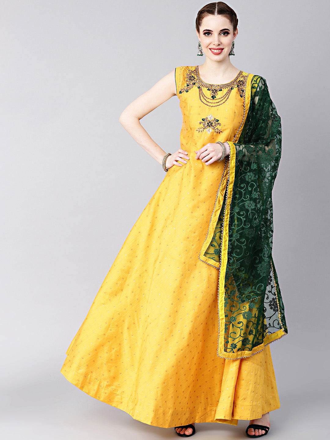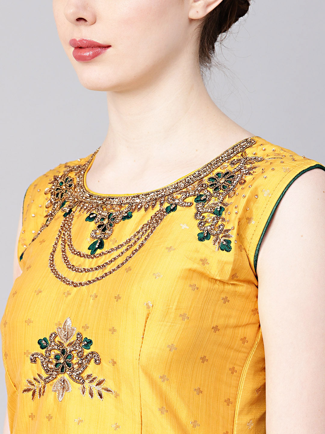 Chhabra 555 Yellow Anarkali Hand crafted Kurta Set with Jeweled Neckline and Embroidered Silk kurta