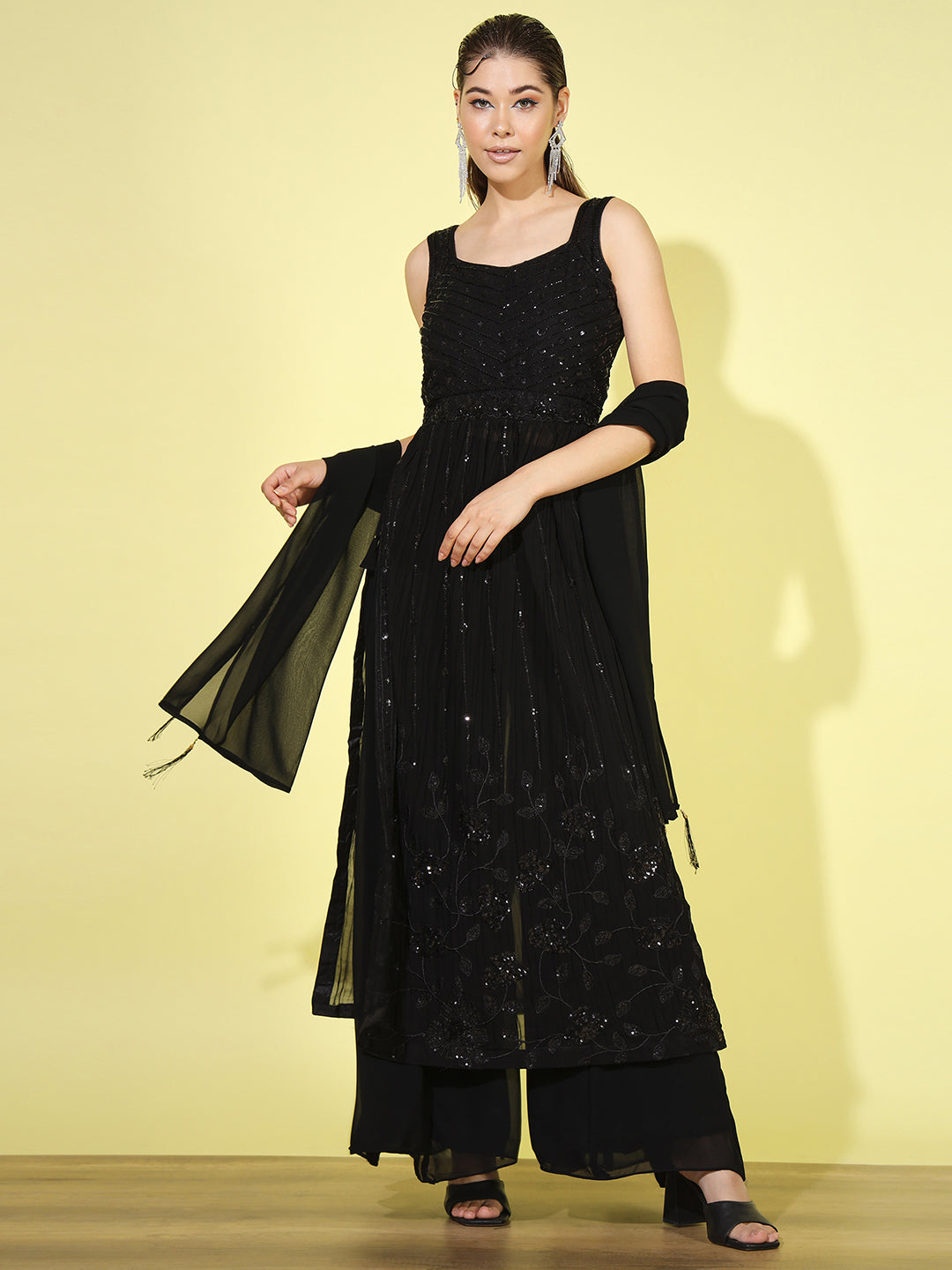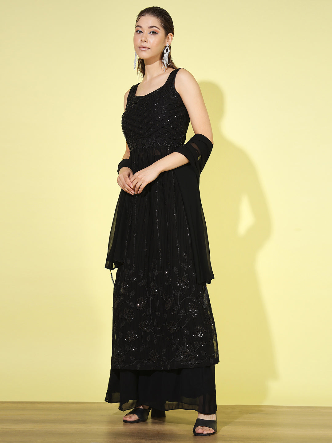 Chhabra 555 Made to Measure Black Sequence & Cutdana Embellished Georgette Pleated Nayra Cut Suit With Flared Palazzo & Dupatta