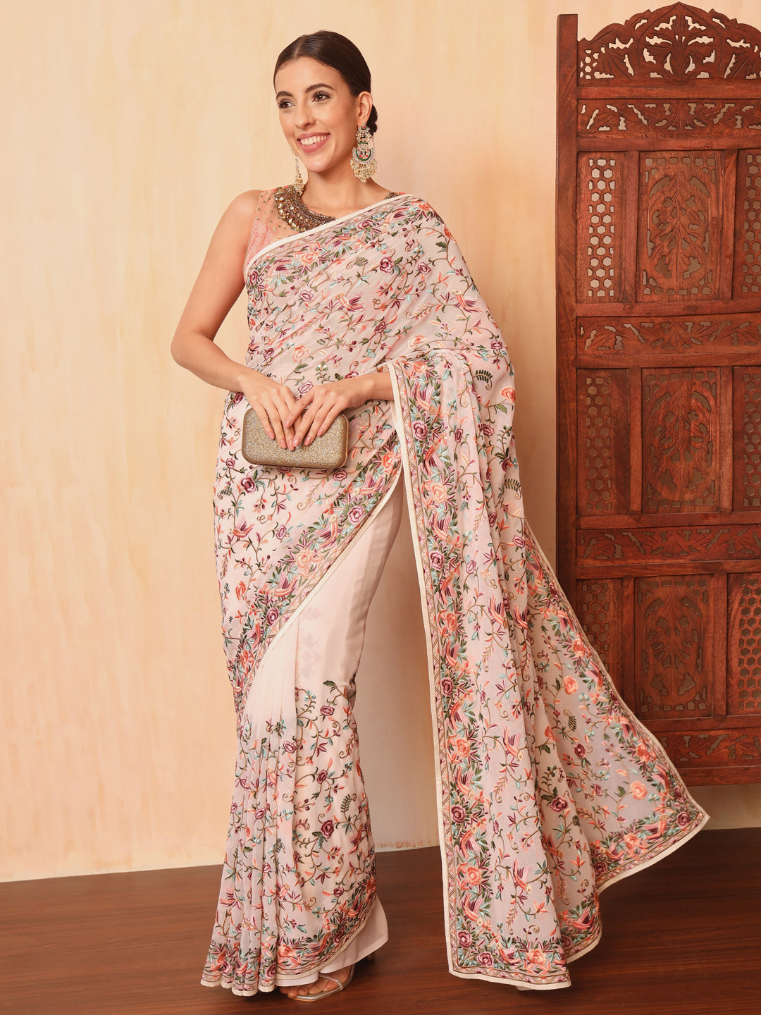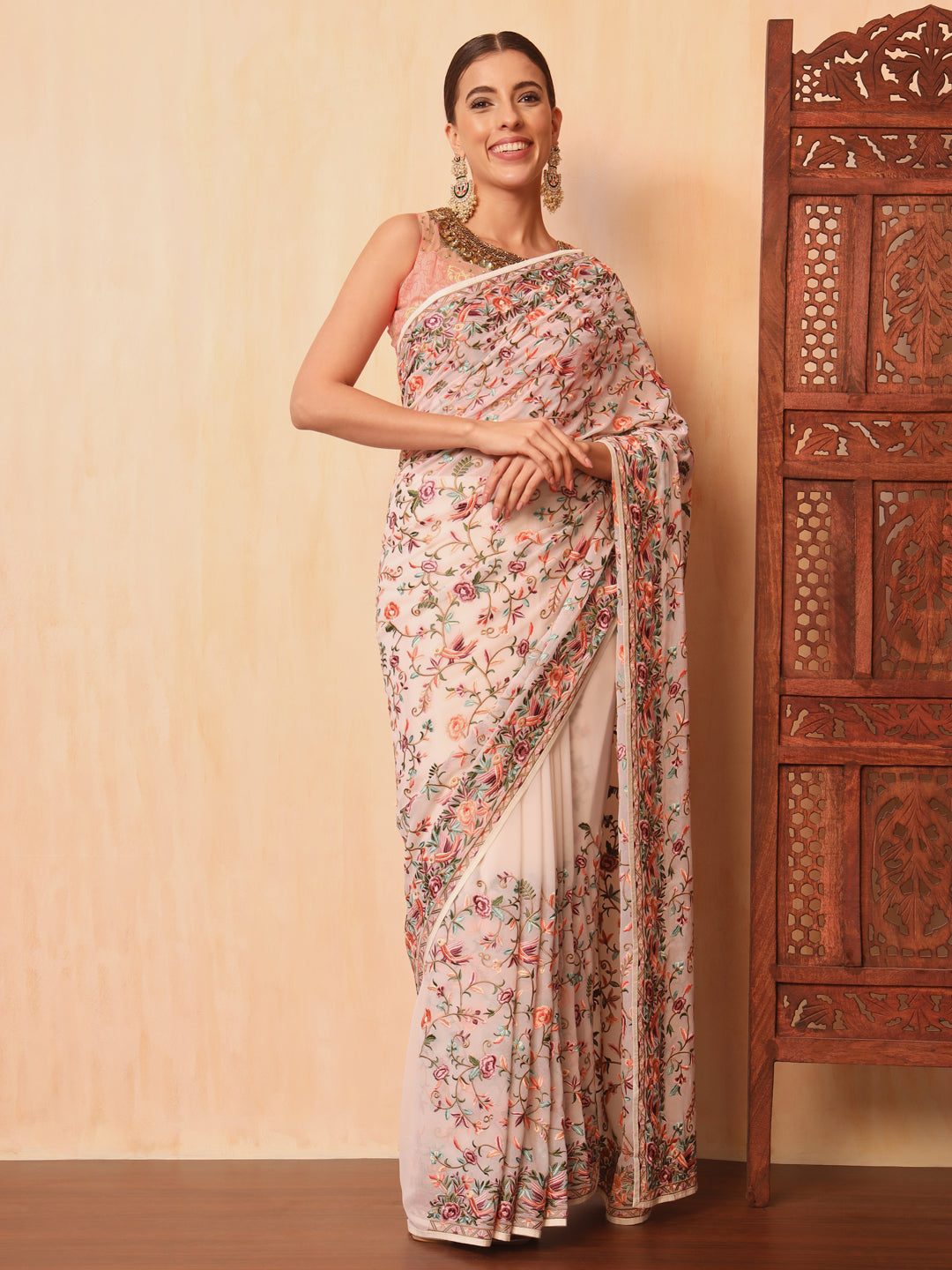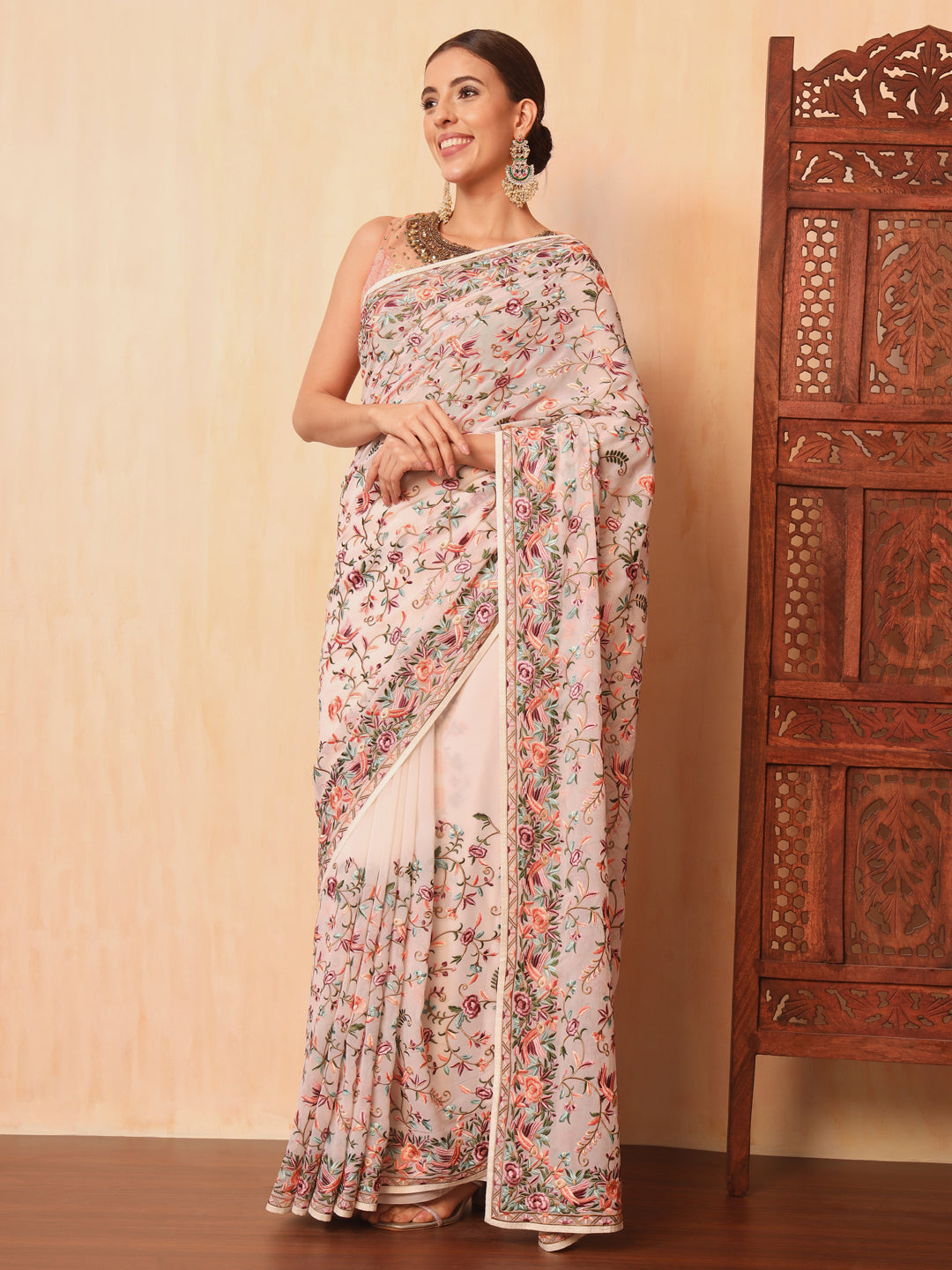 Cream Parsi Resham Embroidery Saree with Intricate Floral Motifs