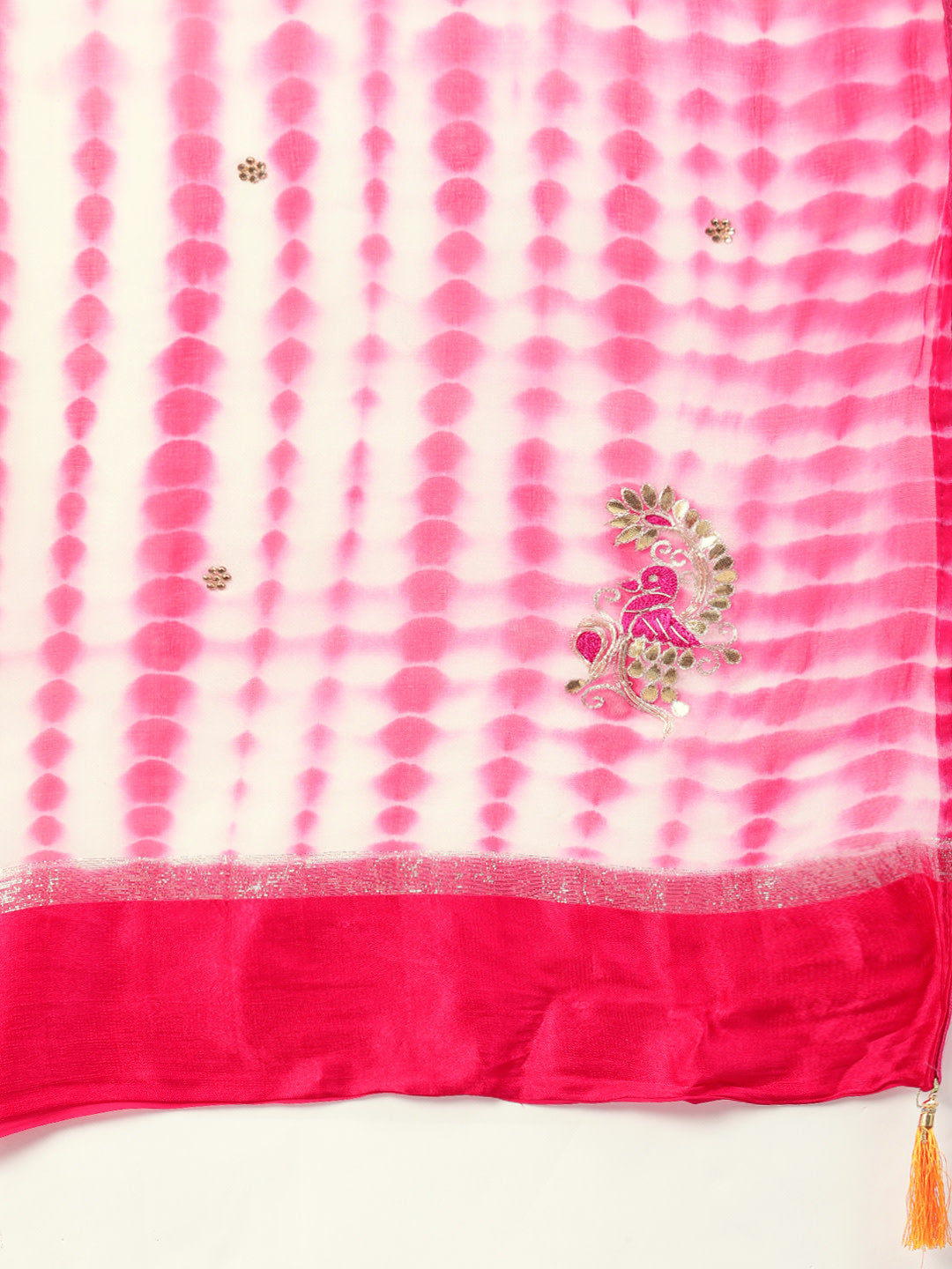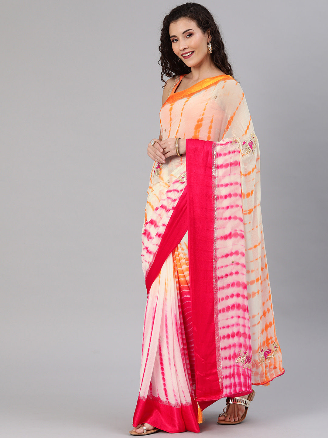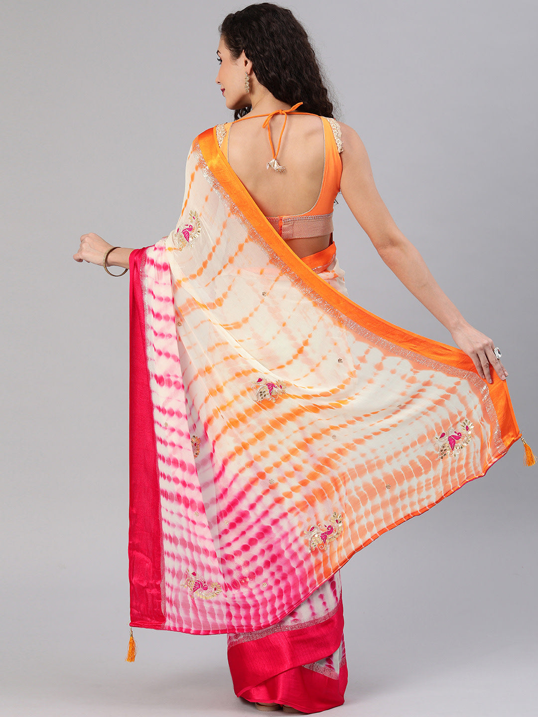 Tie And Dye Georgette Saree with Gotta Patti Peacock Motifs, Satin Border and Tassels