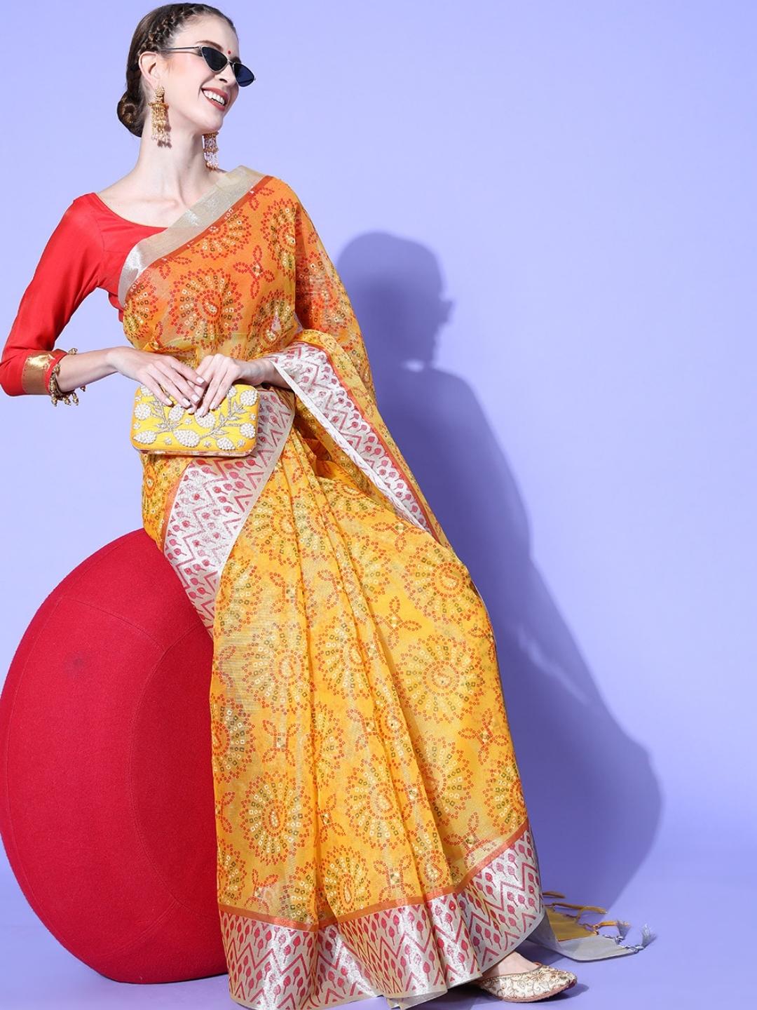 Yellow Bandhej Printed Kota Saree Embellished With Stone Work