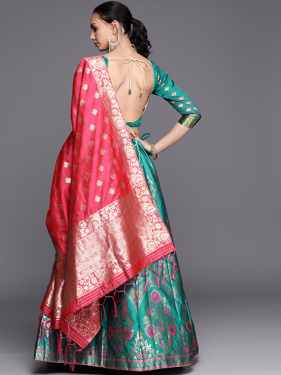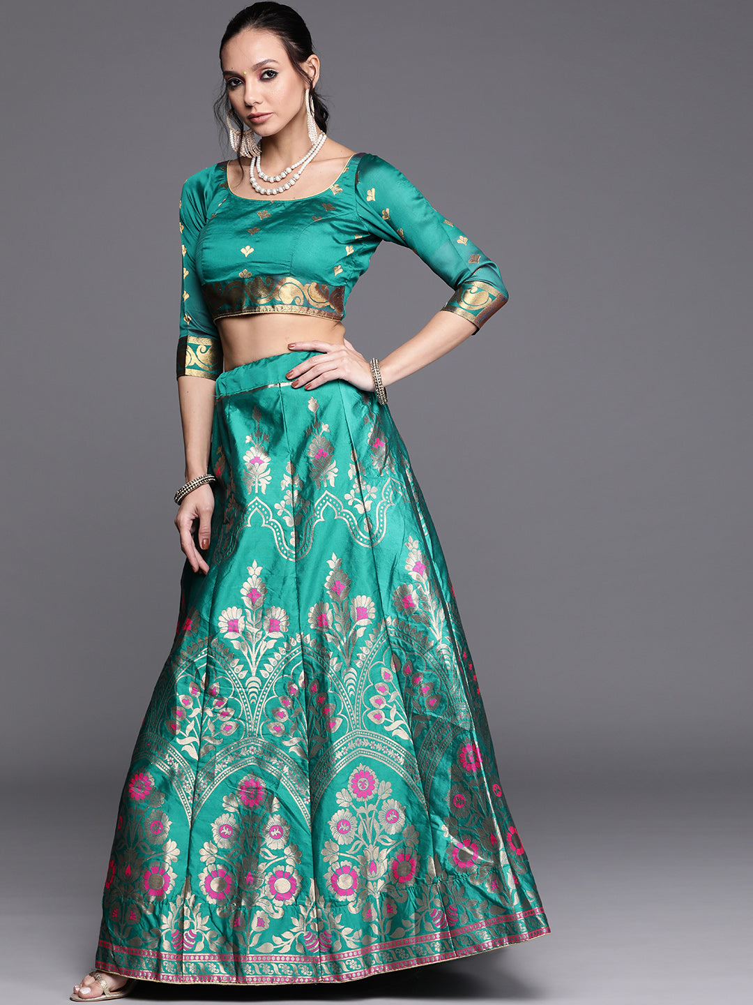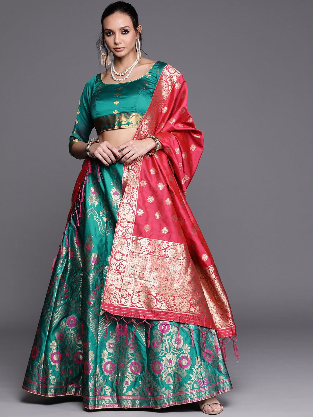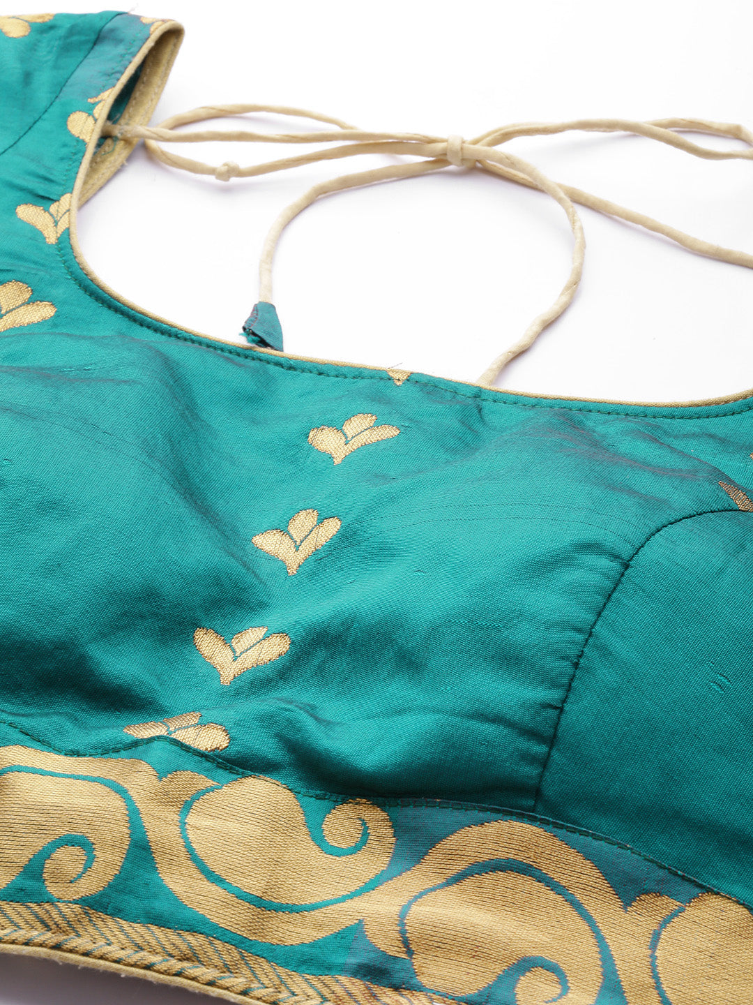 Teal Semi Stitched Banarasi Brocade Silk Lehenga Set with Floral Zari, Meenakari Weaving