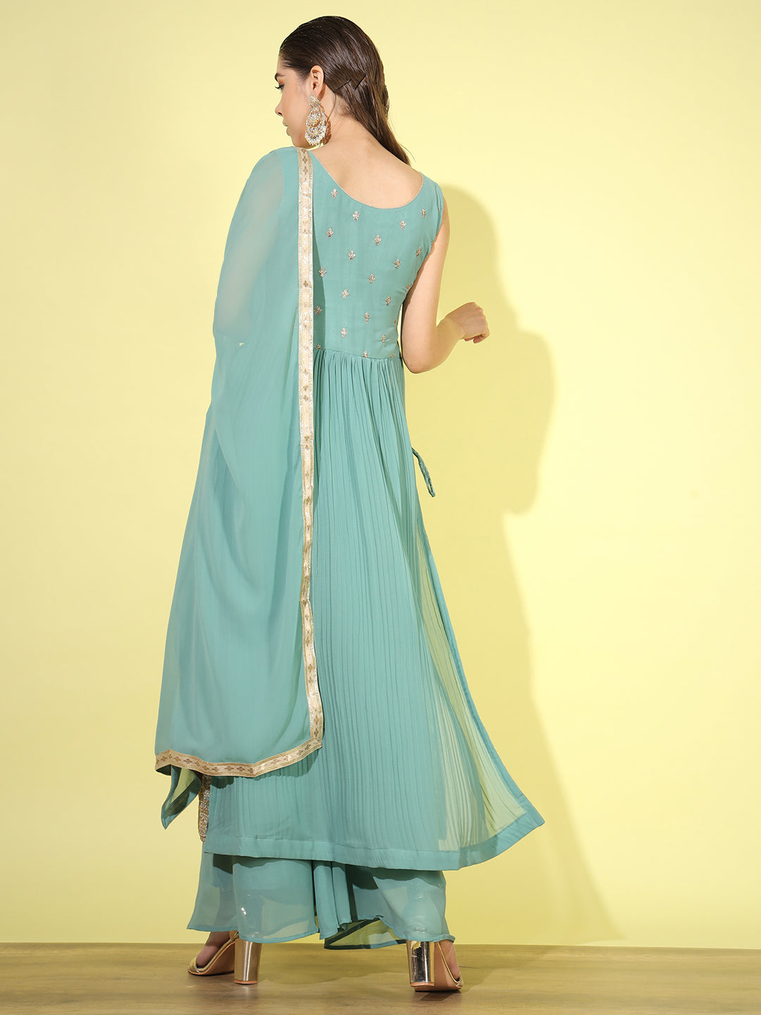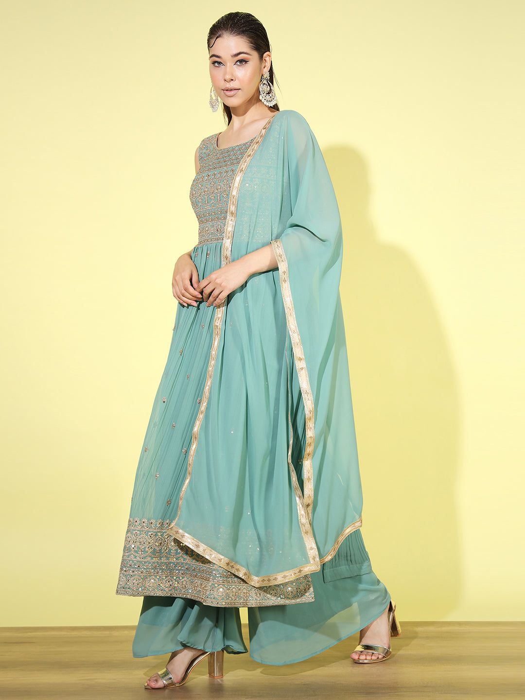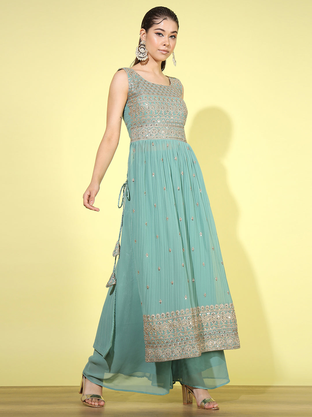 Zari Embroidered Nyraa Style High Slit Pleated Kurta Palazzo Set