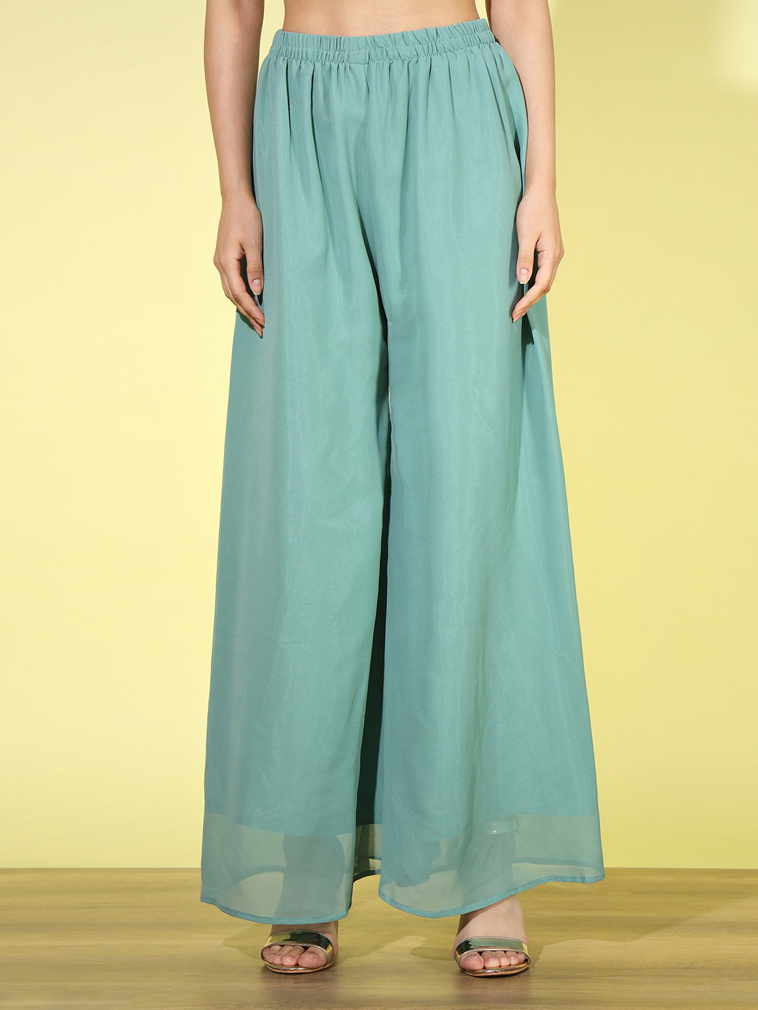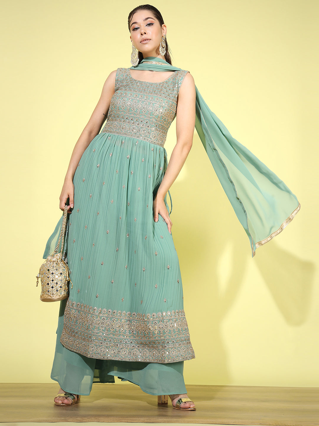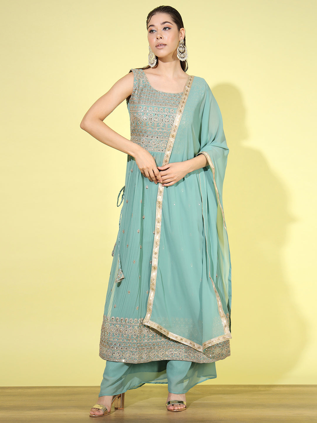 Zari Embroidered Nyraa Style High Slit Pleated Kurta Palazzo Set