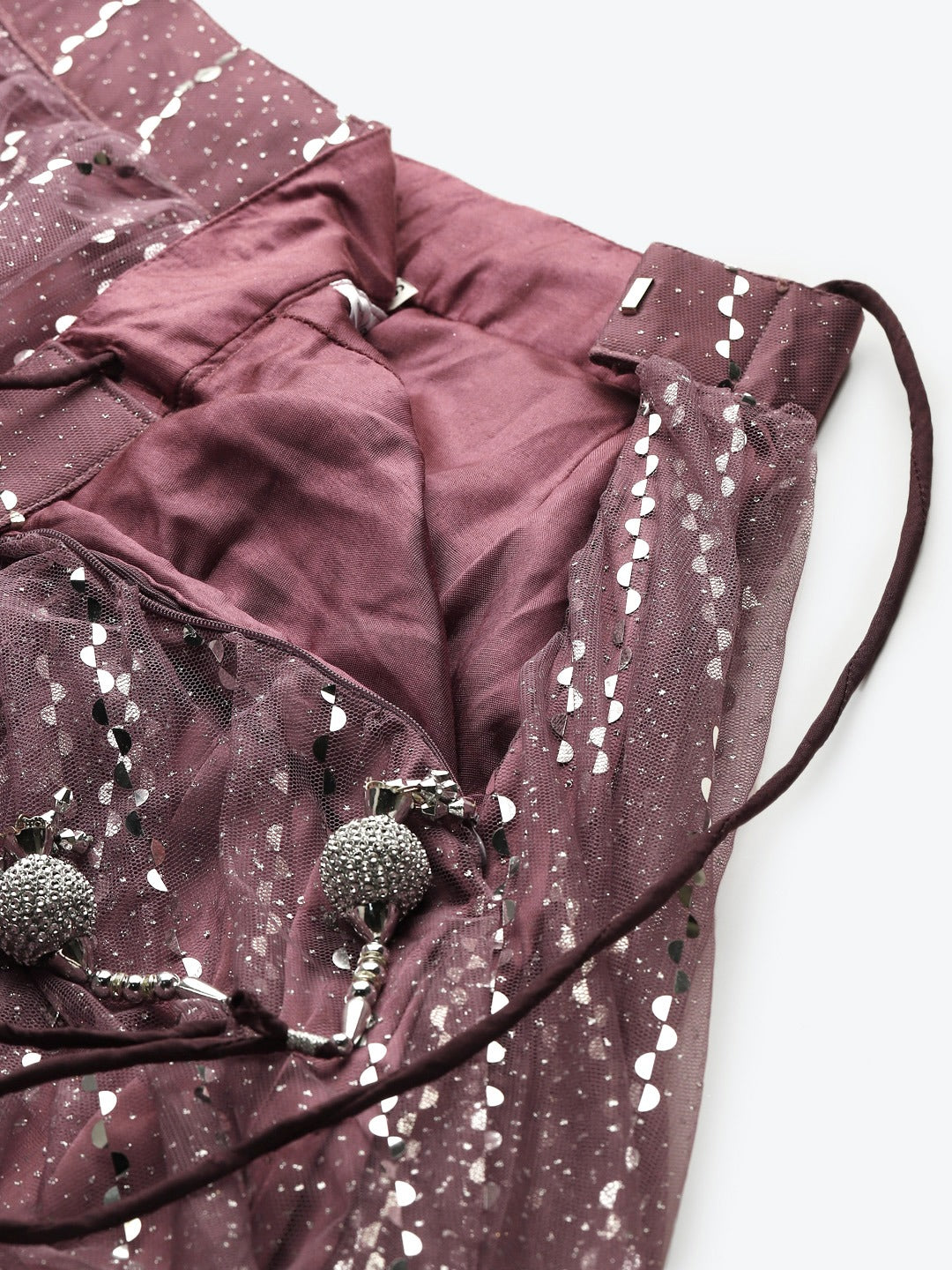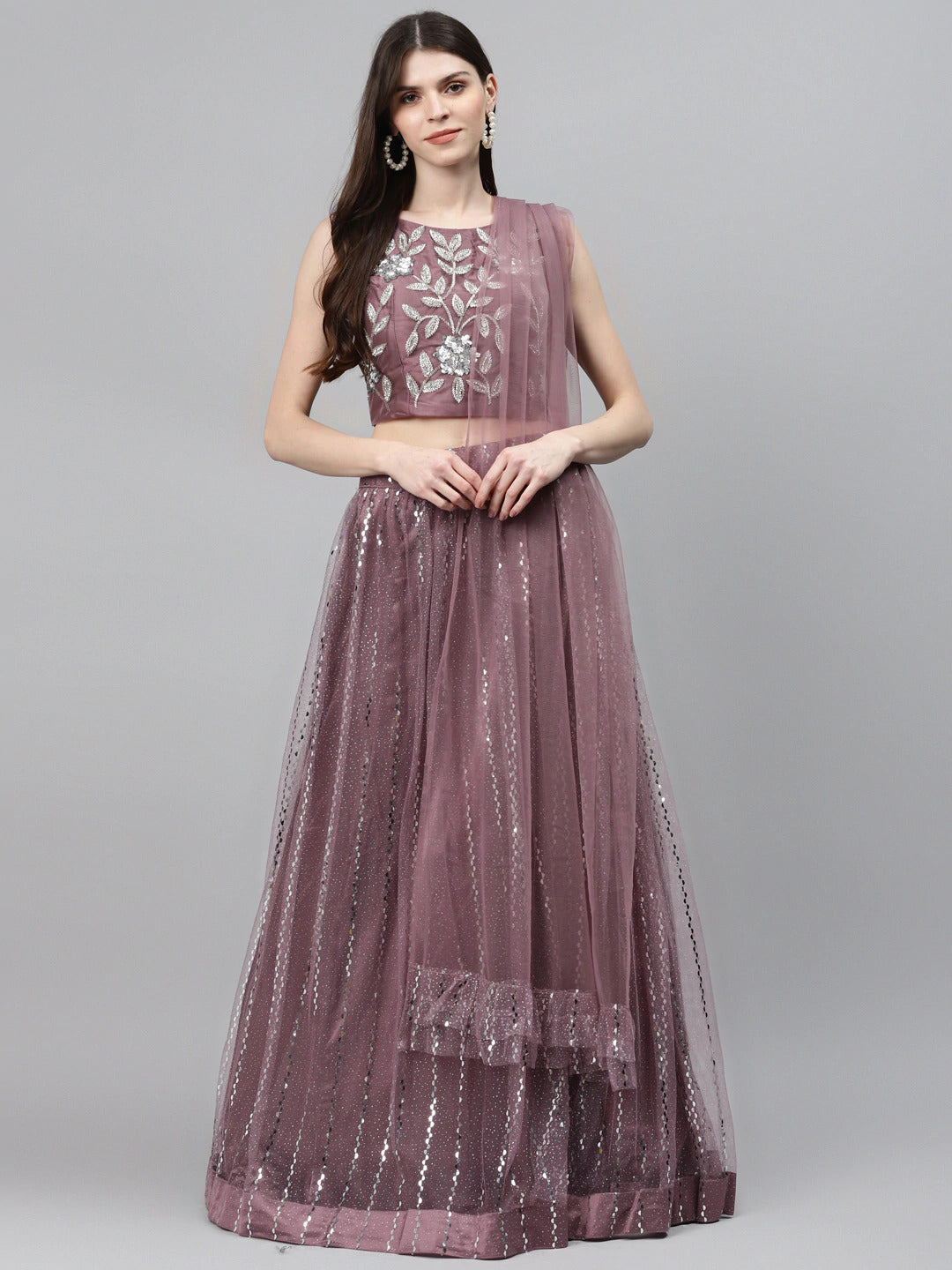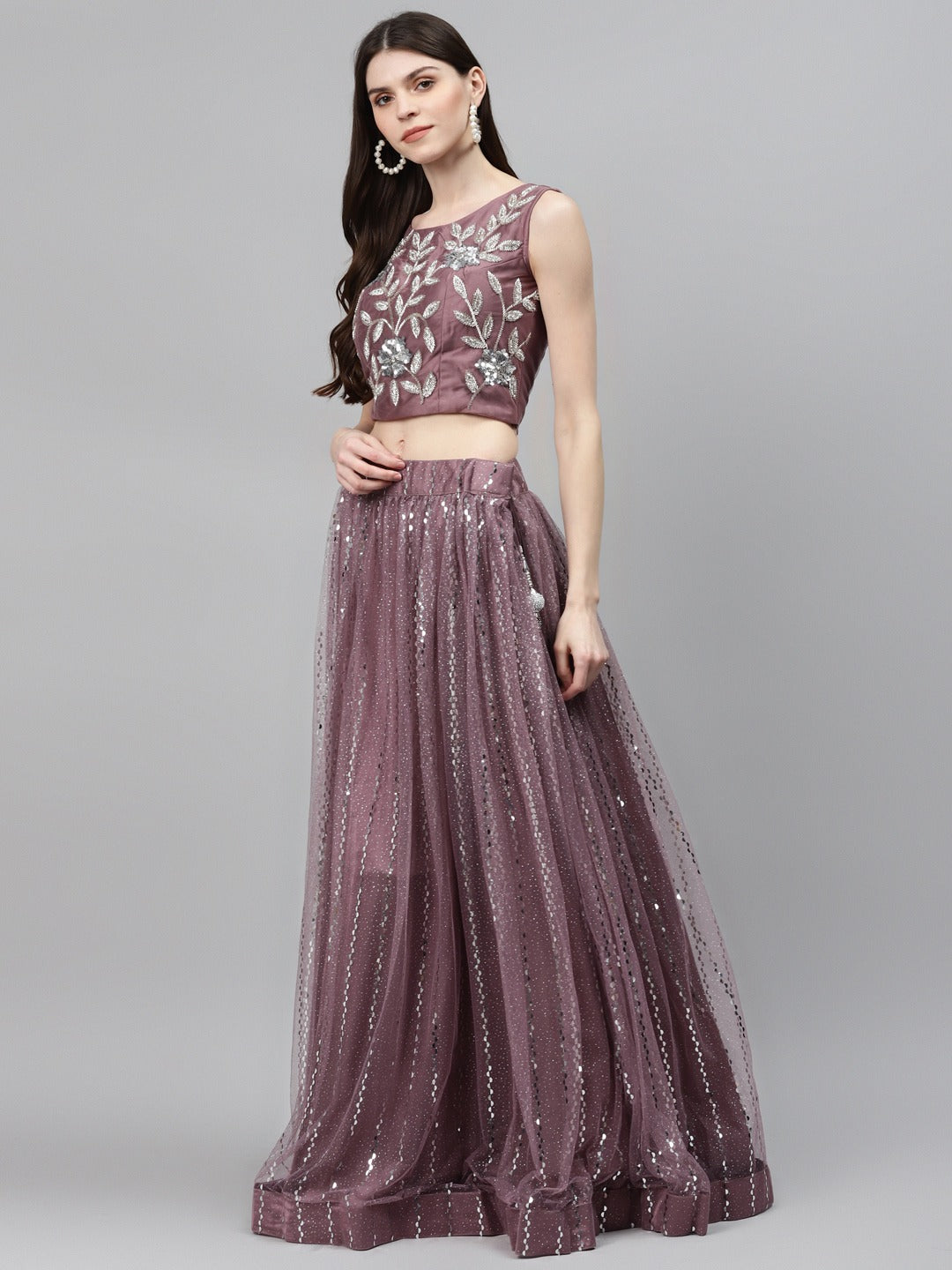 Pastel Mauve Mirror Embellished Lehenga Set with Cut dana Embroidery, Frills & Layering