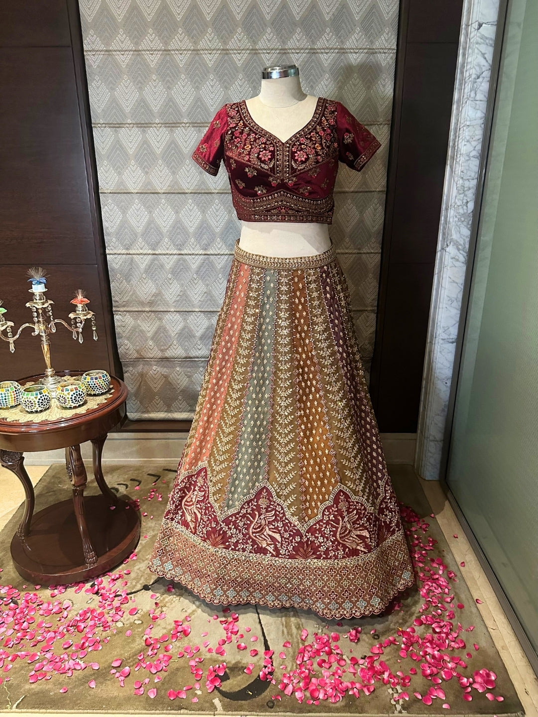A stunning combination of tradition and modern craftsmanship as this lehenga features intricate gold detailing on a rich garnet background.It is designed to make an impact as it is a celebration of meticulous embellishments and vibrant hues.
