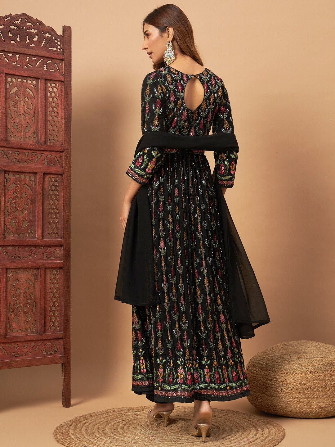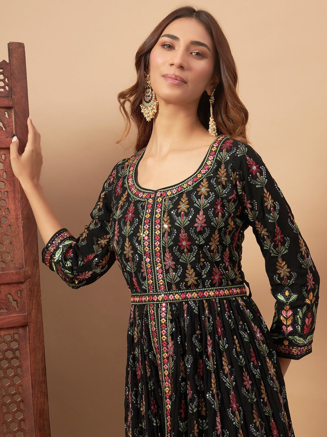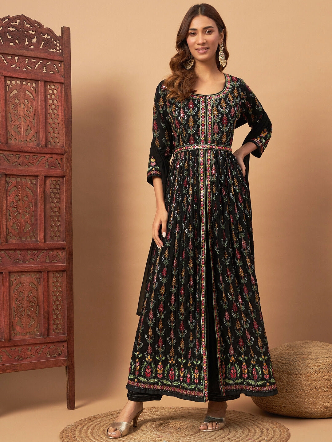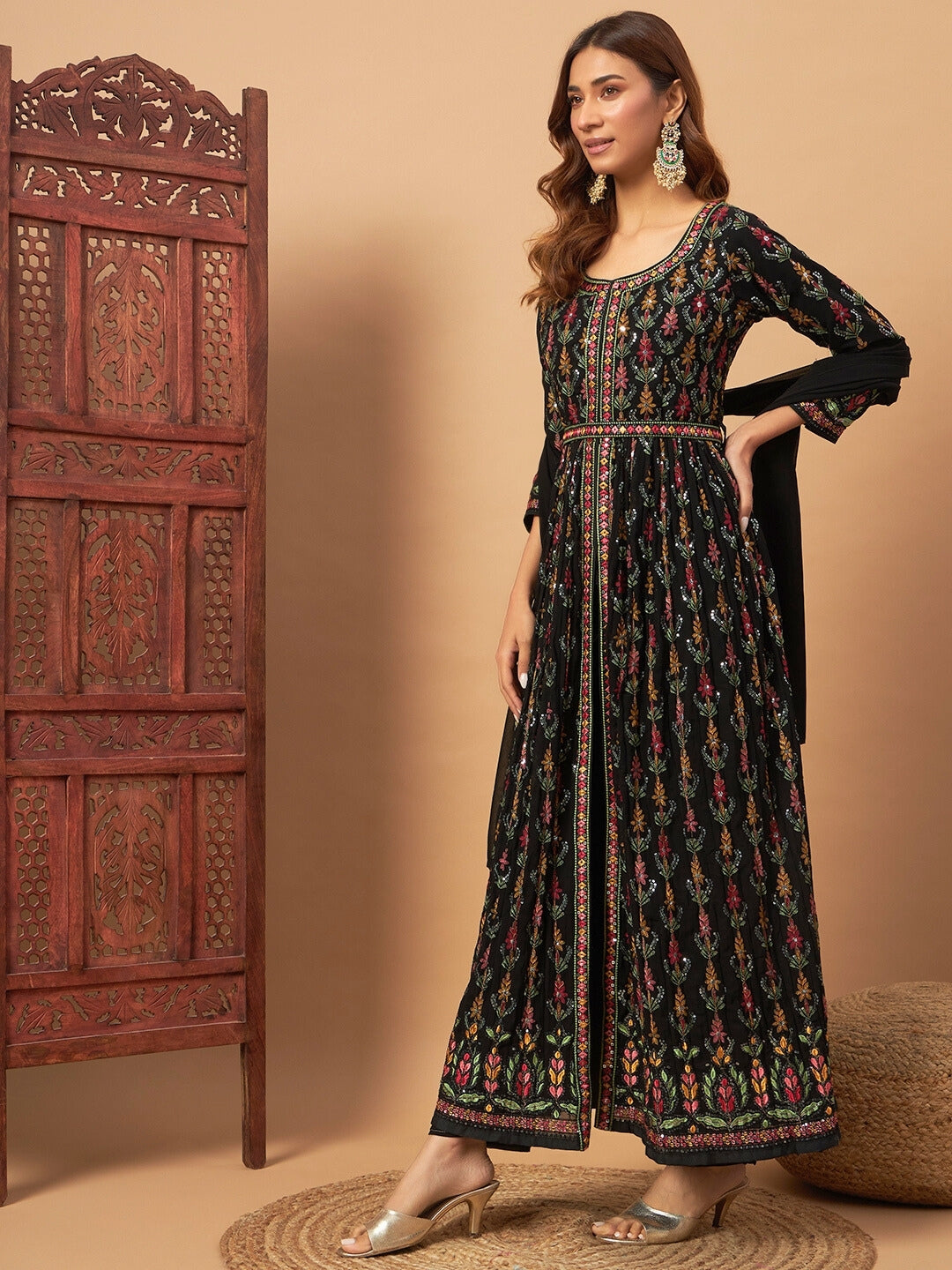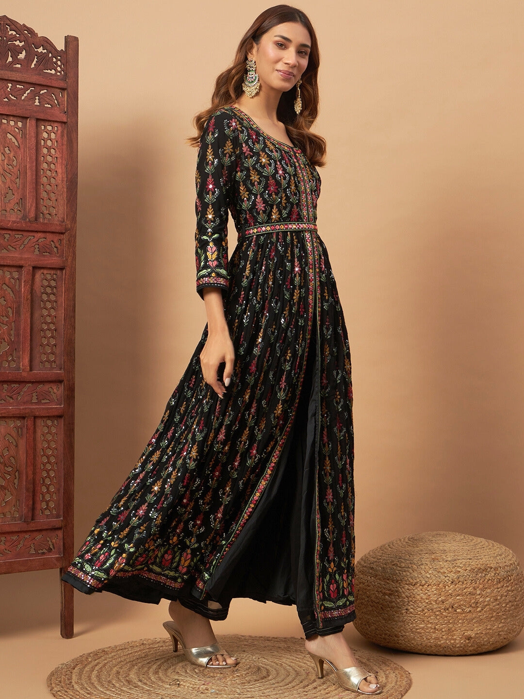 Front Slit Georgette Long Kurta Set with Multicolor Resham Thread Embroidery and Belt