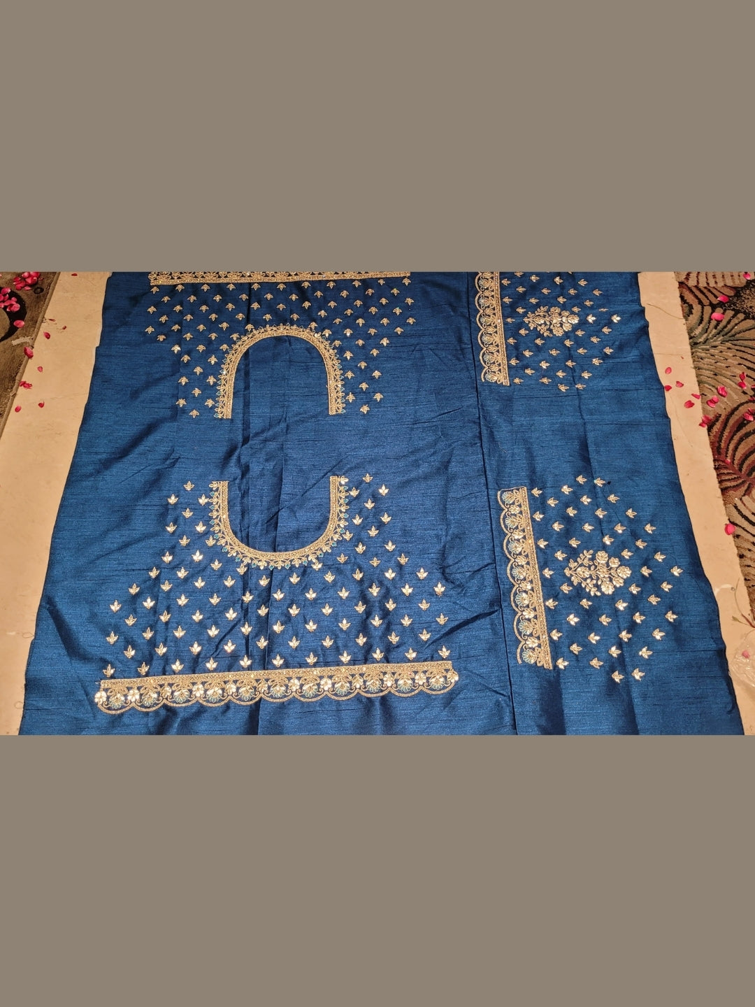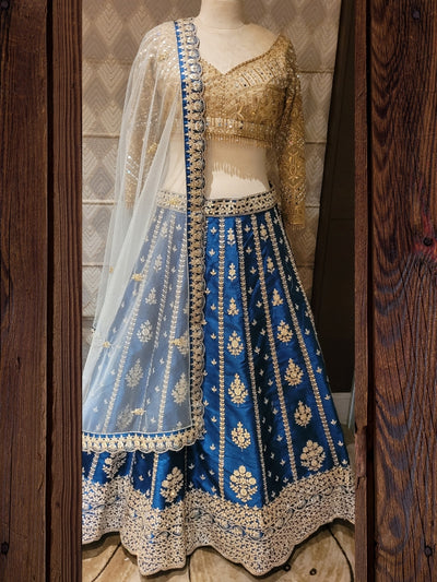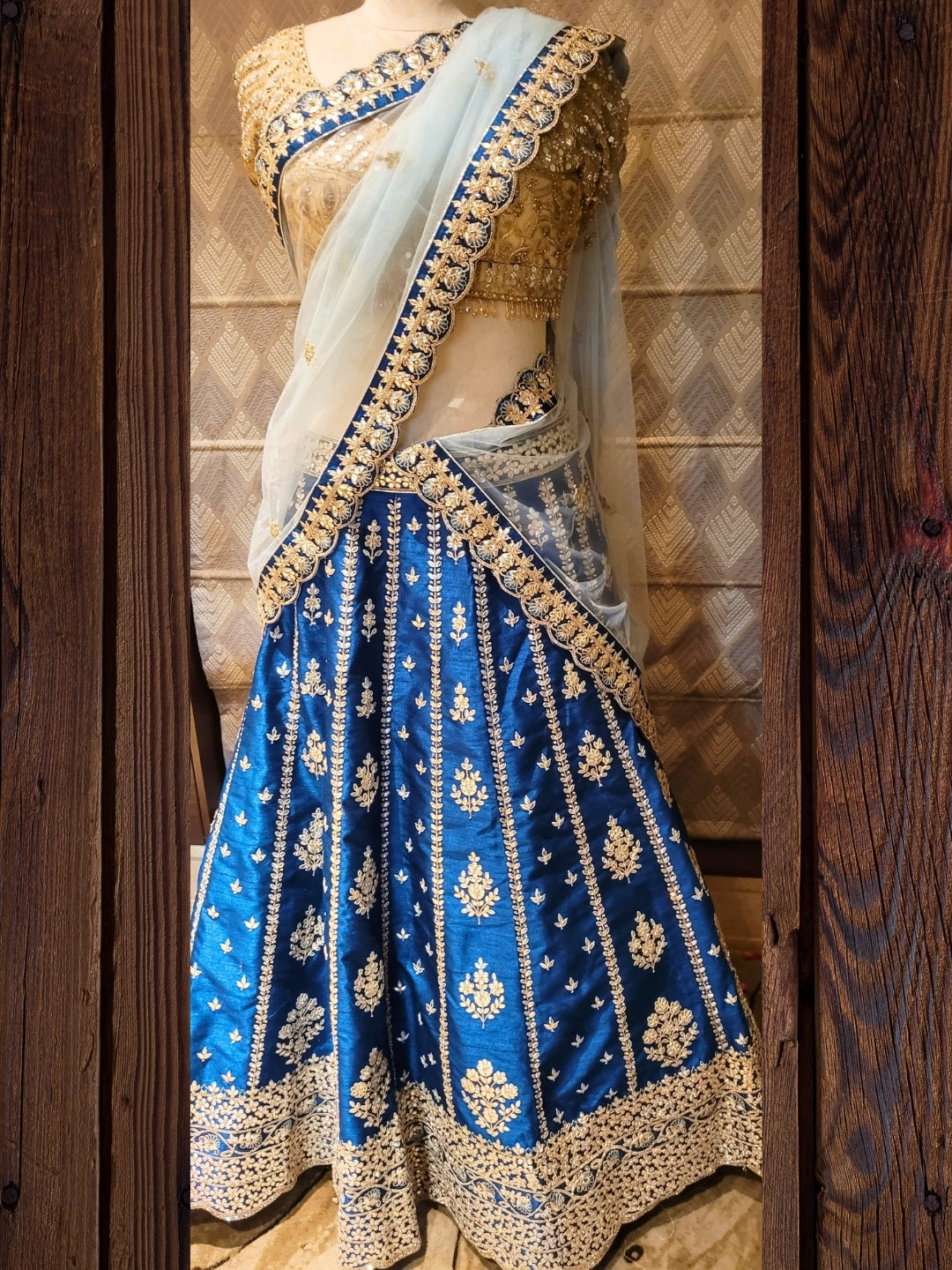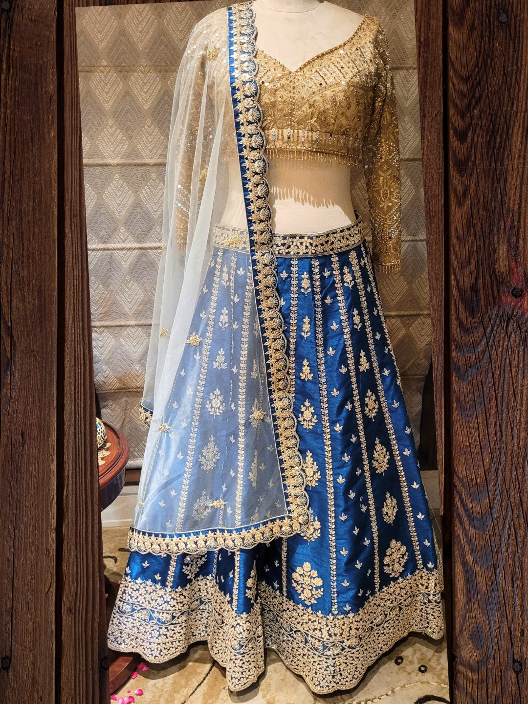 This lehenga set exudes a regal aura with its deep sapphire blue skirt and opulent gold blouse which is meticulously crafted for a grand ceremonial look.