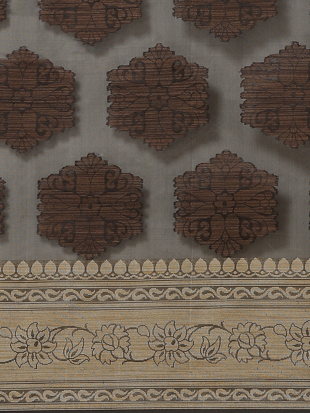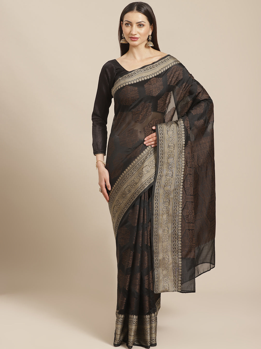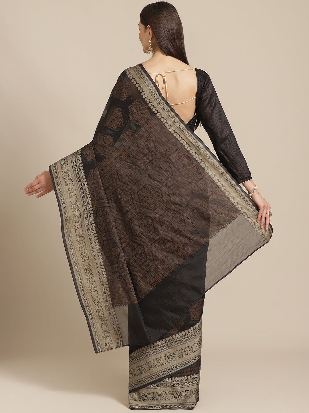 Black Banarasi Silk Self-Embossed Saree with Ethnic FLoral Motifs in Oxidised Zari