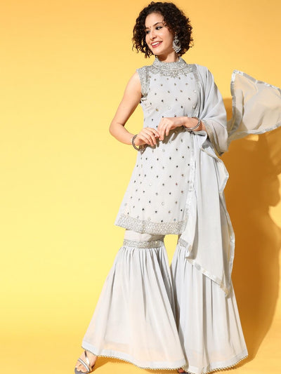 Grey Mirror Embellished Halter Neck Kurta Sharara Set