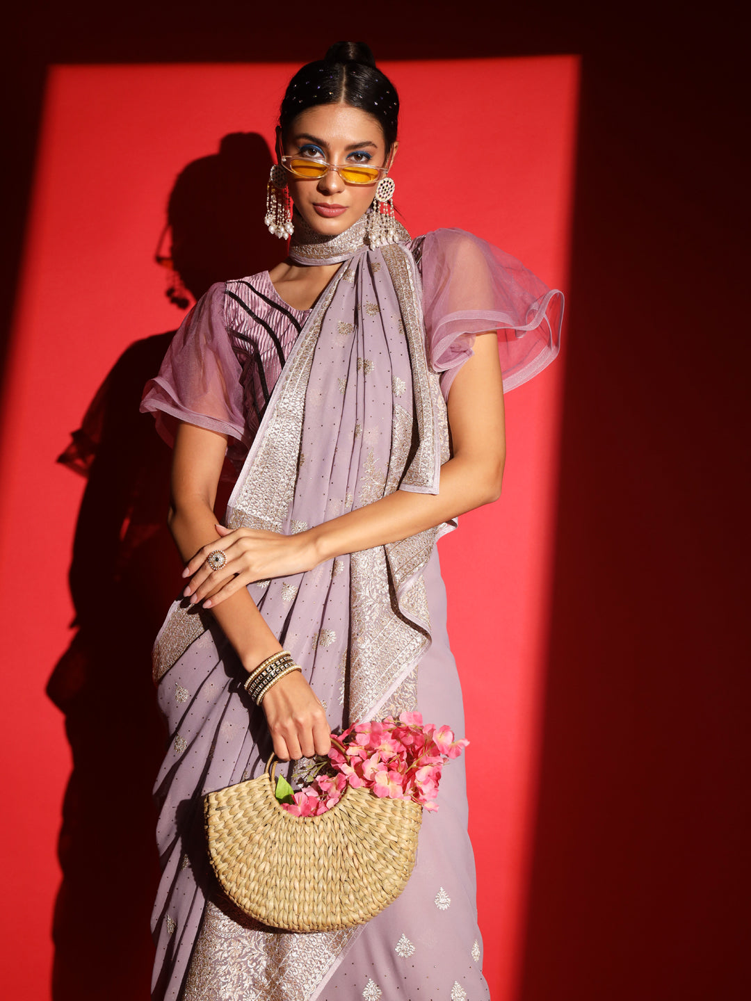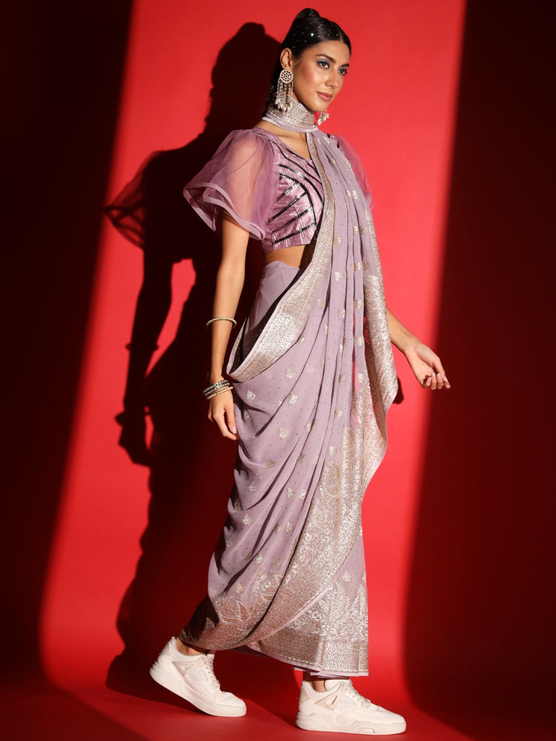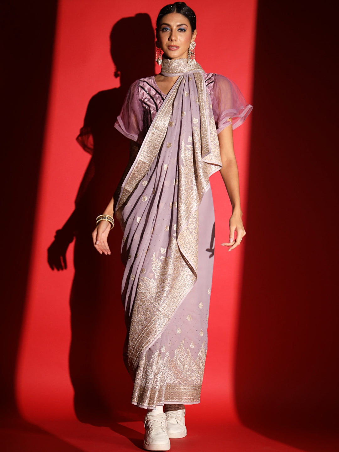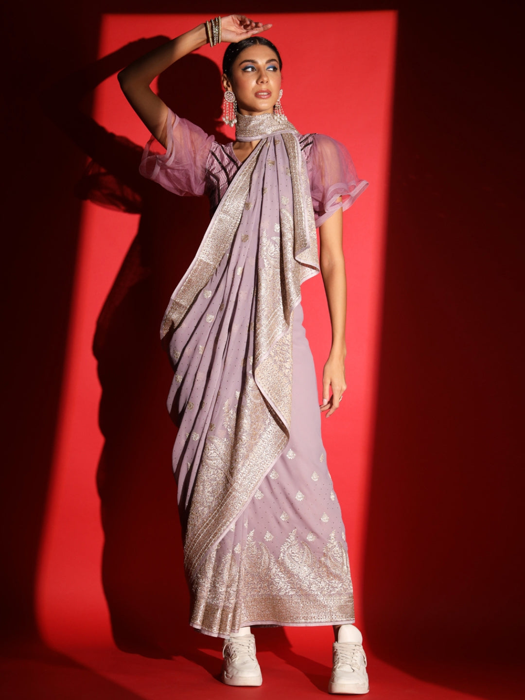Pastel Zari Embroidered & Crystal Studded Georgette Party Wear Saree