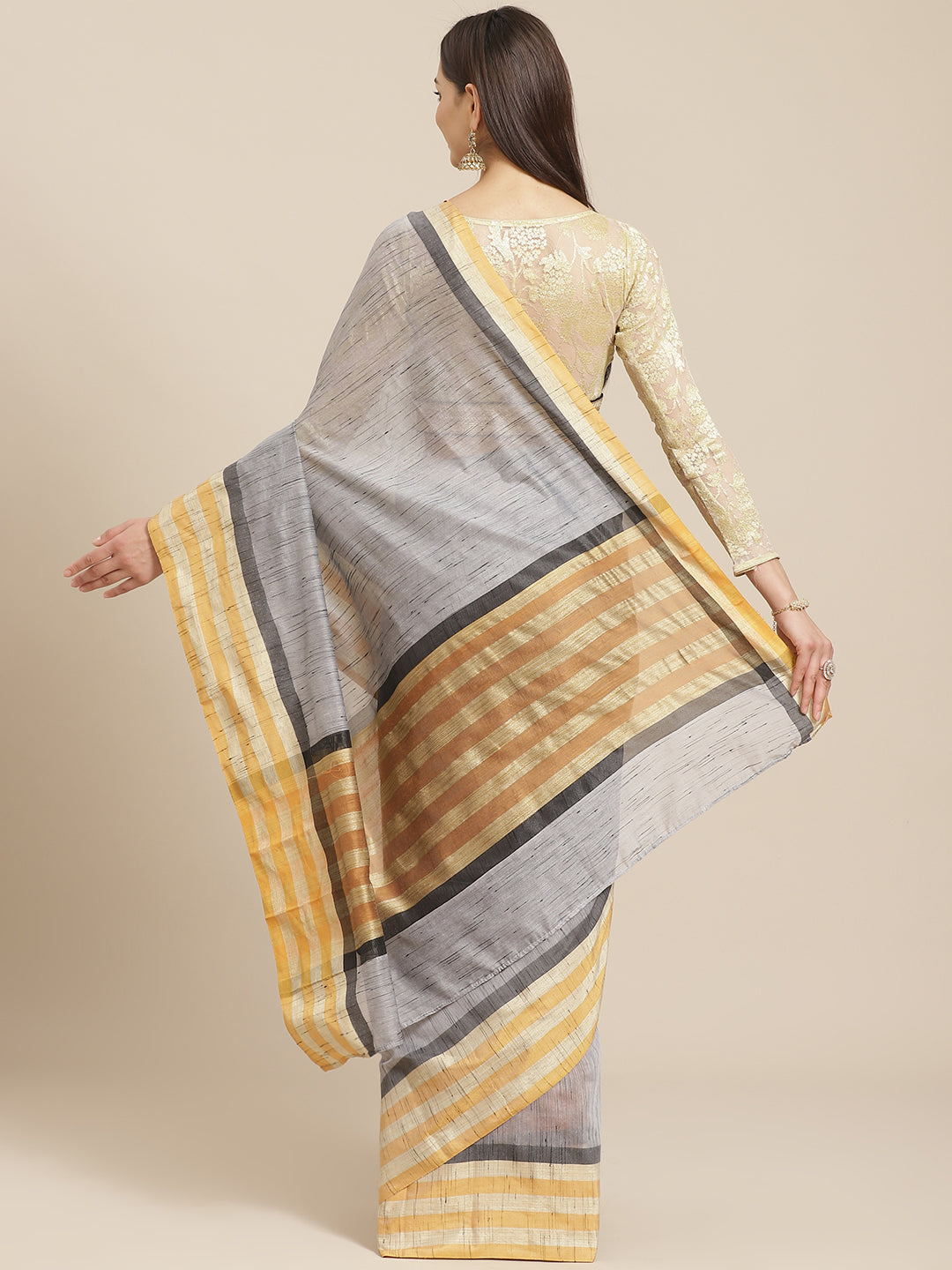 Chhabra 555 Grey Mangalagiri Jute Silk Saree with Colorblocked Contrast Color Striped Border & Pallu